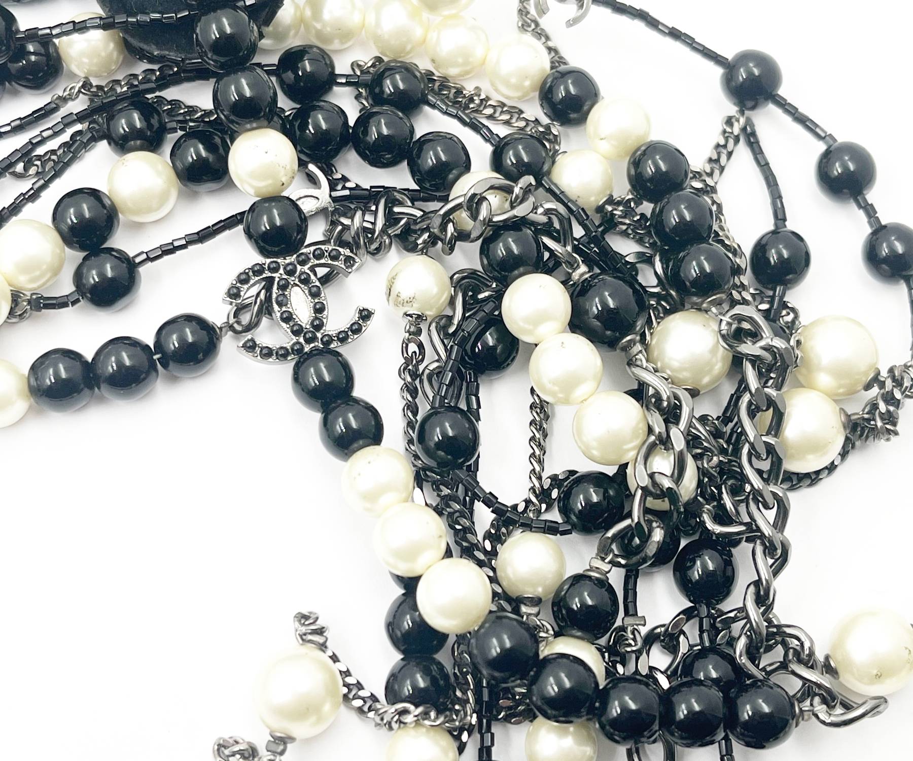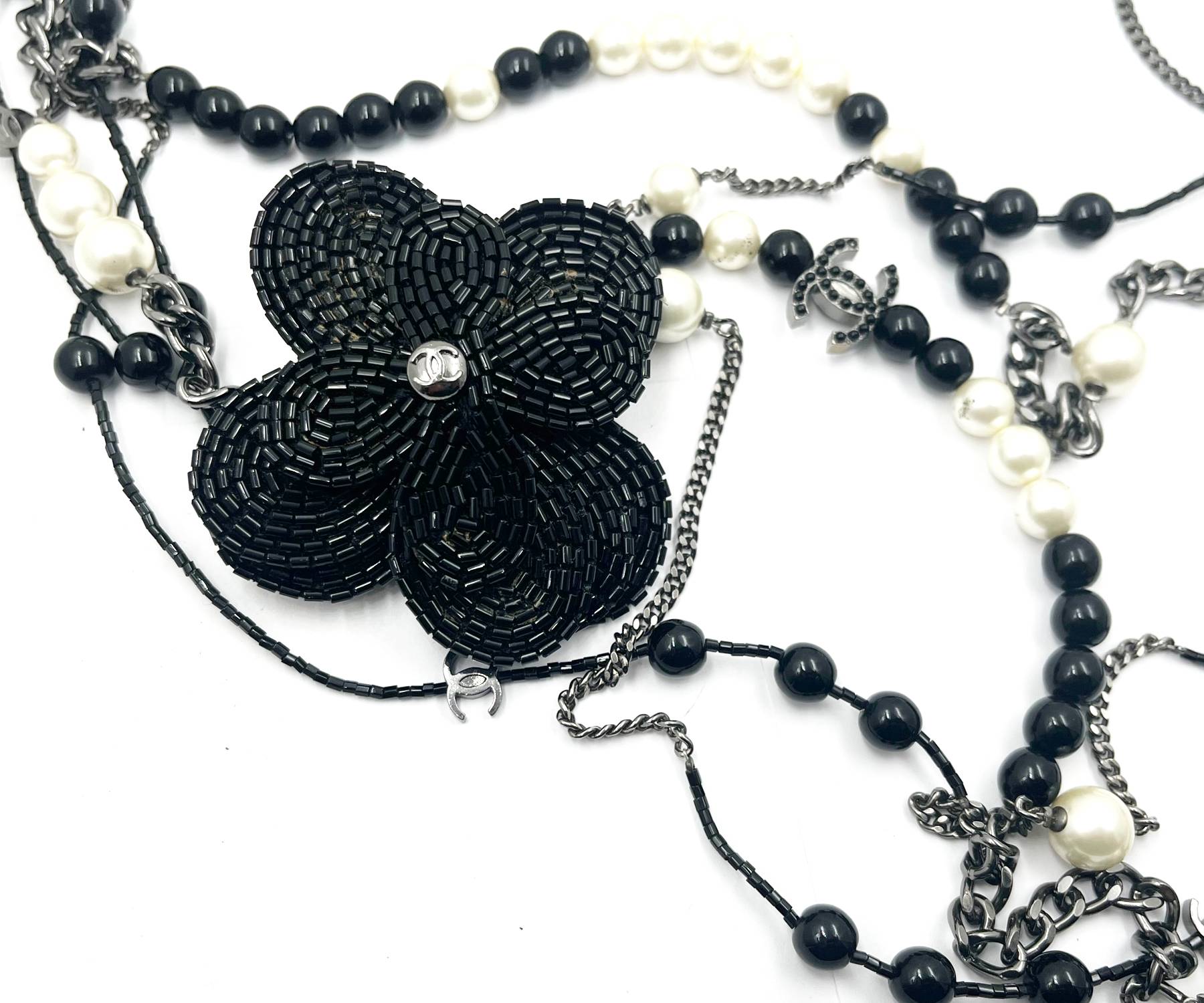 Chanel Black CC Beaded Flower Pin Black Bead Pearl 5 Strand Necklace