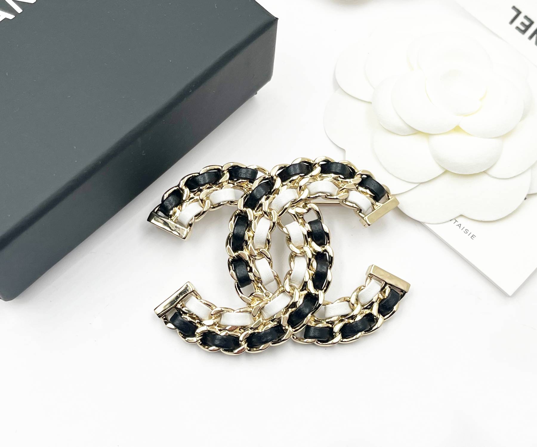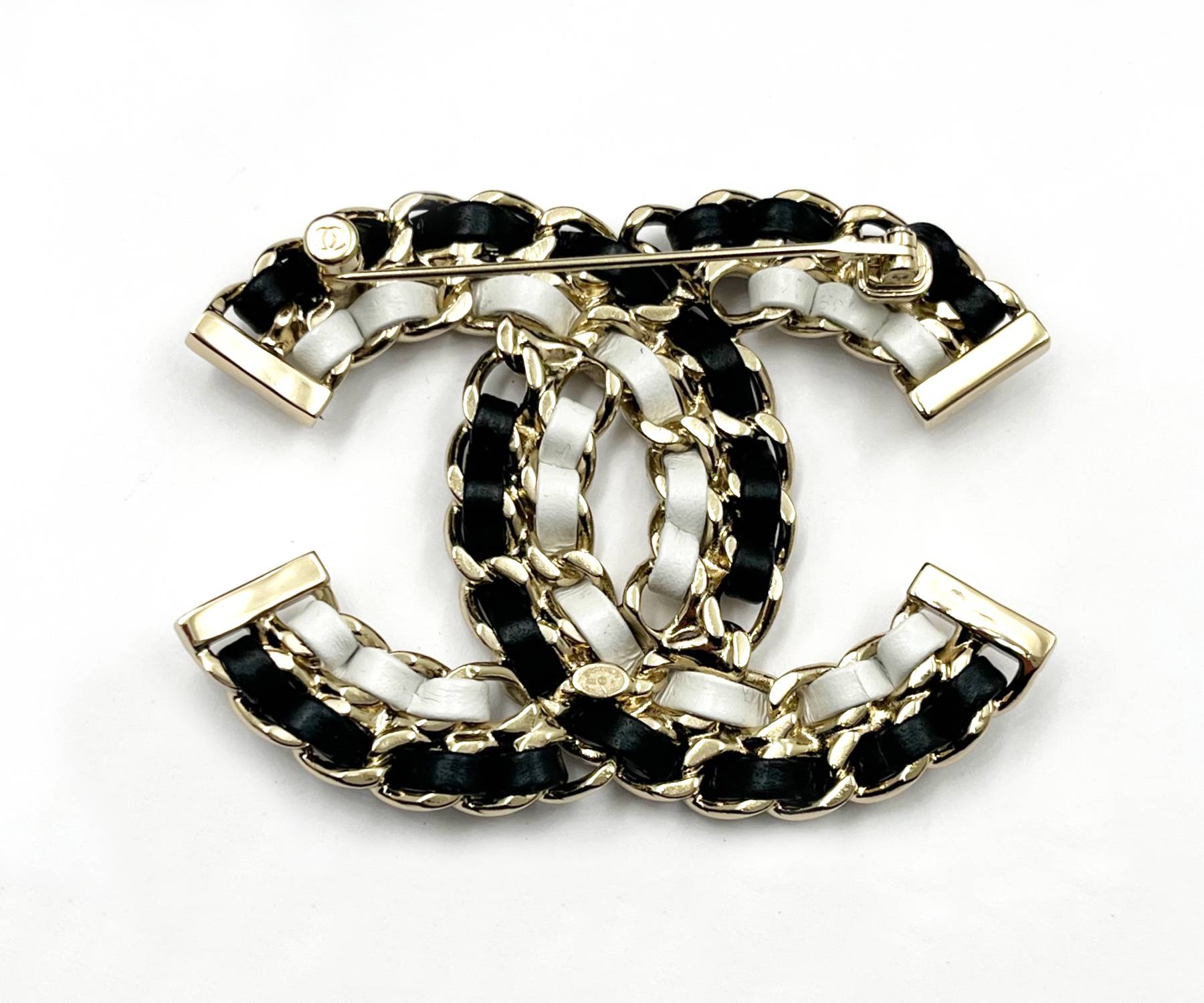 Chanel Brand New Gold CC Black White Leather Chain Large Brooch