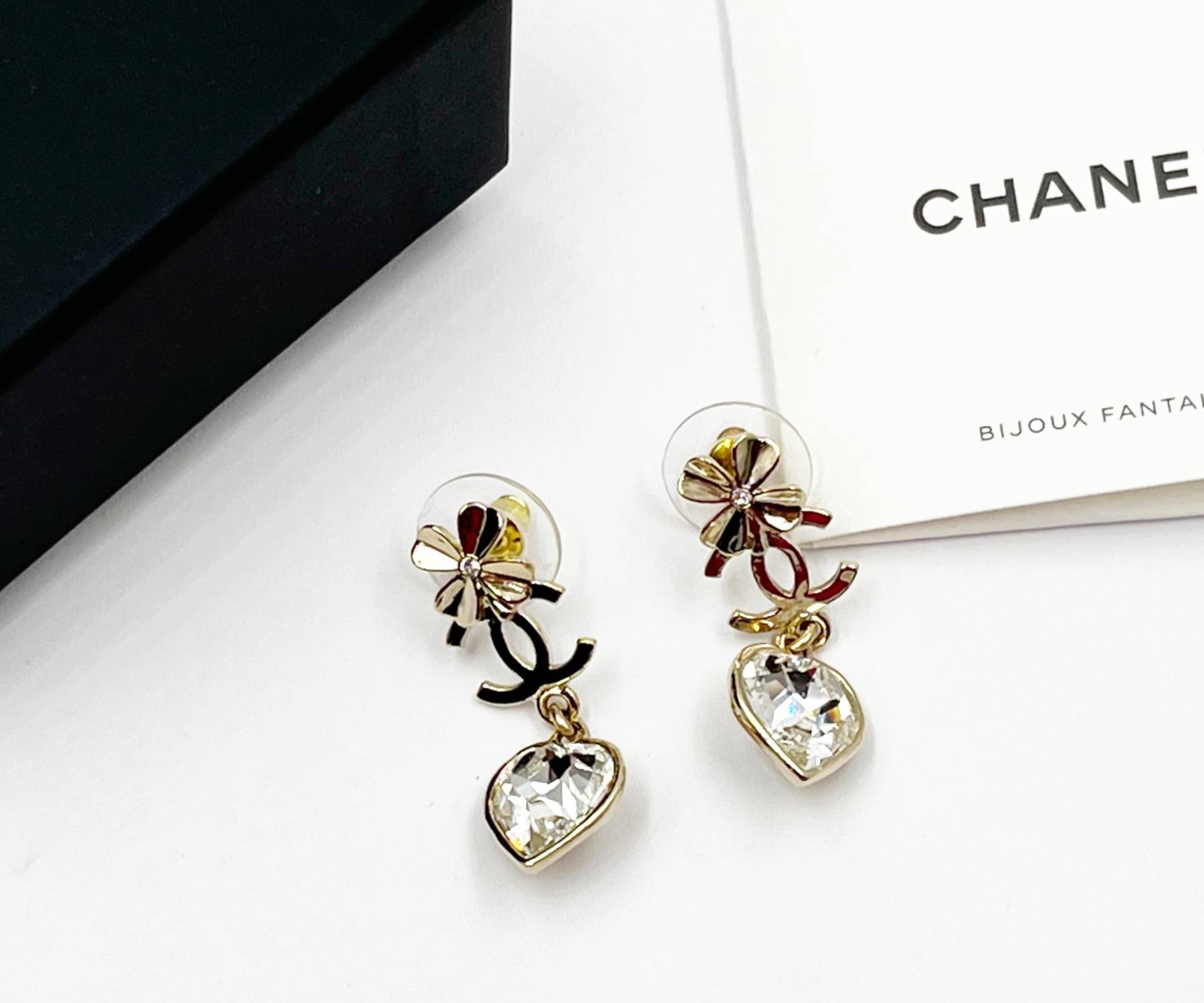 Chanel Brand New Gold CC Clover CC Heart Crystal Dangle Piercing Earrings