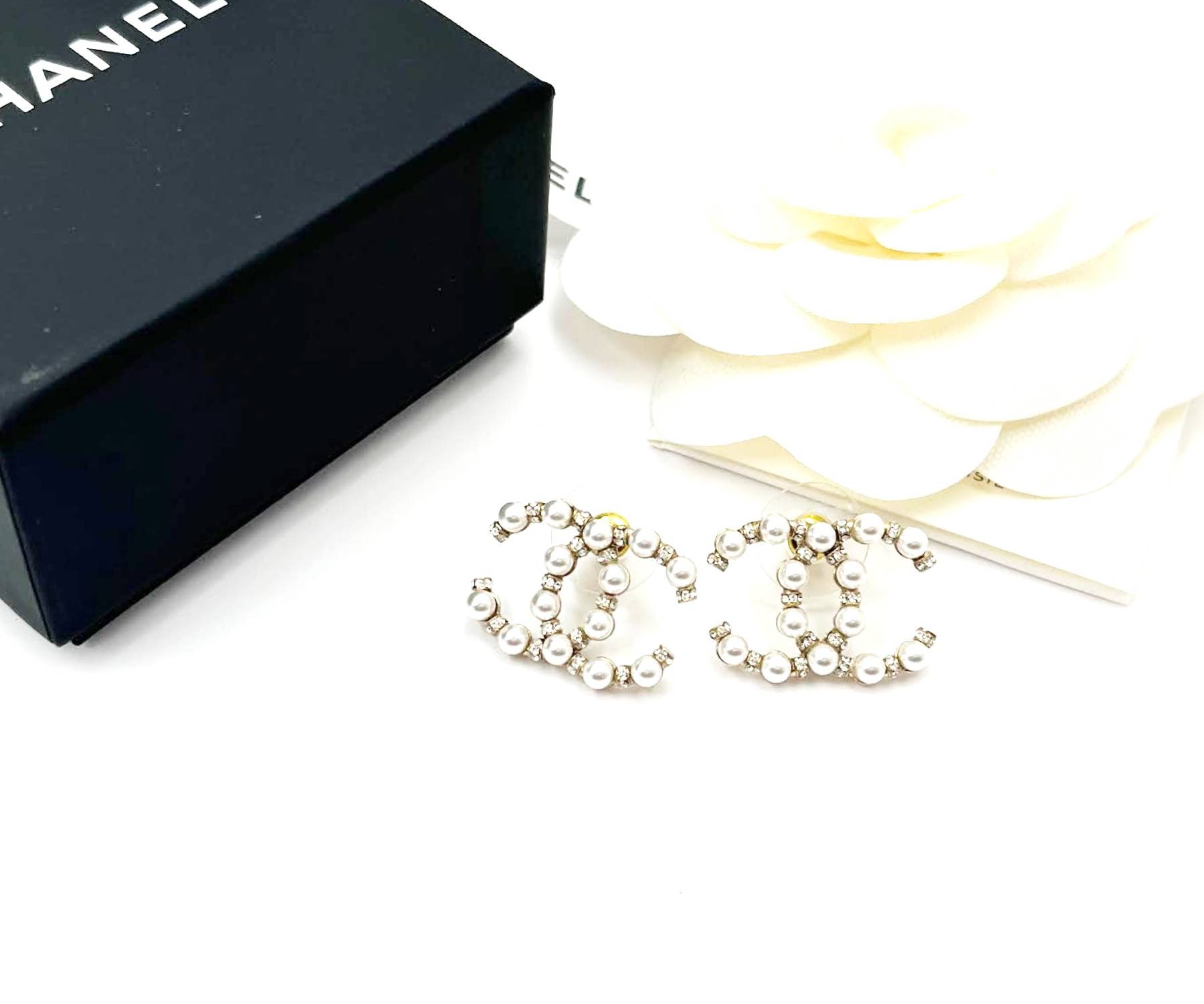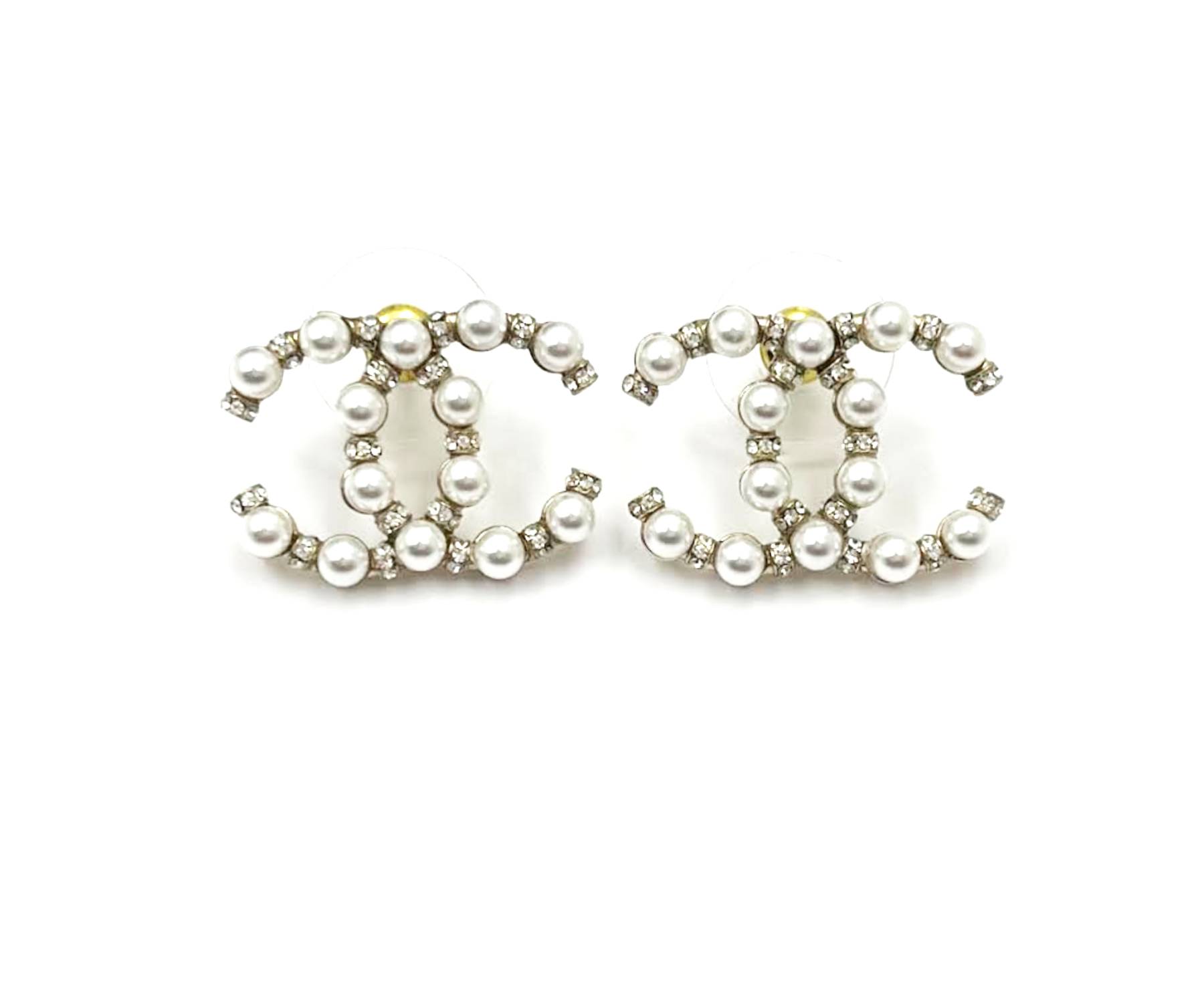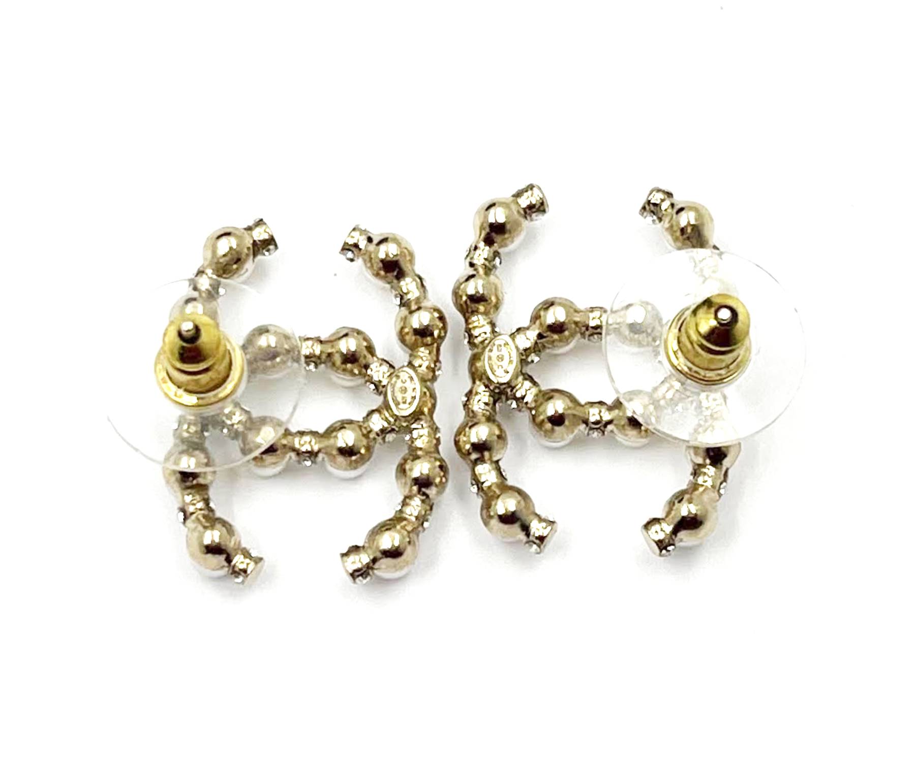 Chanel Brand New Gold CC Pearl Silver Crystal Large Piercing Earrings