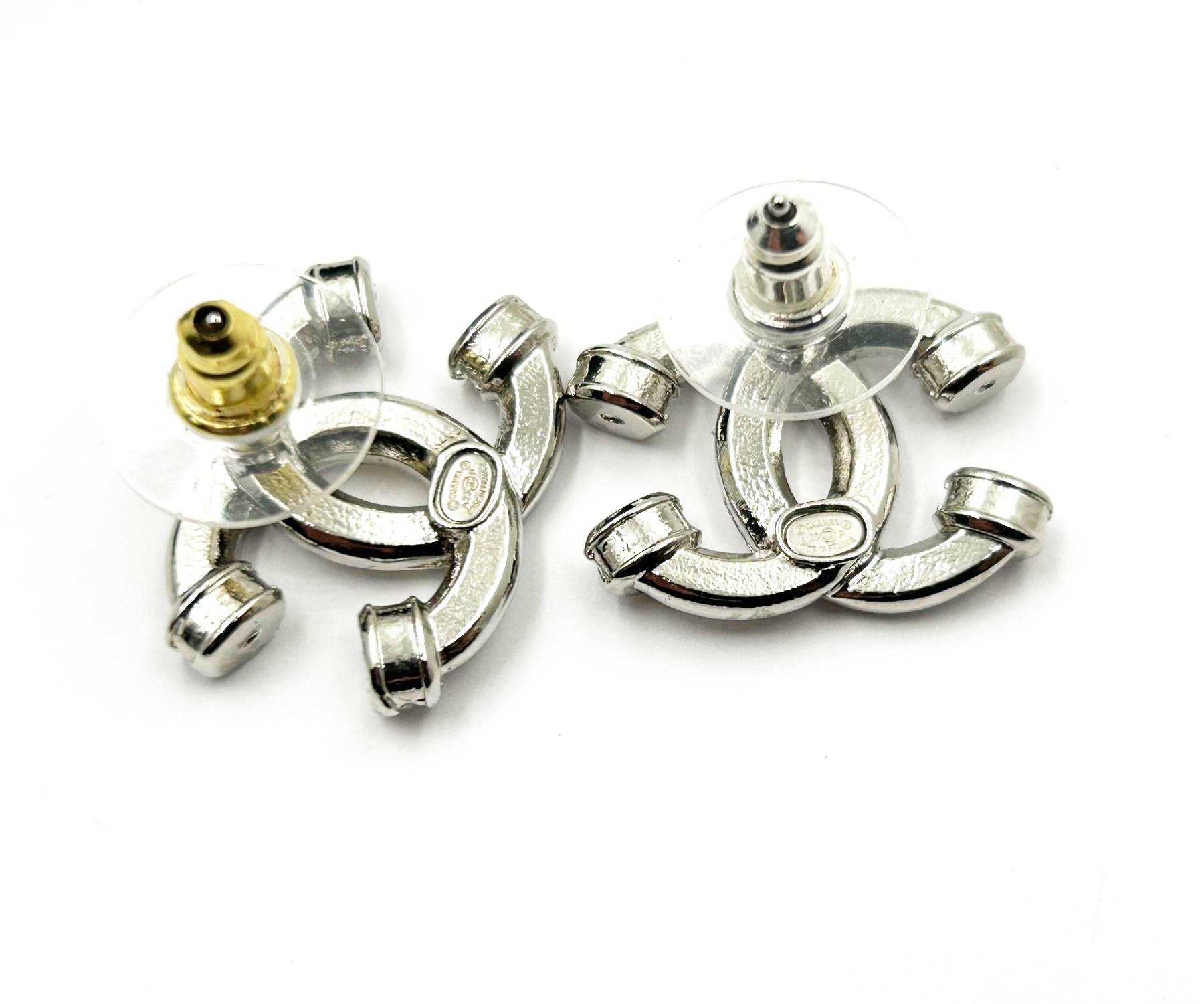 Chanel Brand New Silver CC Pillar Crystal Piercing Earrings