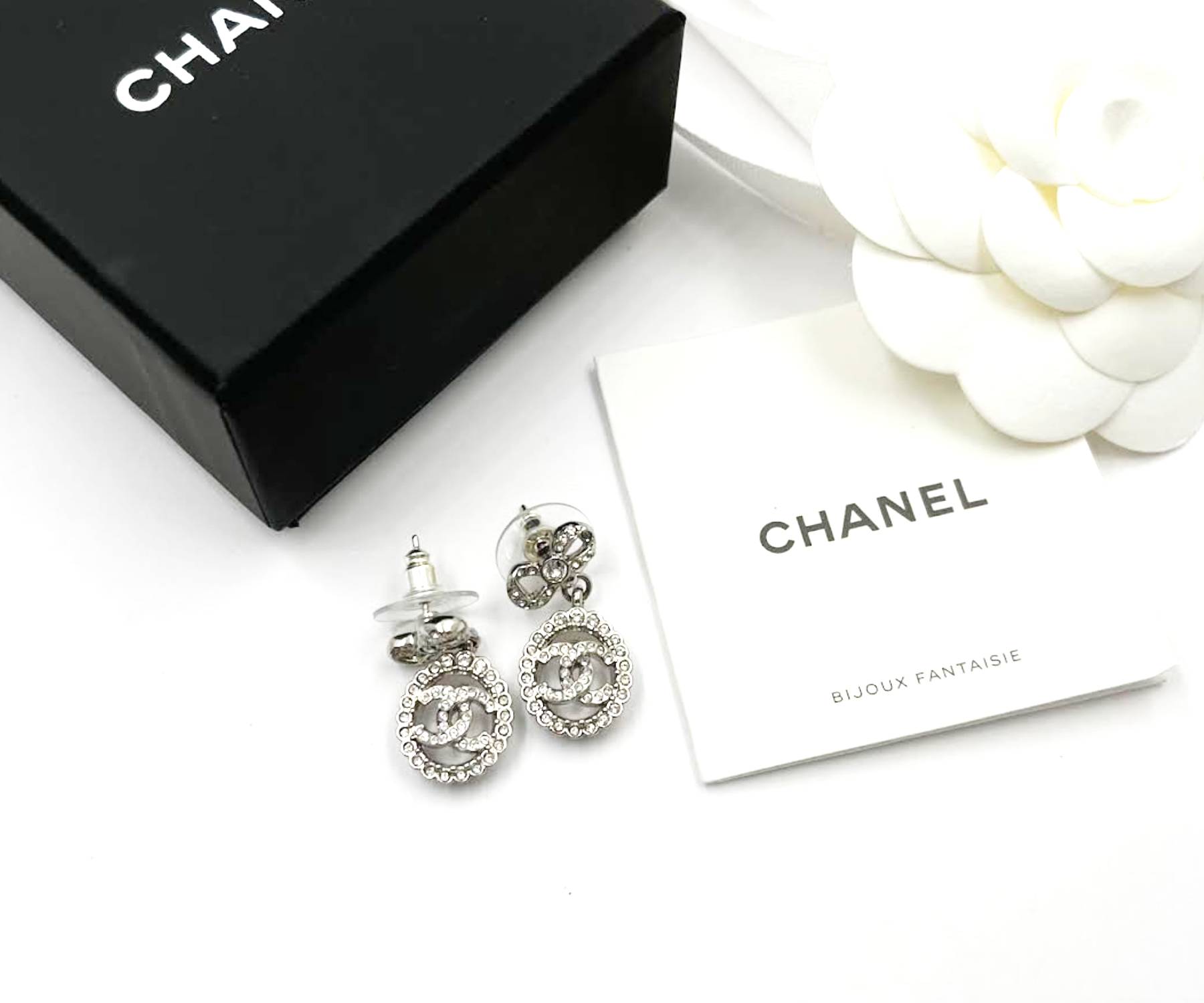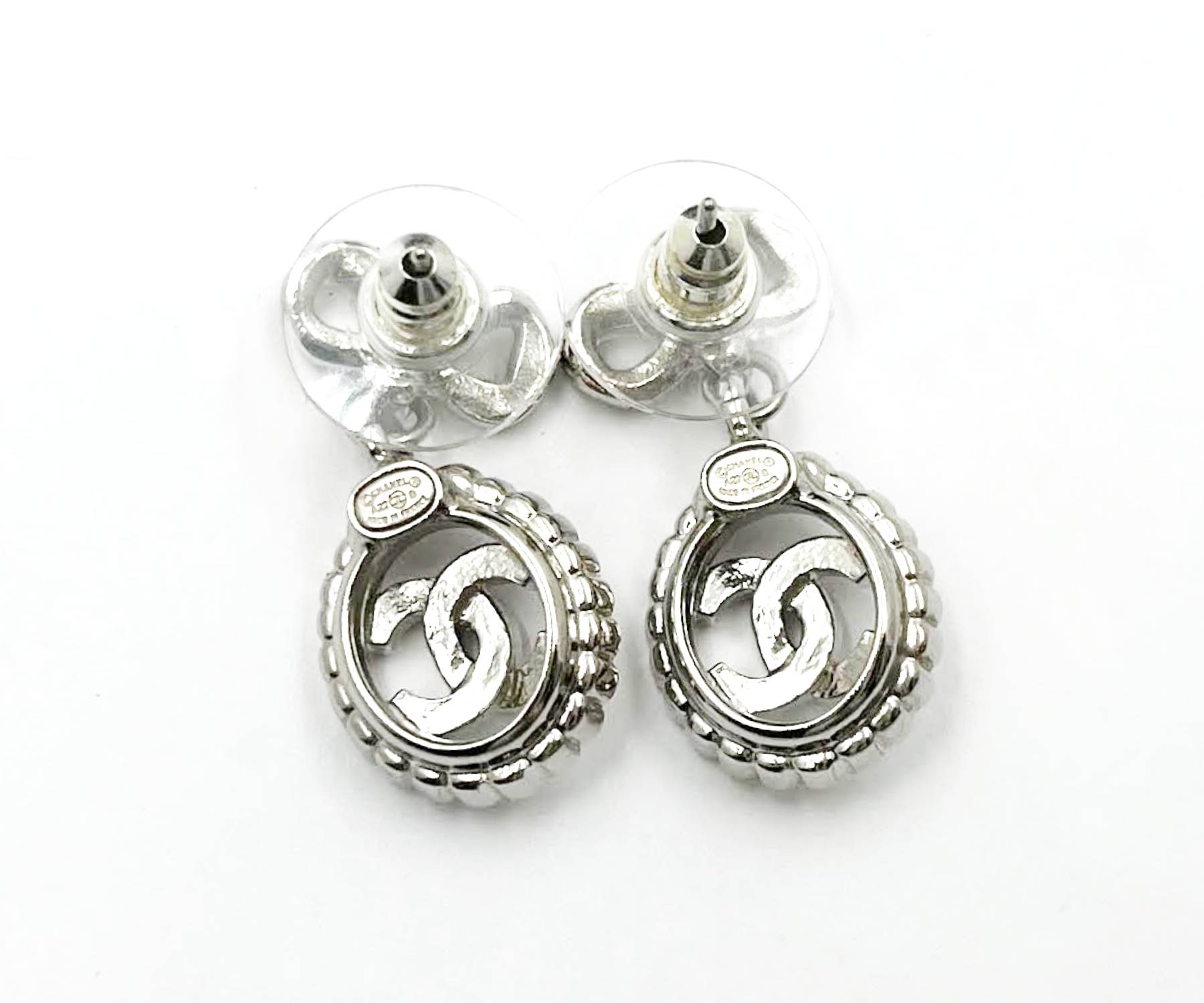 Chanel Brand New Silver Ribbon Bow CC Oval Dangle Small Piercing Earrings