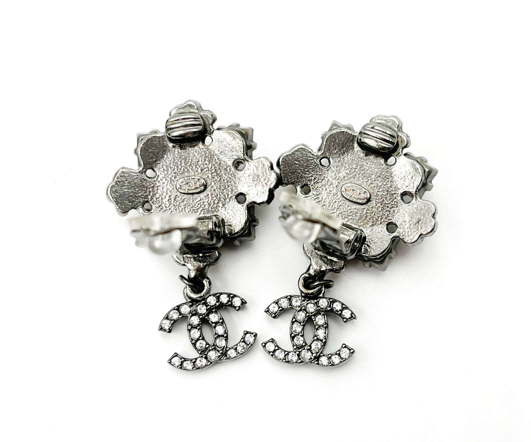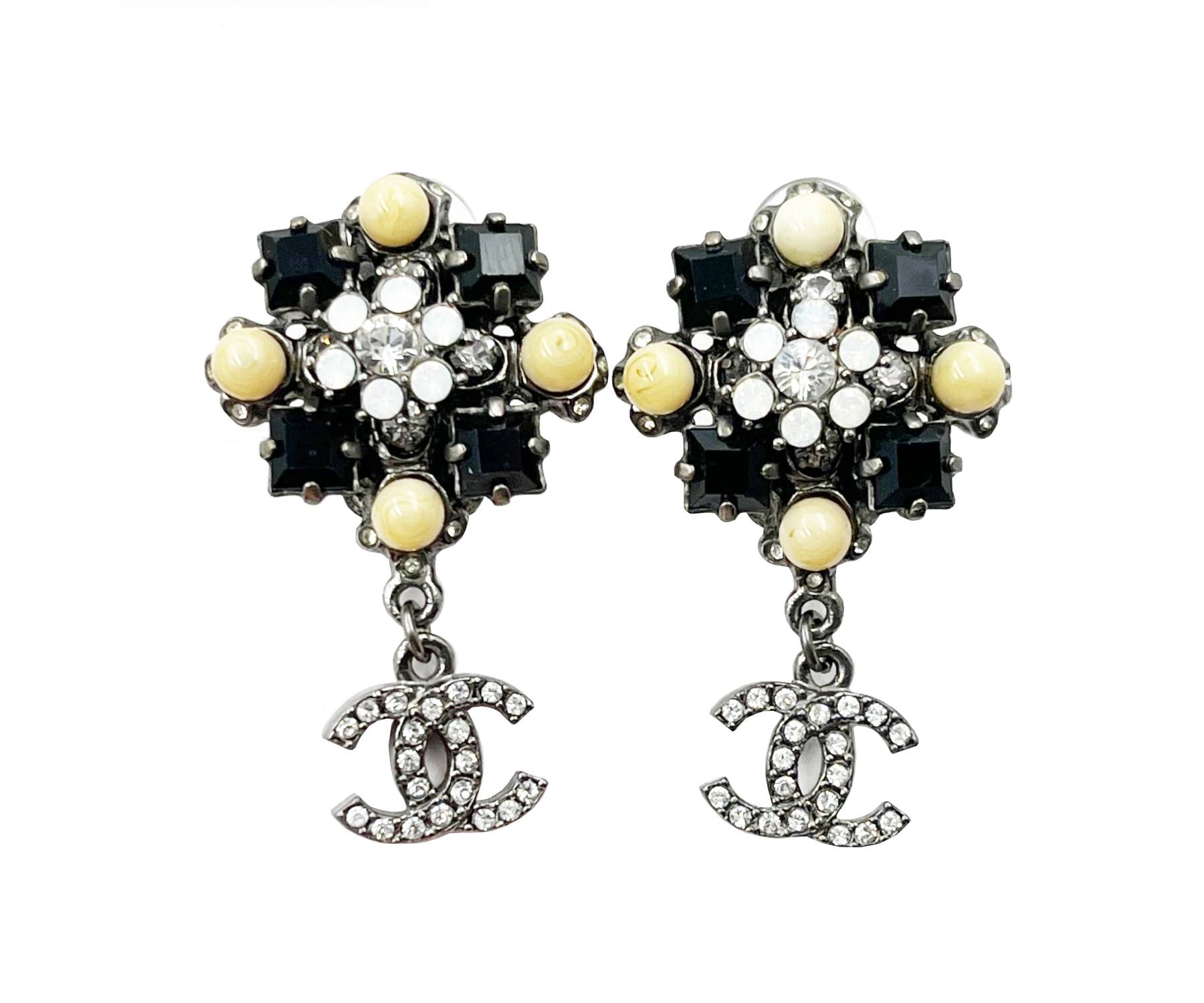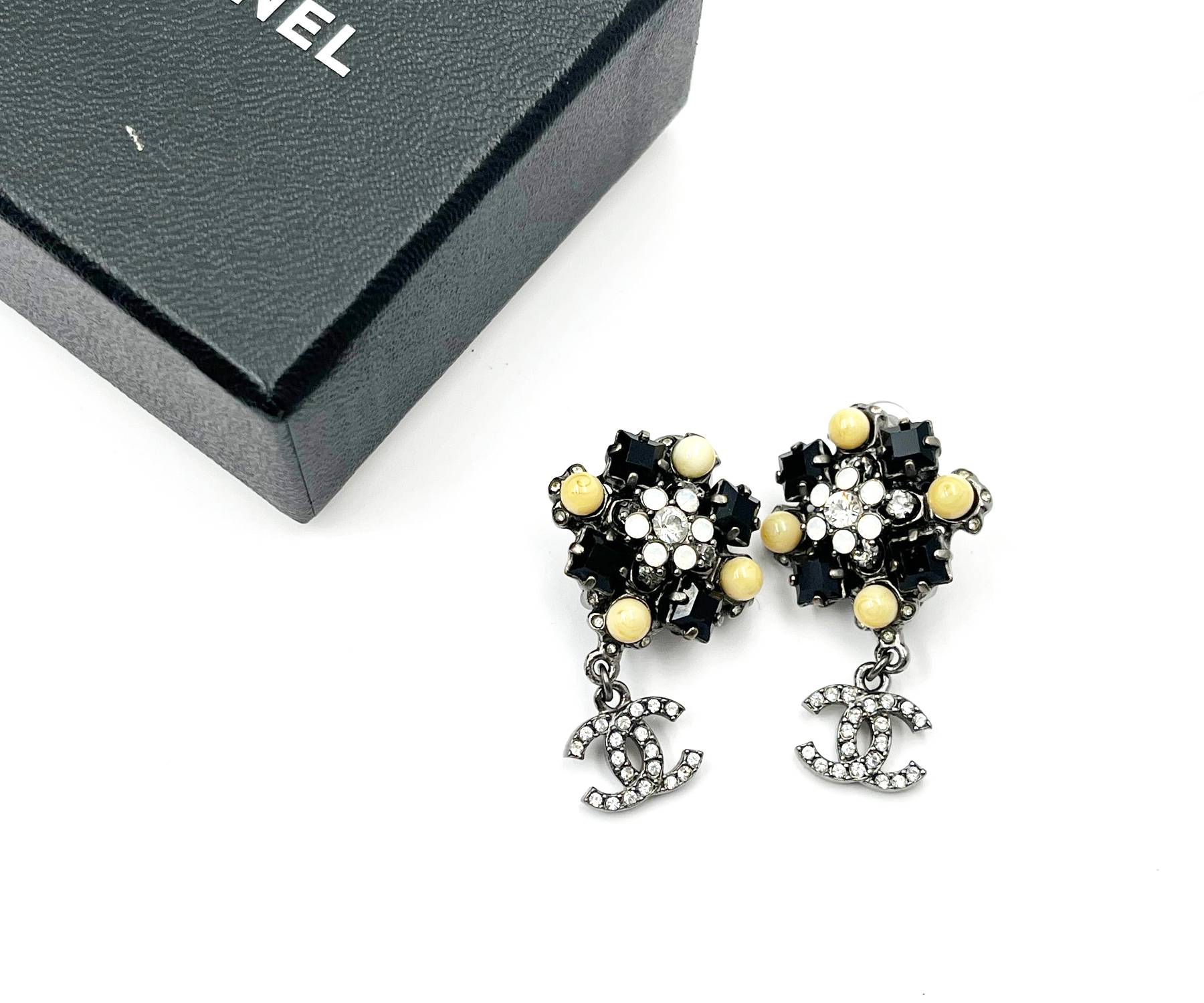 Chanel Brown Bead Black Square Crystal Opal Flower CC Dangle Clip on Earrings