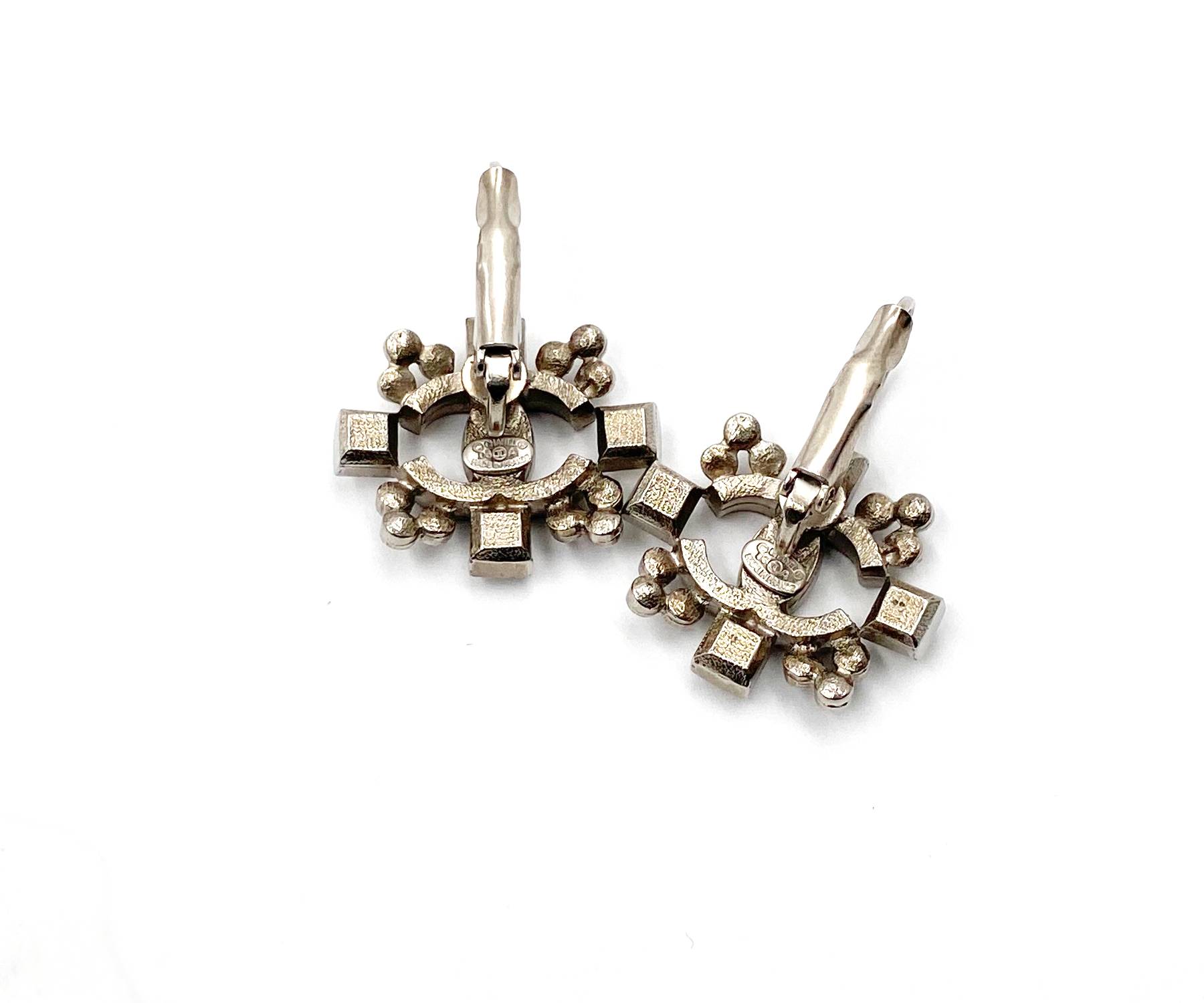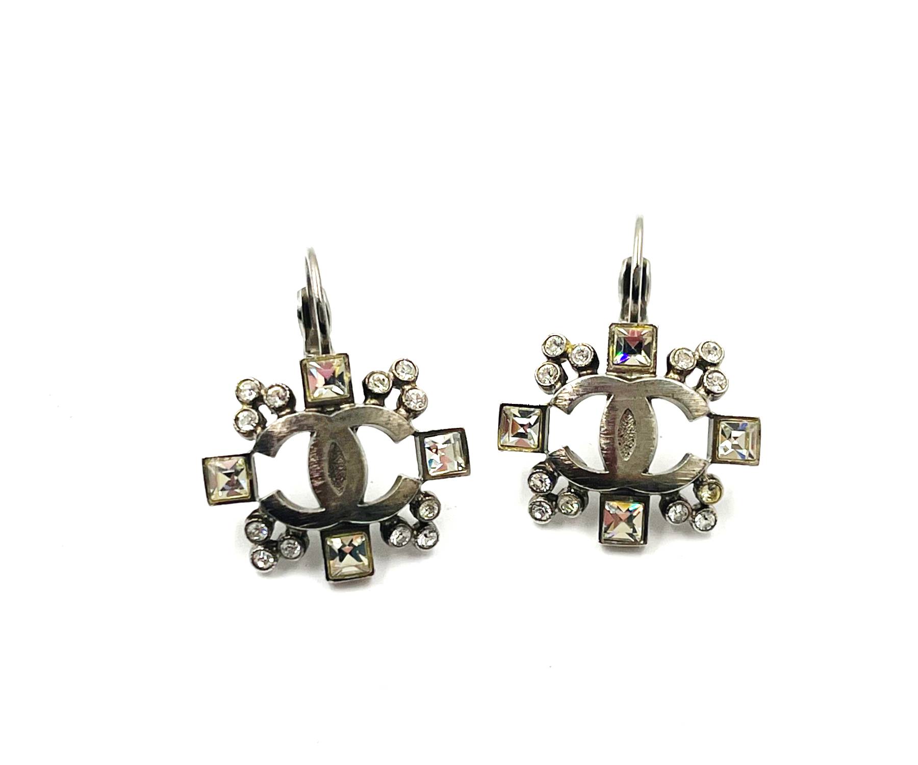 Chanel Classic Silver CC Geo Crystal Lever Back Earrings