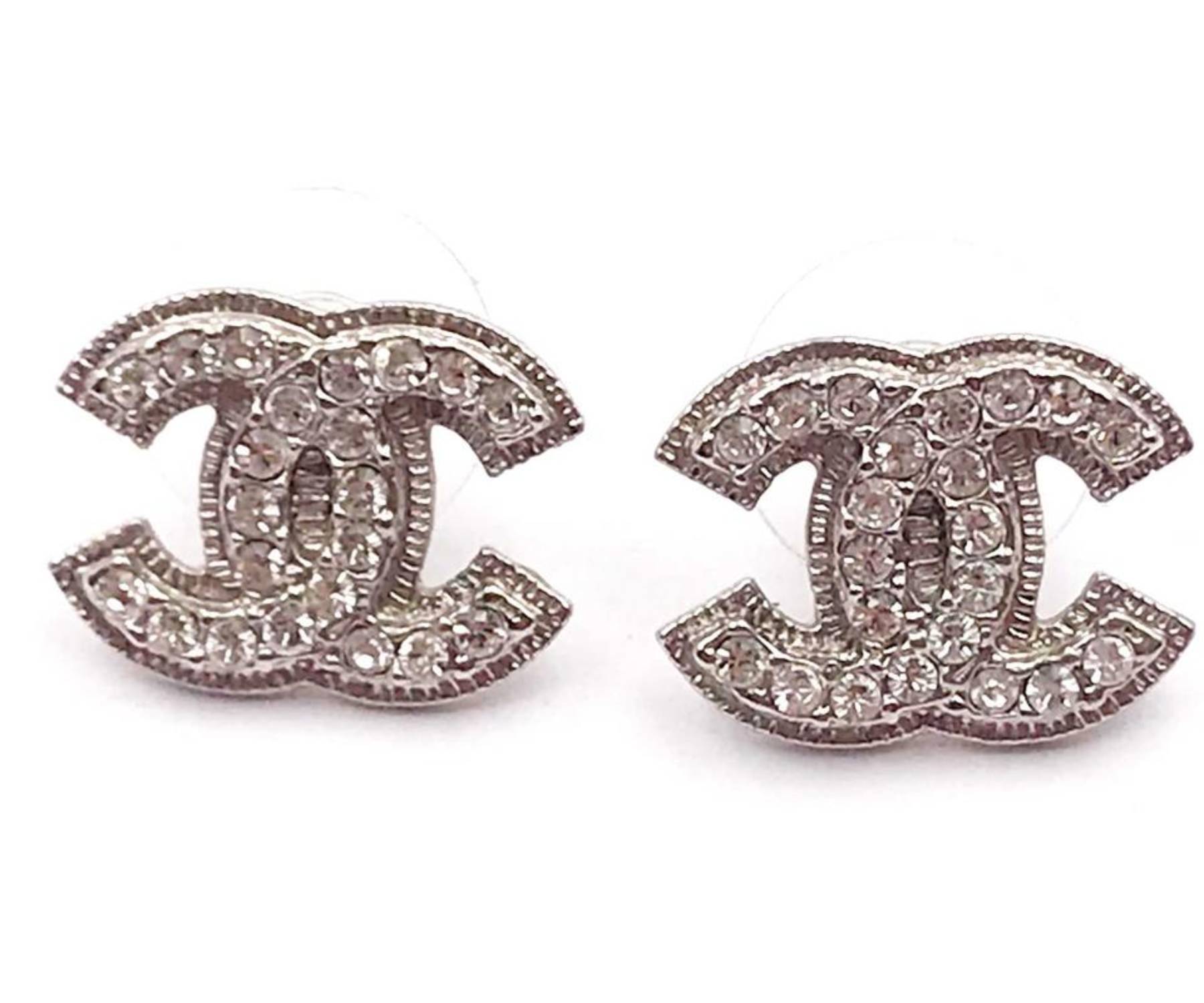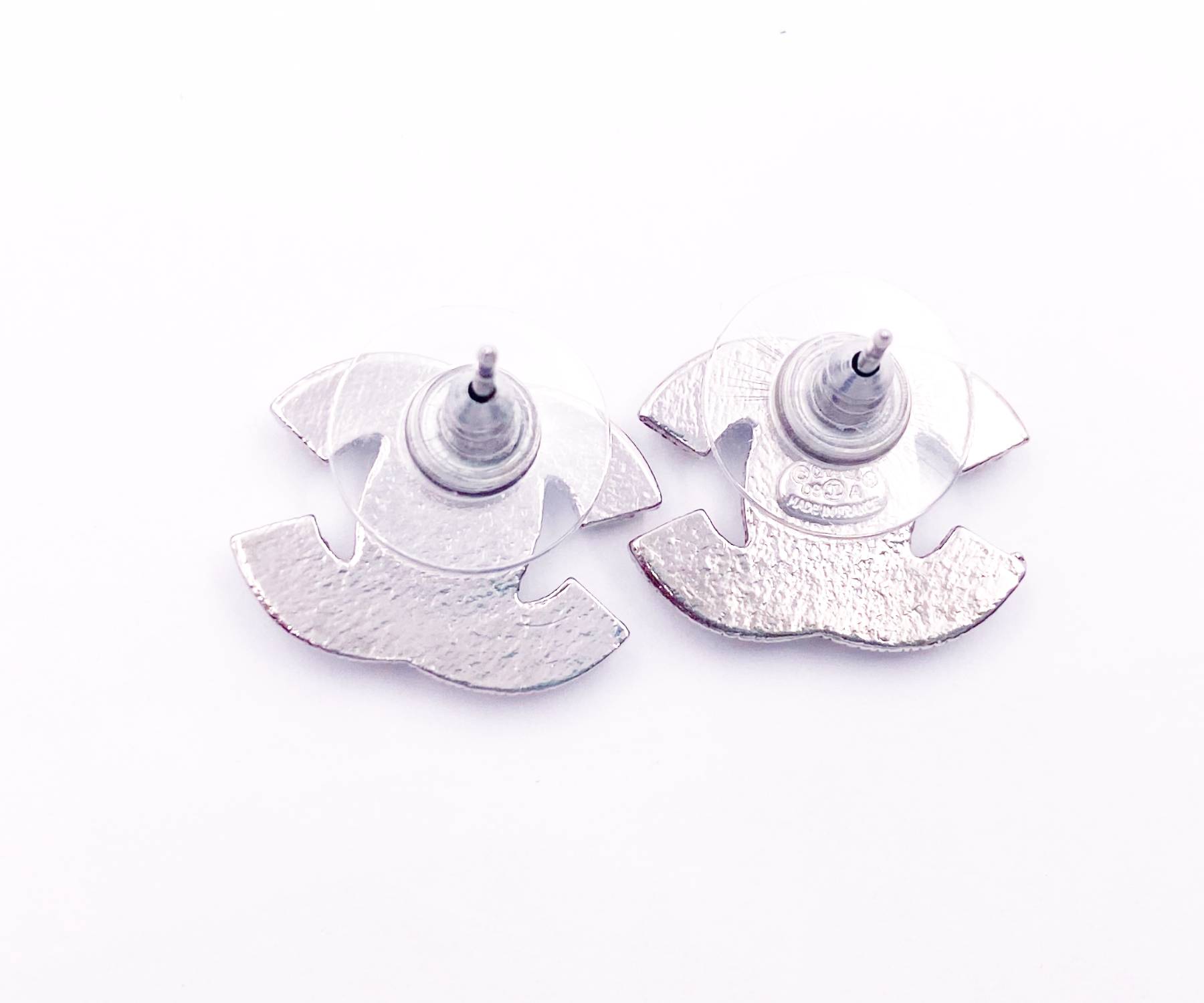 Chanel Classic Silver CC Rim Frame Crystal Piercing Earrings