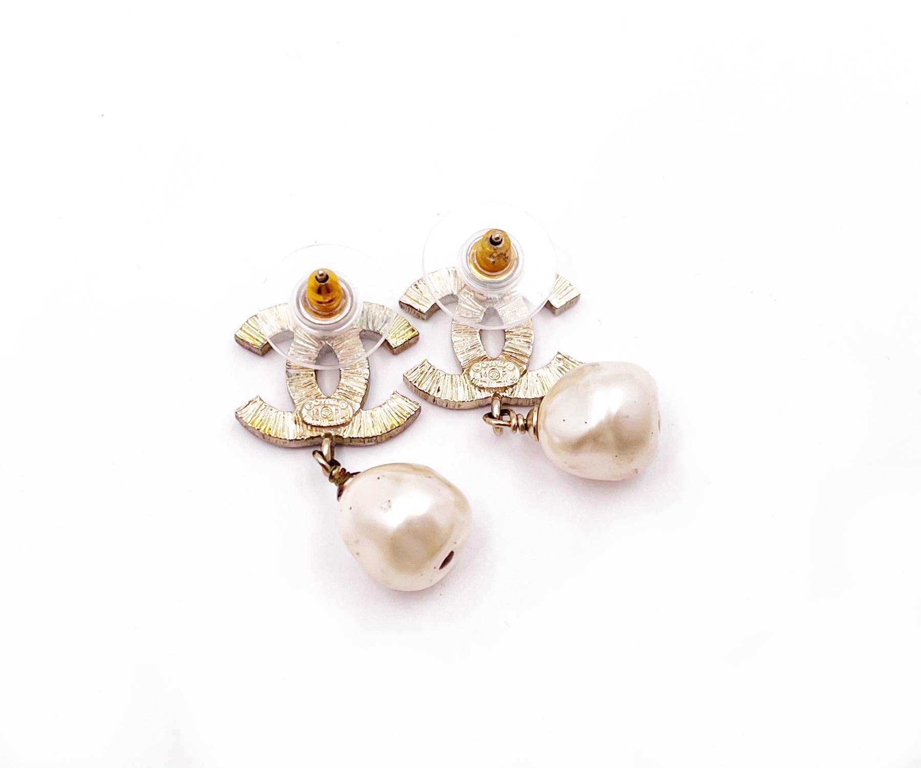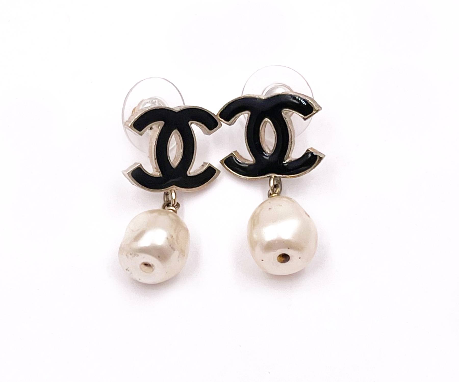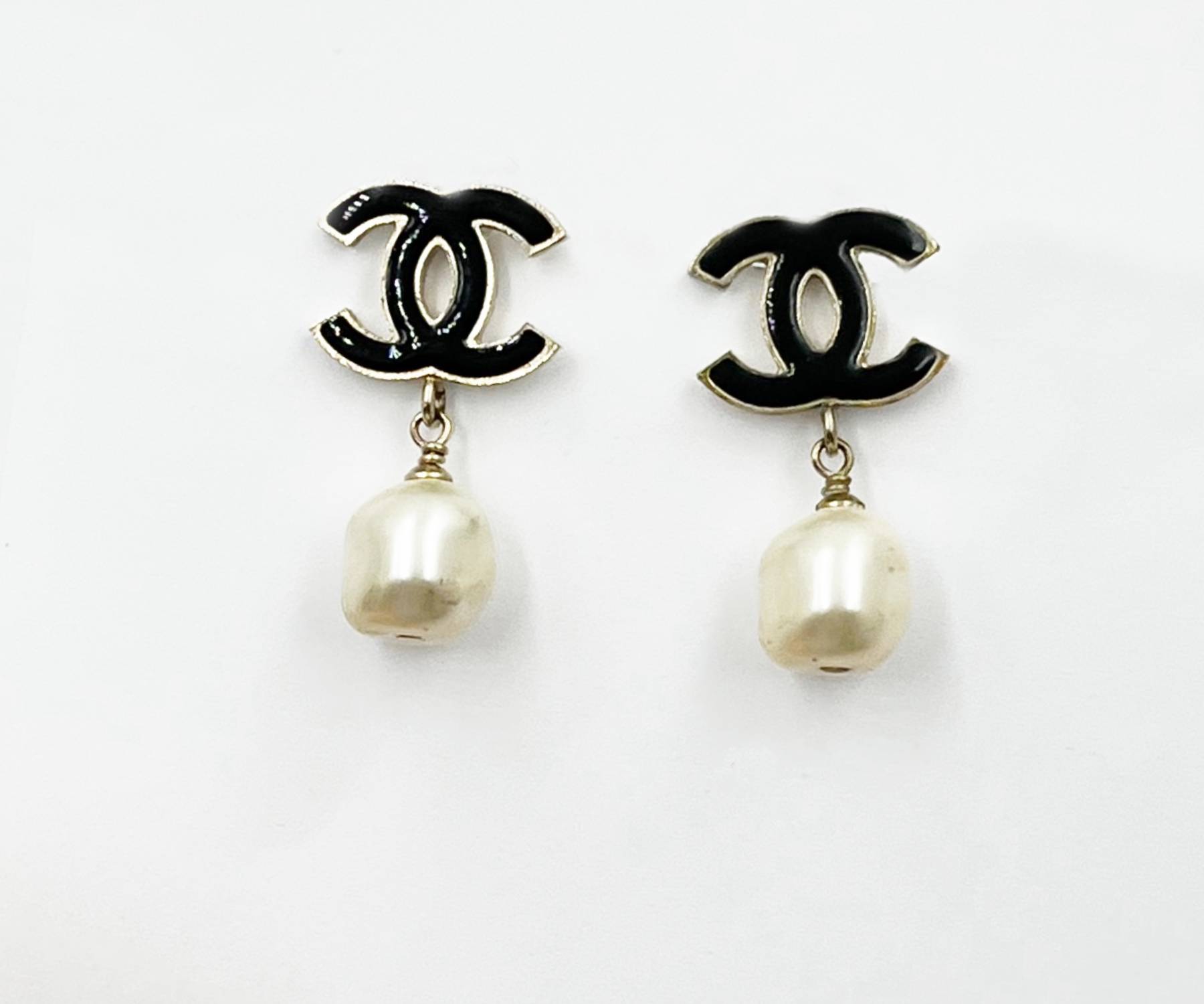 Chanel Gold Black CC Pearl Dangle Piercing Earrings