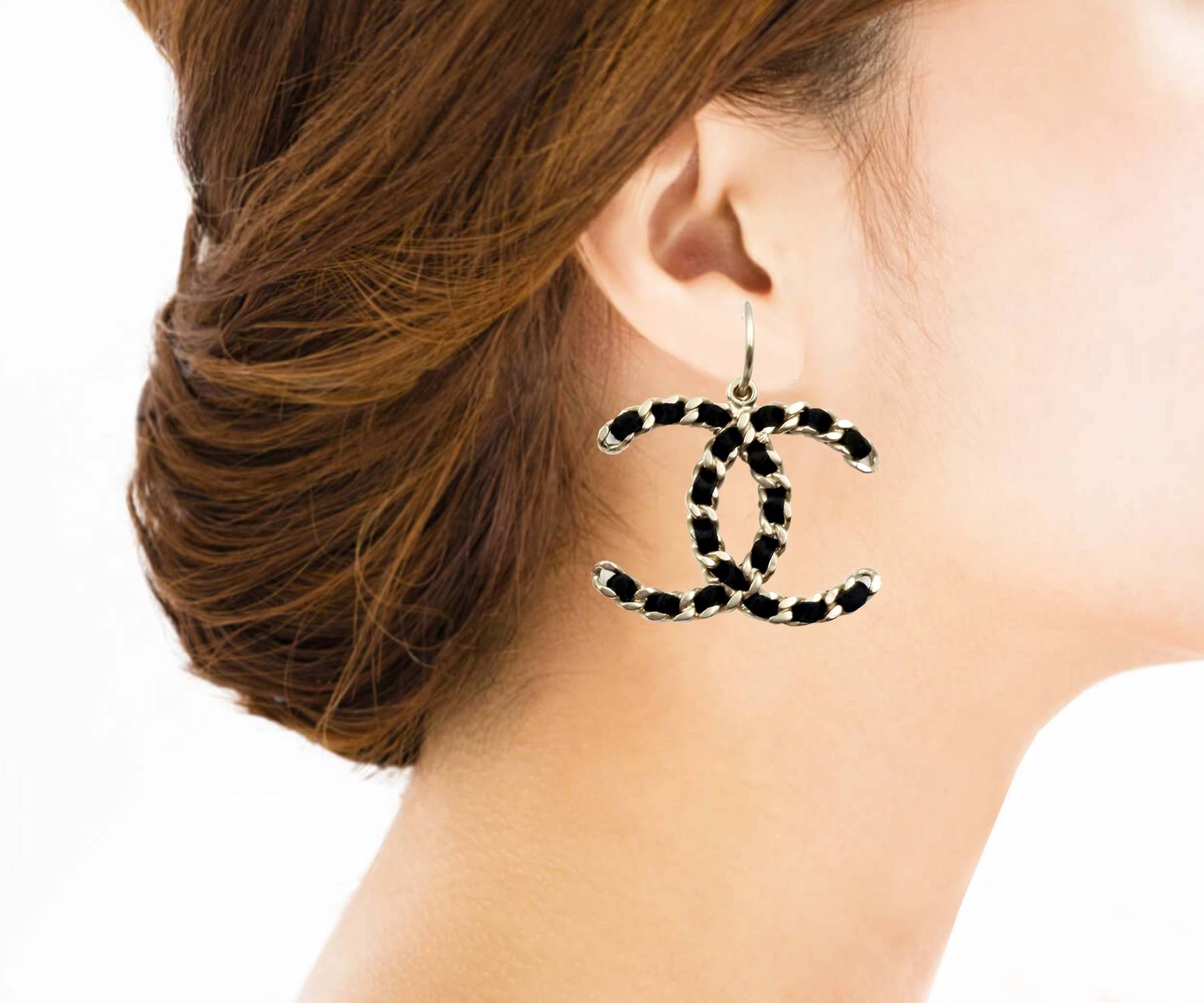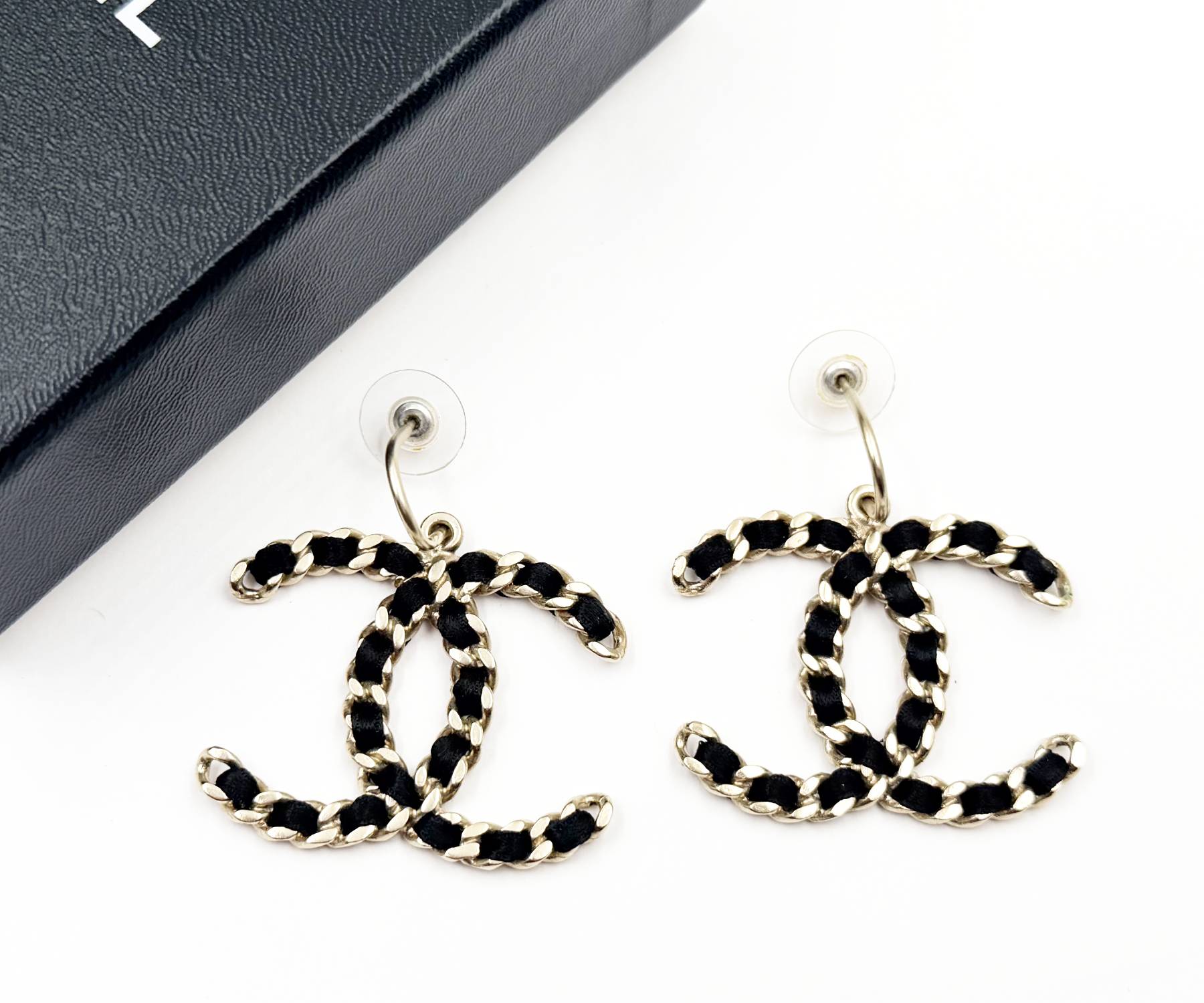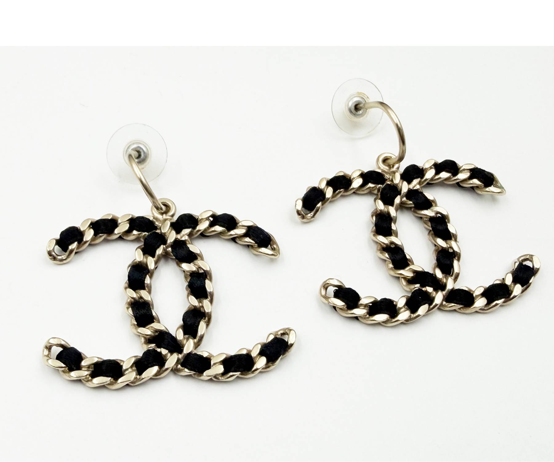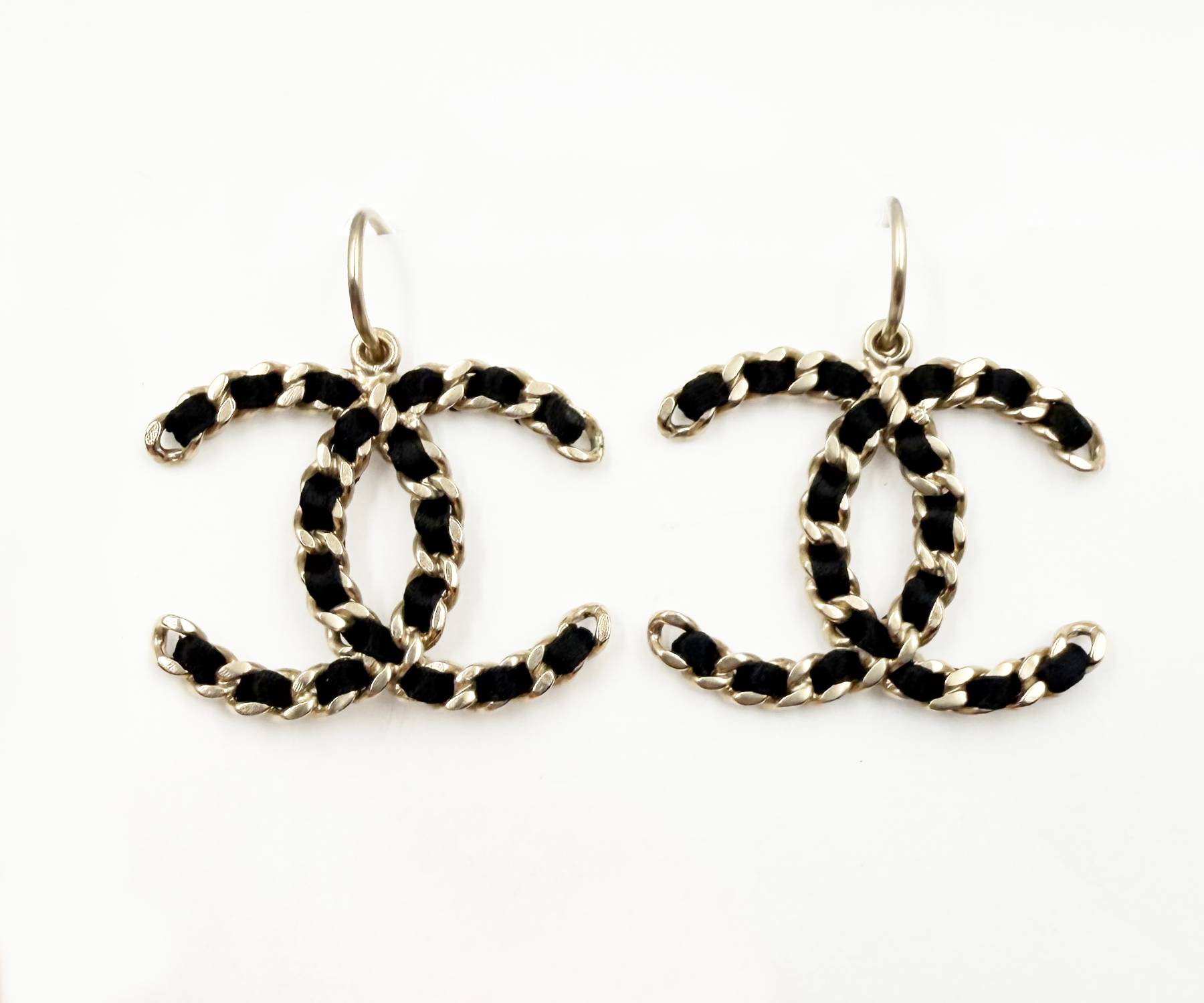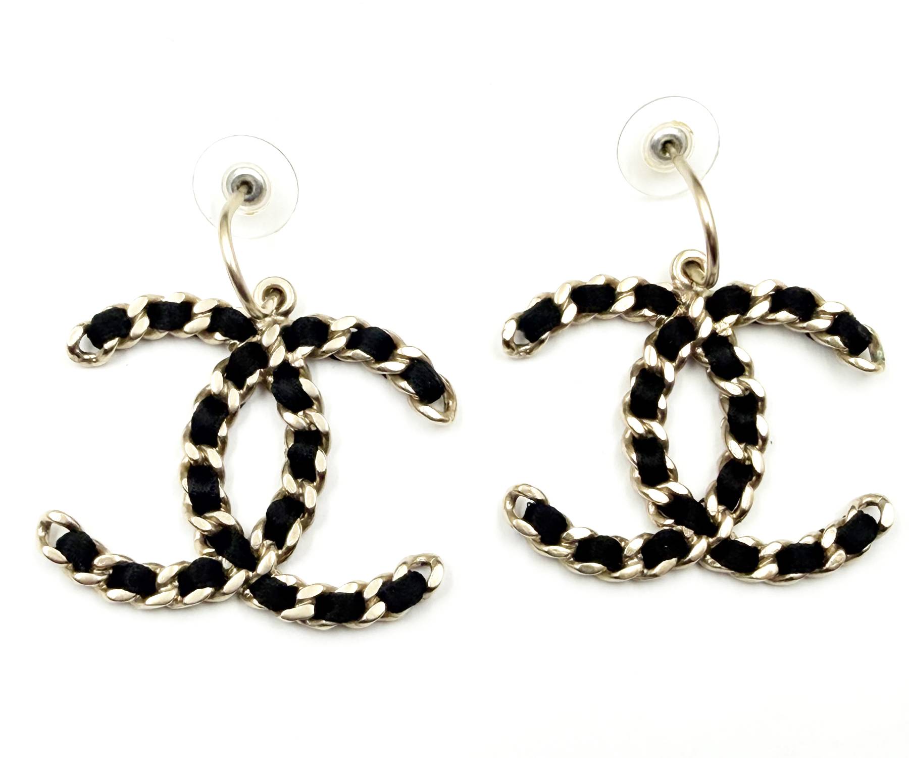 Chanel Gold CC Chain Black Ribbon XL Hoop Earrings