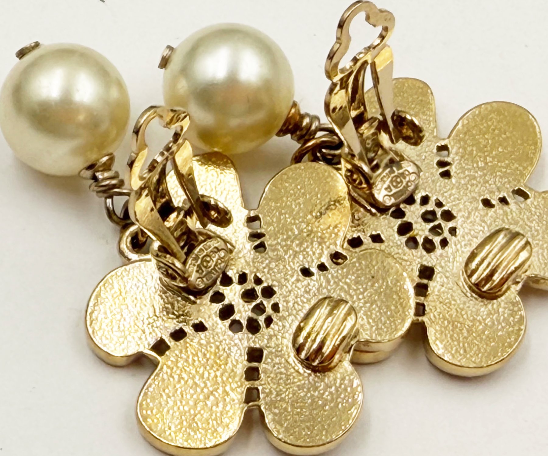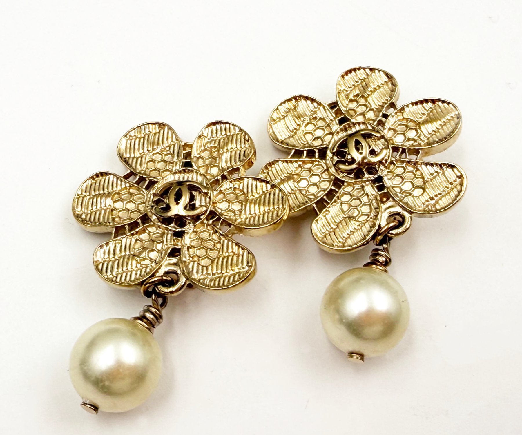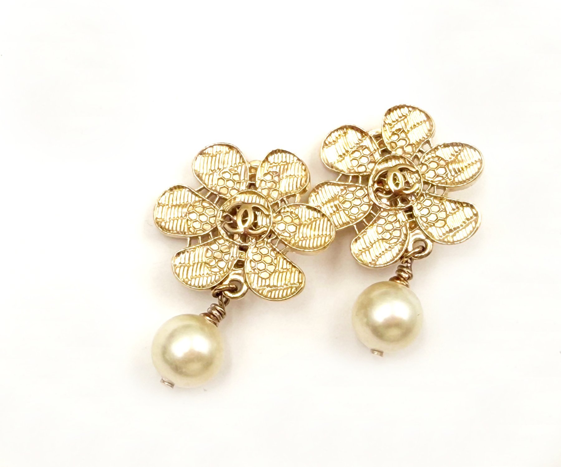 Chanel Gold CC Lace Flower Pearl Dangle Clip on Earrings