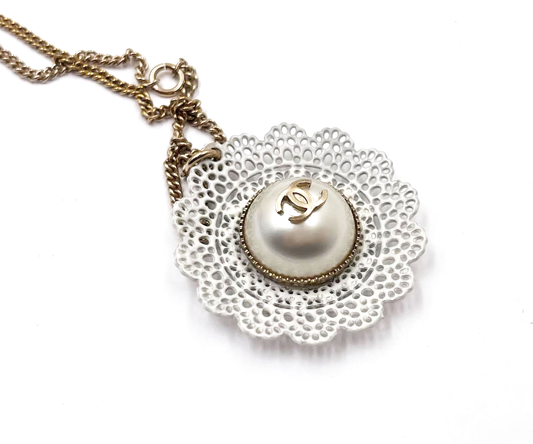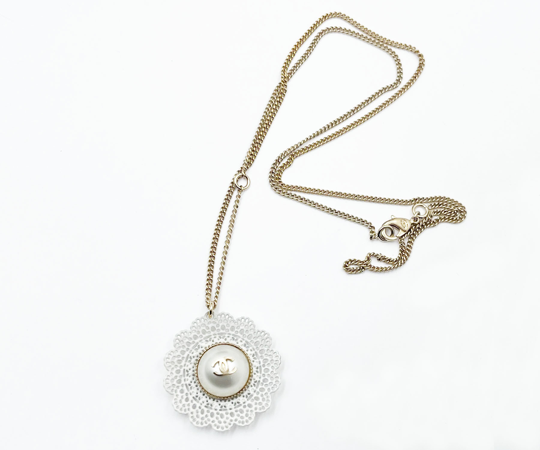 Chanel Gold CC Lace Flower Pearl Necklace