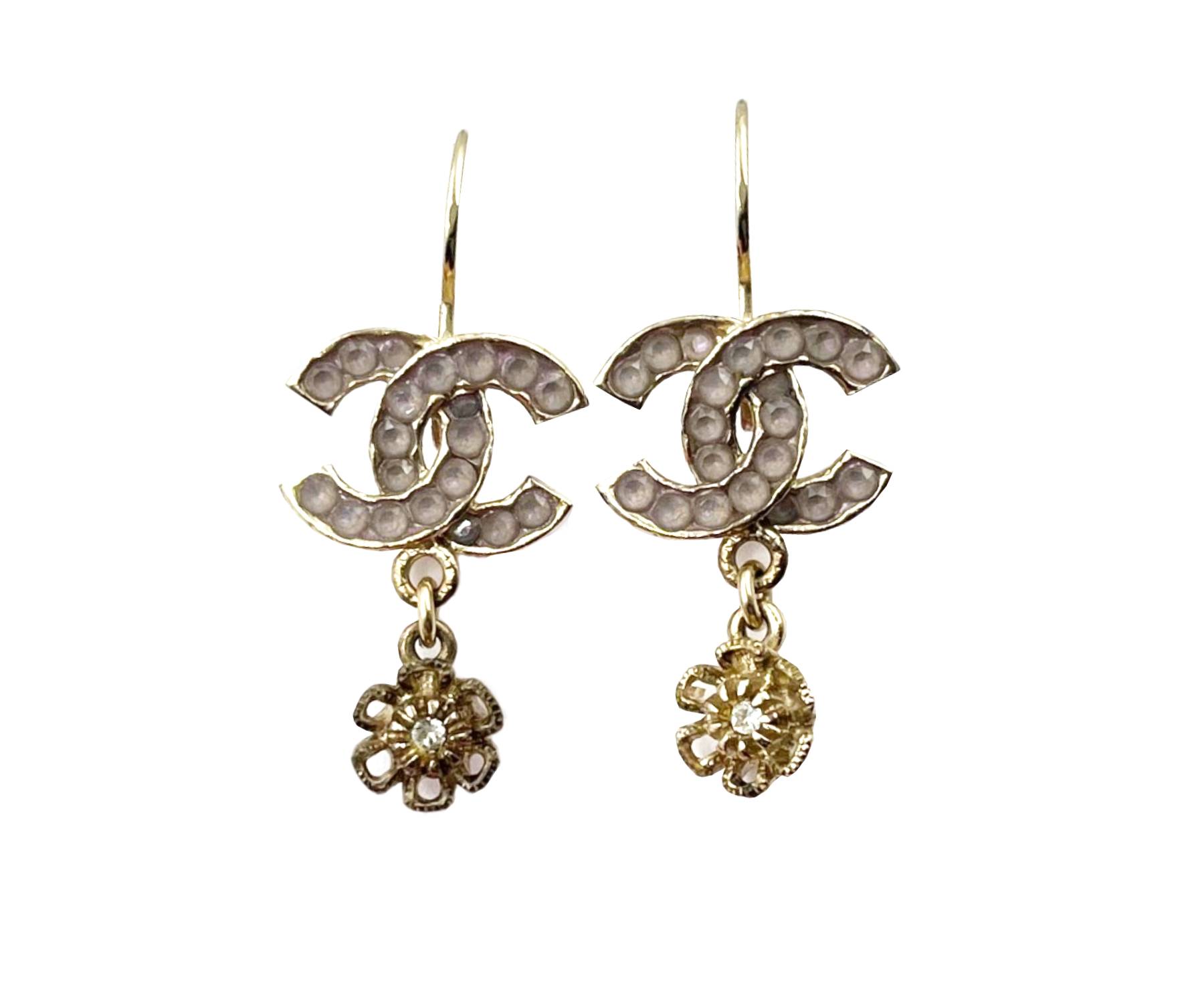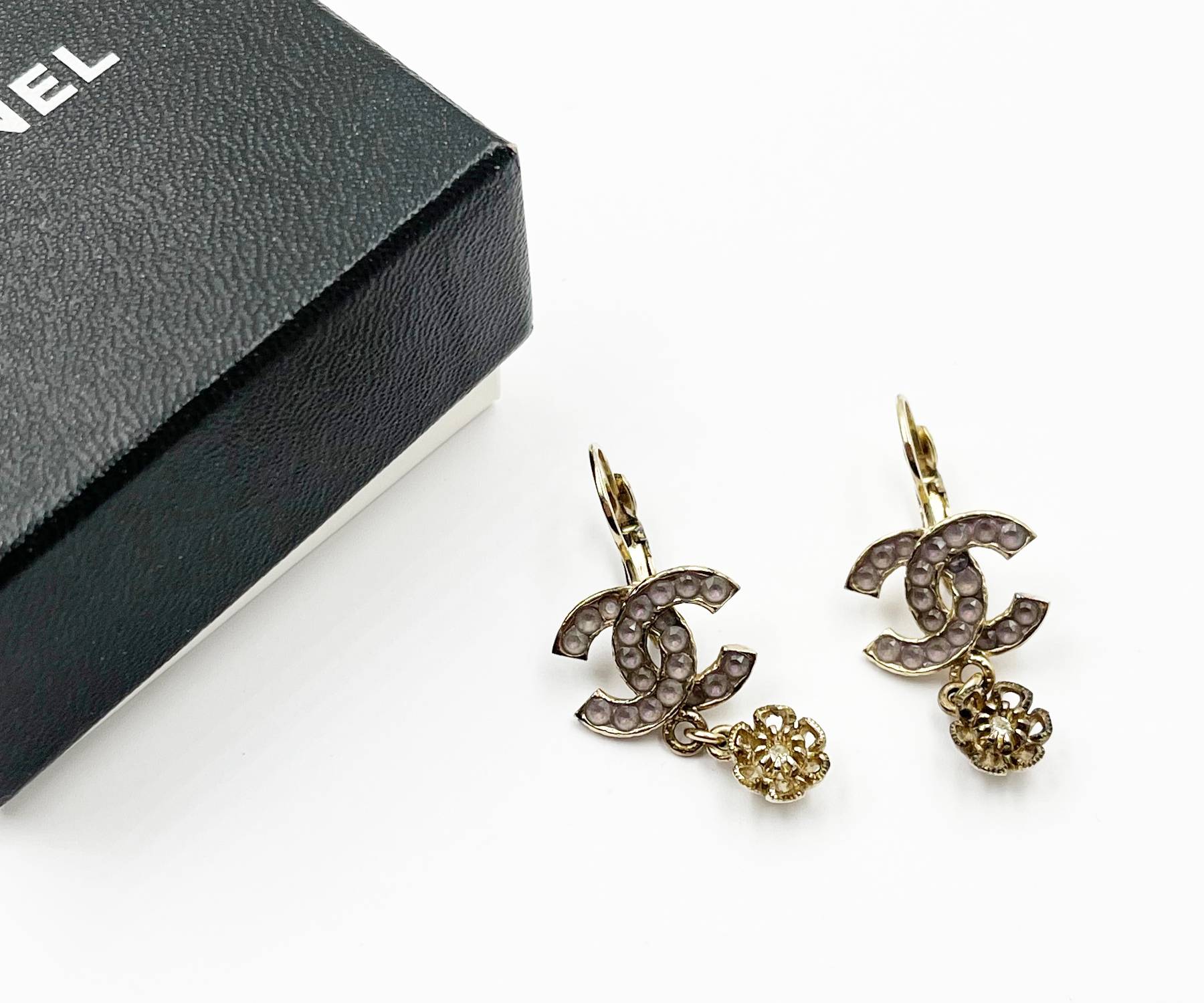 Chanel Gold CC Lavender Crystal Flower Dangle Piercing Earrings
