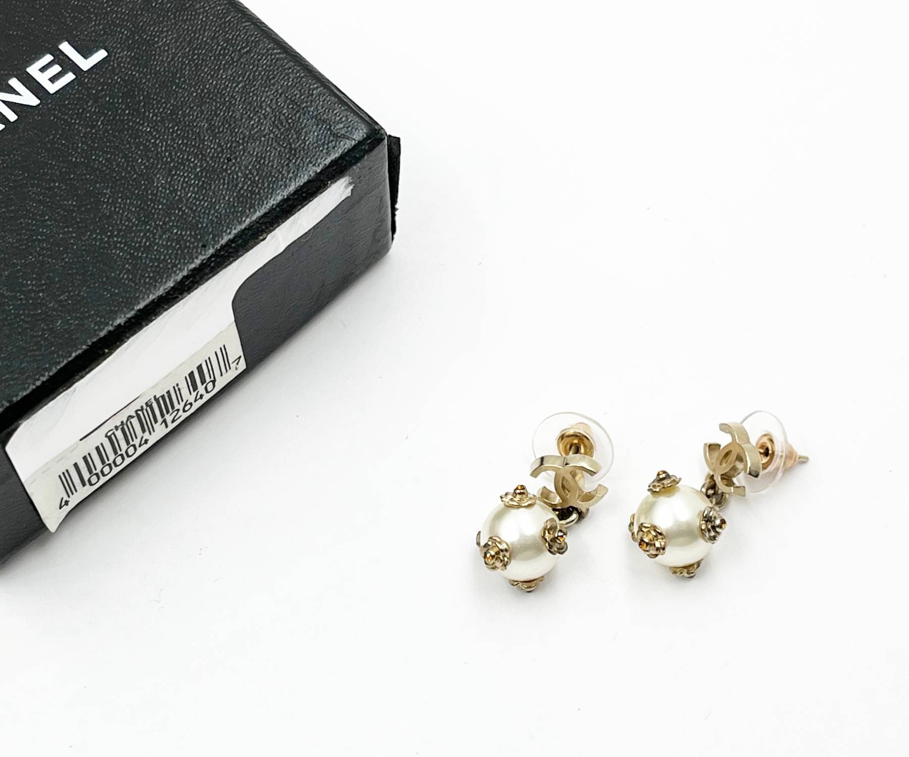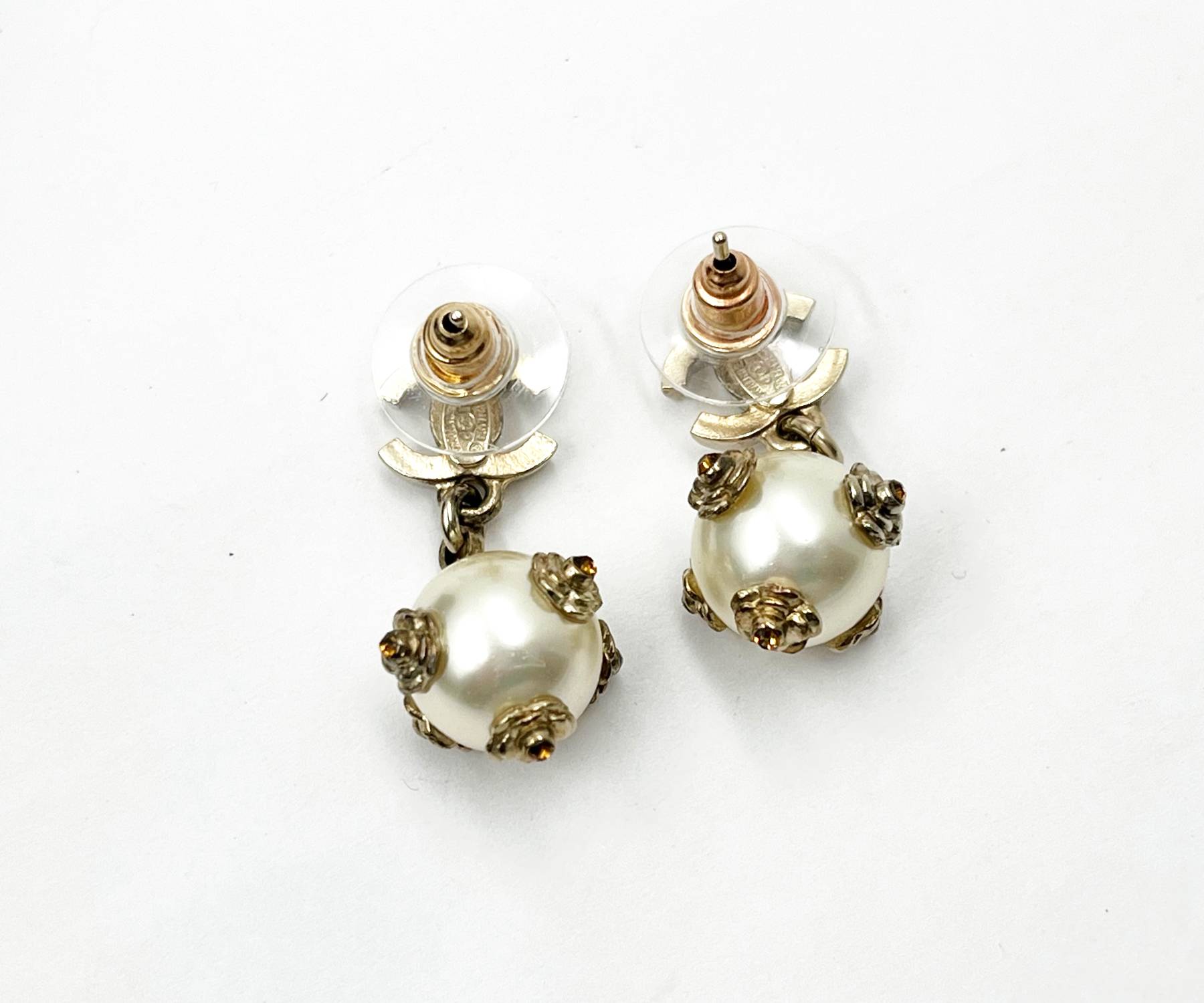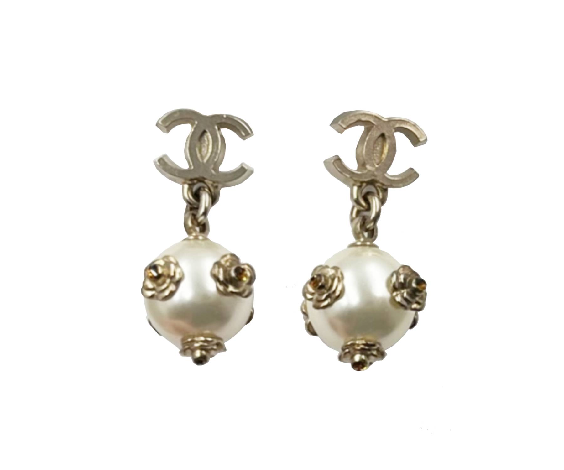 Chanel Gold CC Mini Camellia Flower Pearl Dangle Piercing Earrings