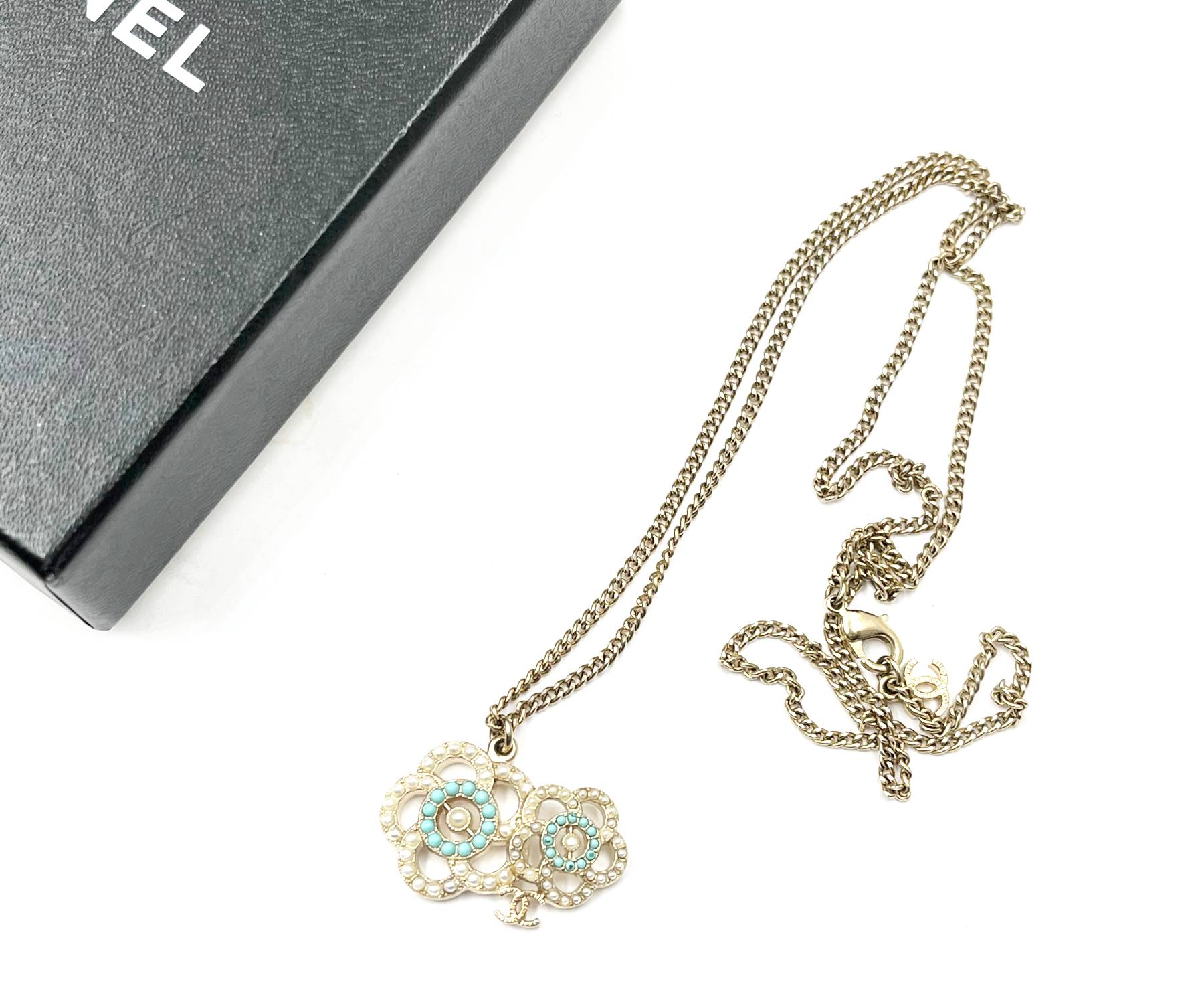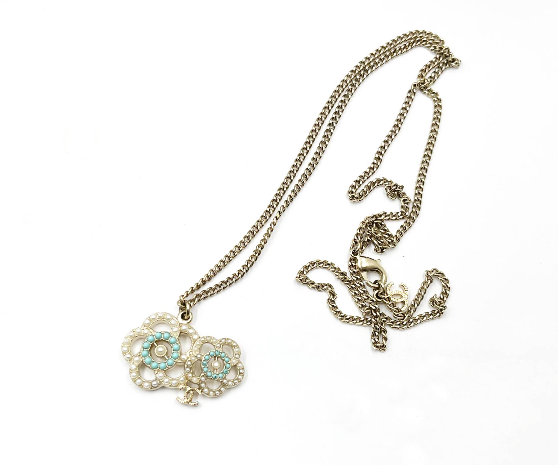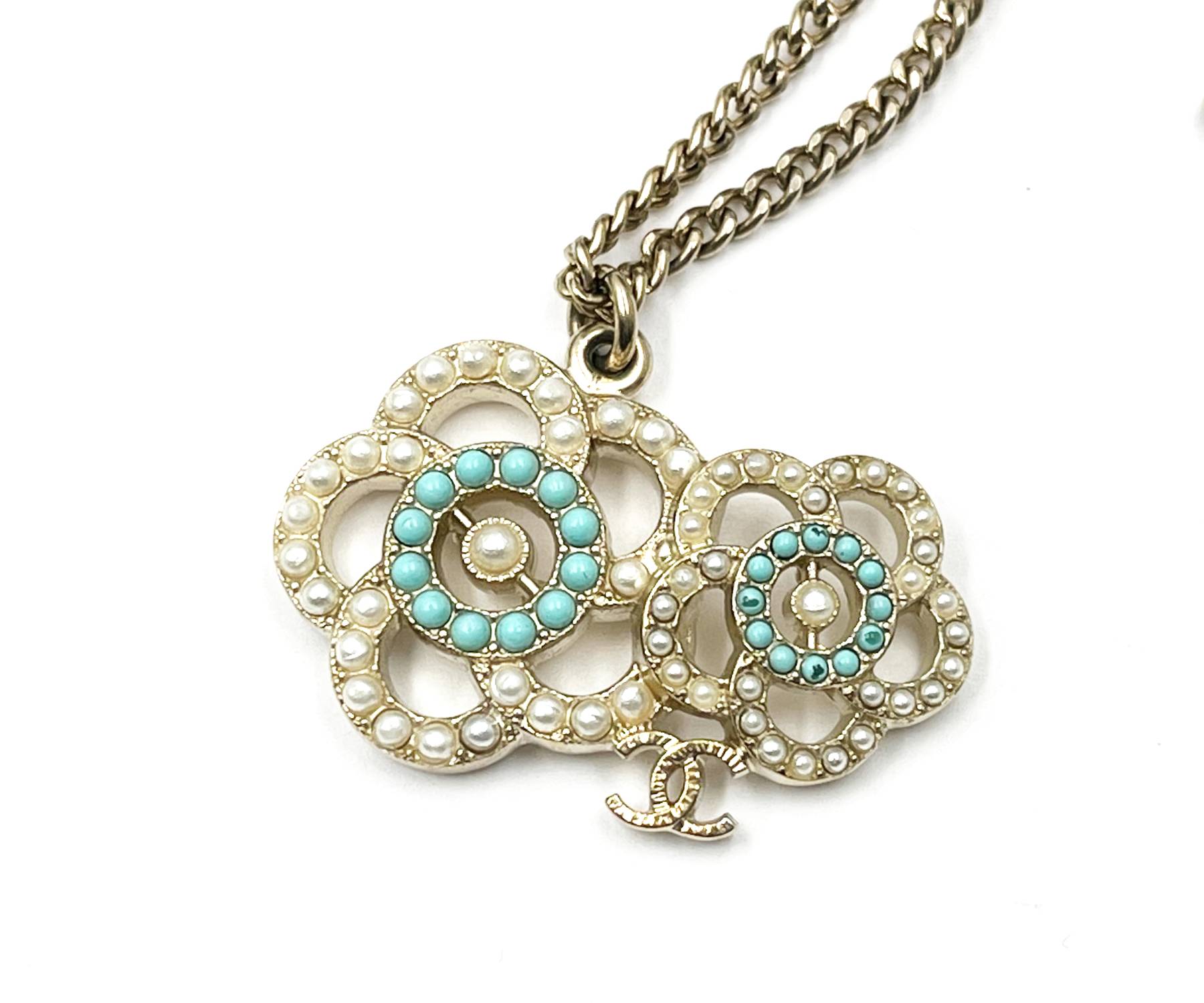Chanel Gold CC Pearl Turquoise Bead Camellia Pendant Necklace