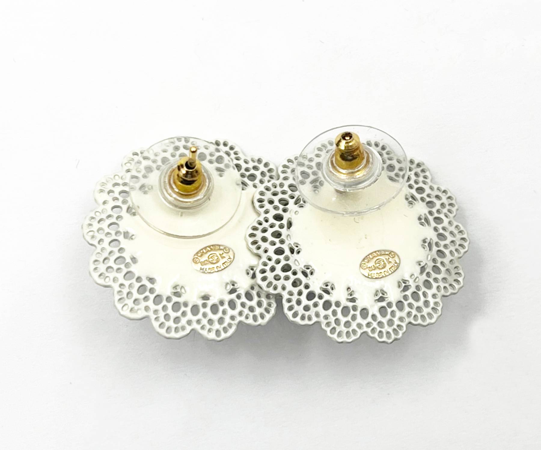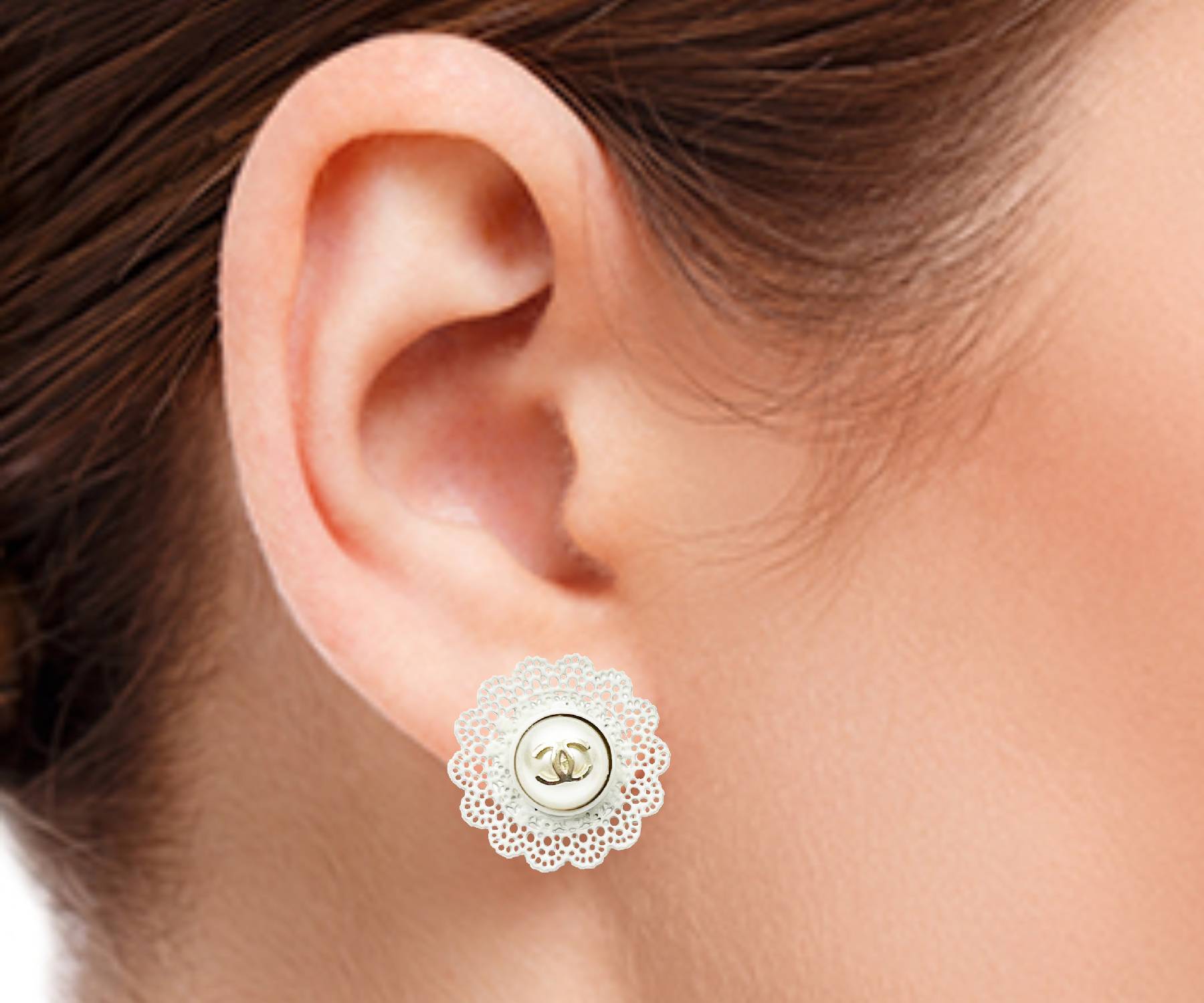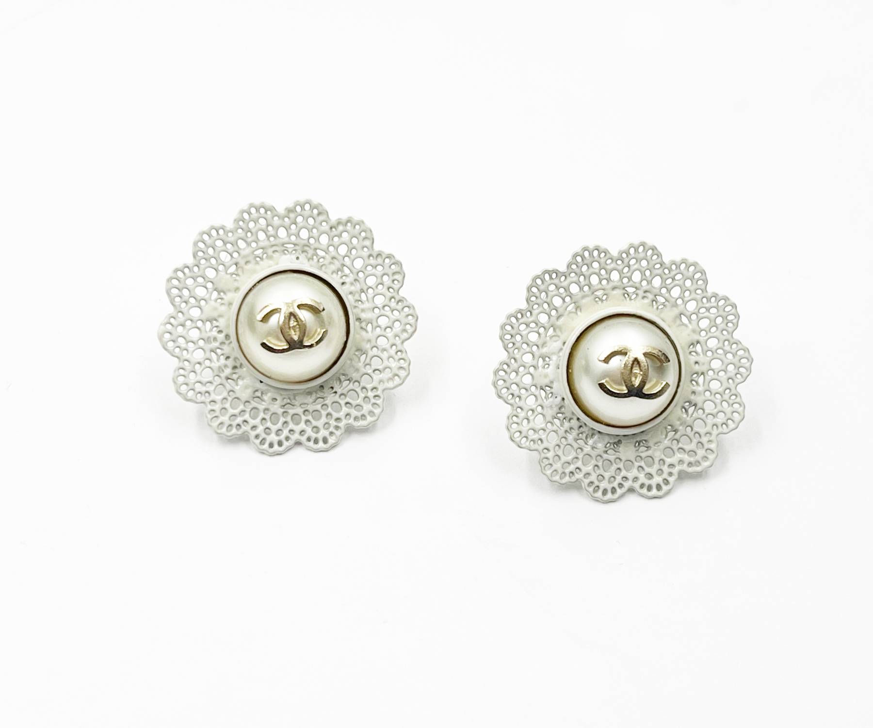 Chanel Gold CC Pearl White Lace Piercing Earrings