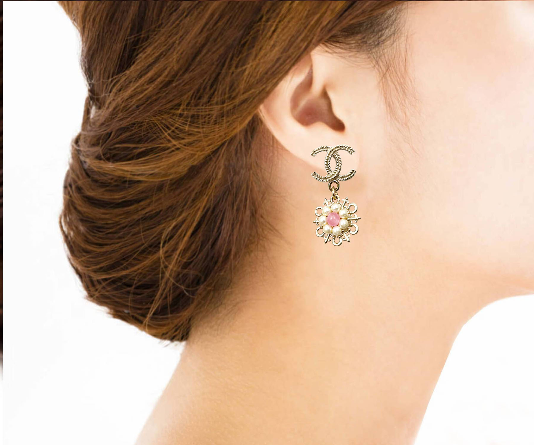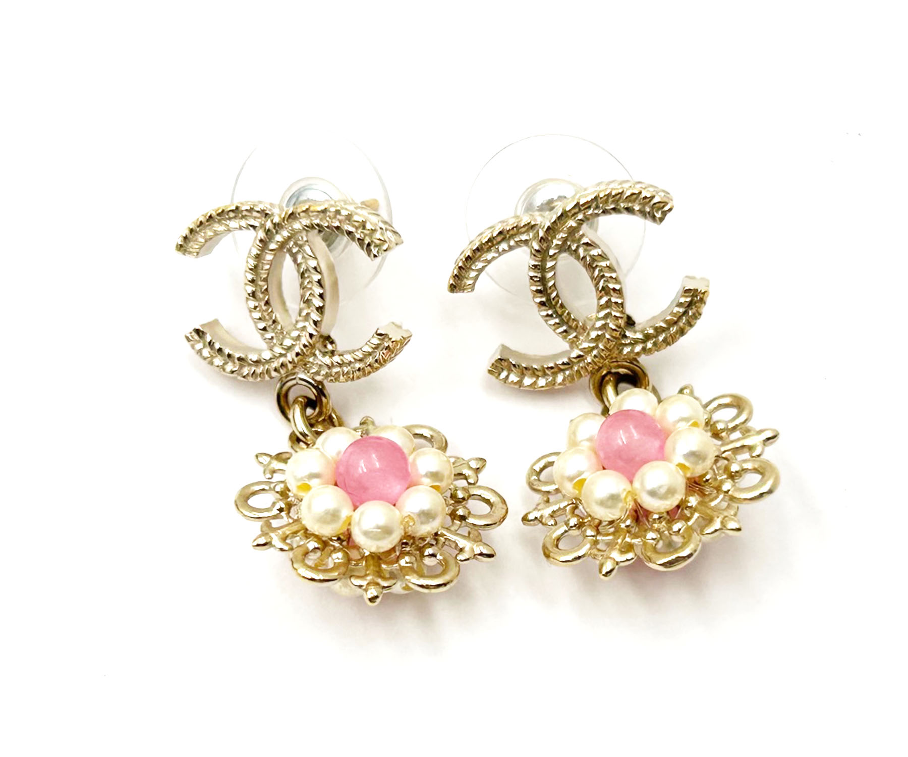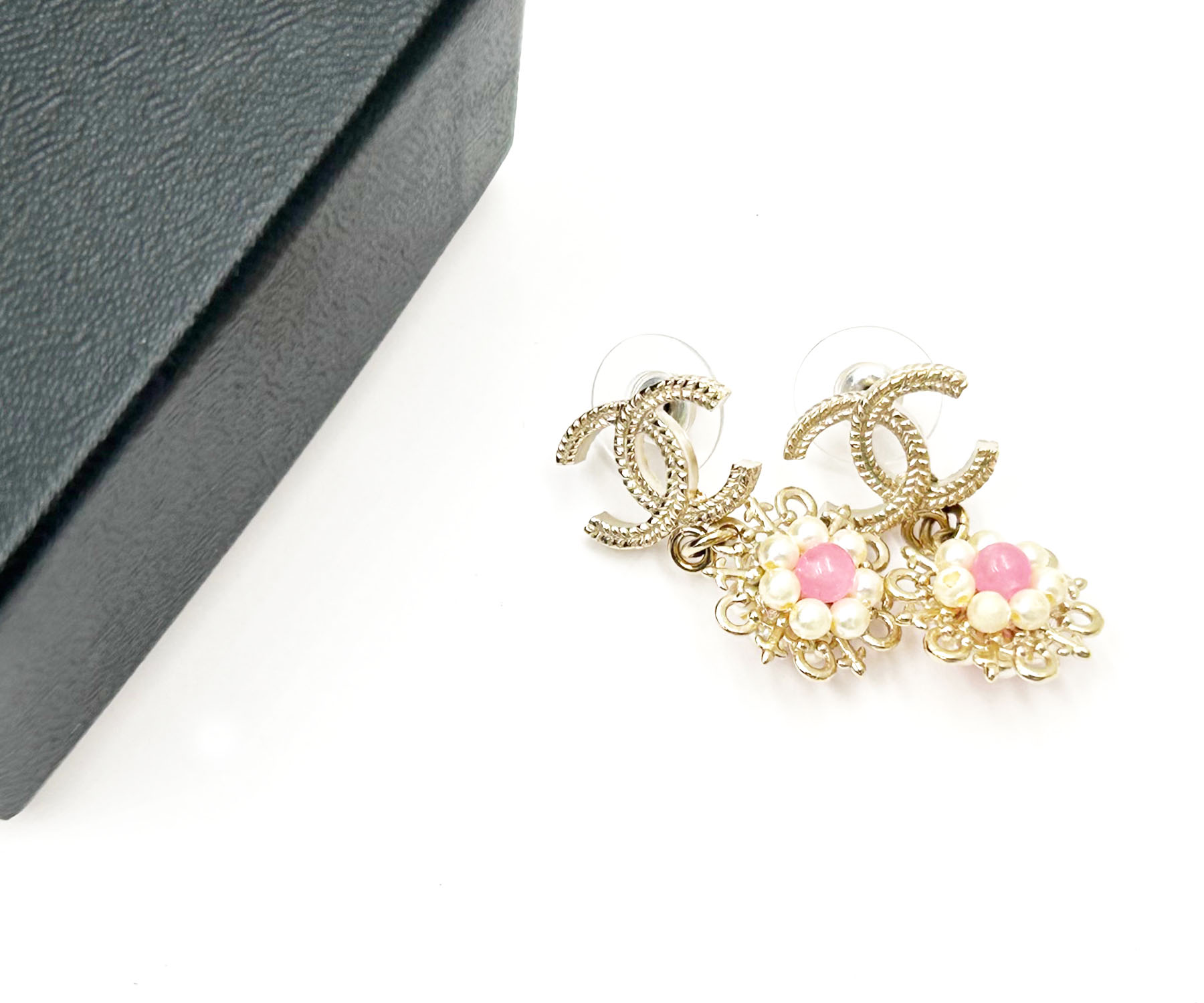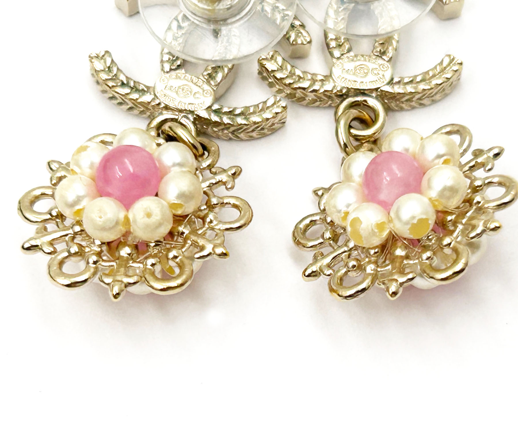 Chanel Gold CC Pink Bead Pearl Wheel Piercing Earrings