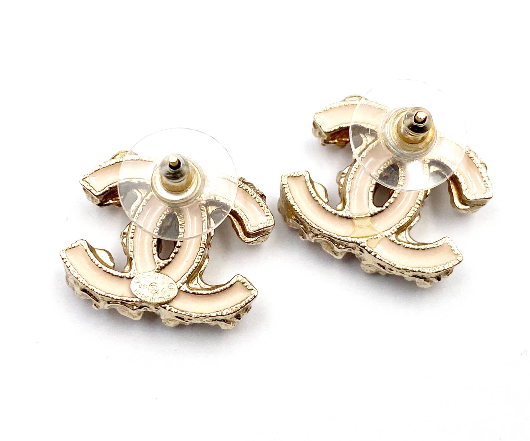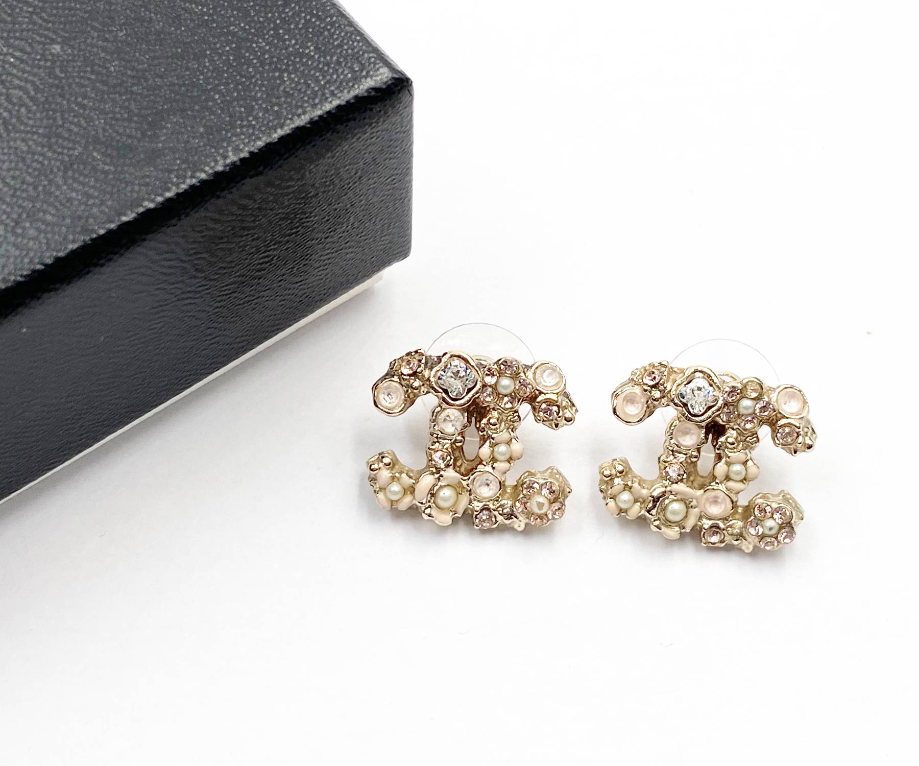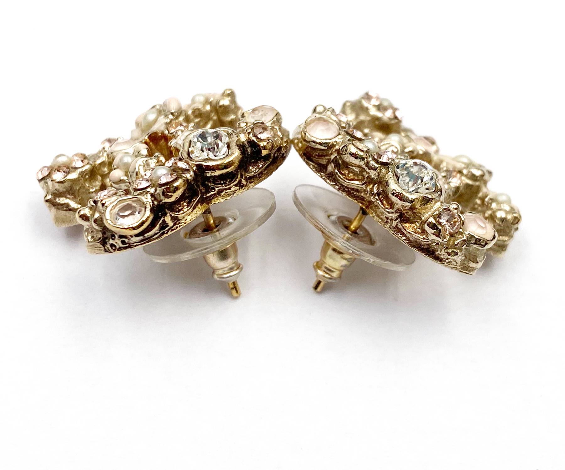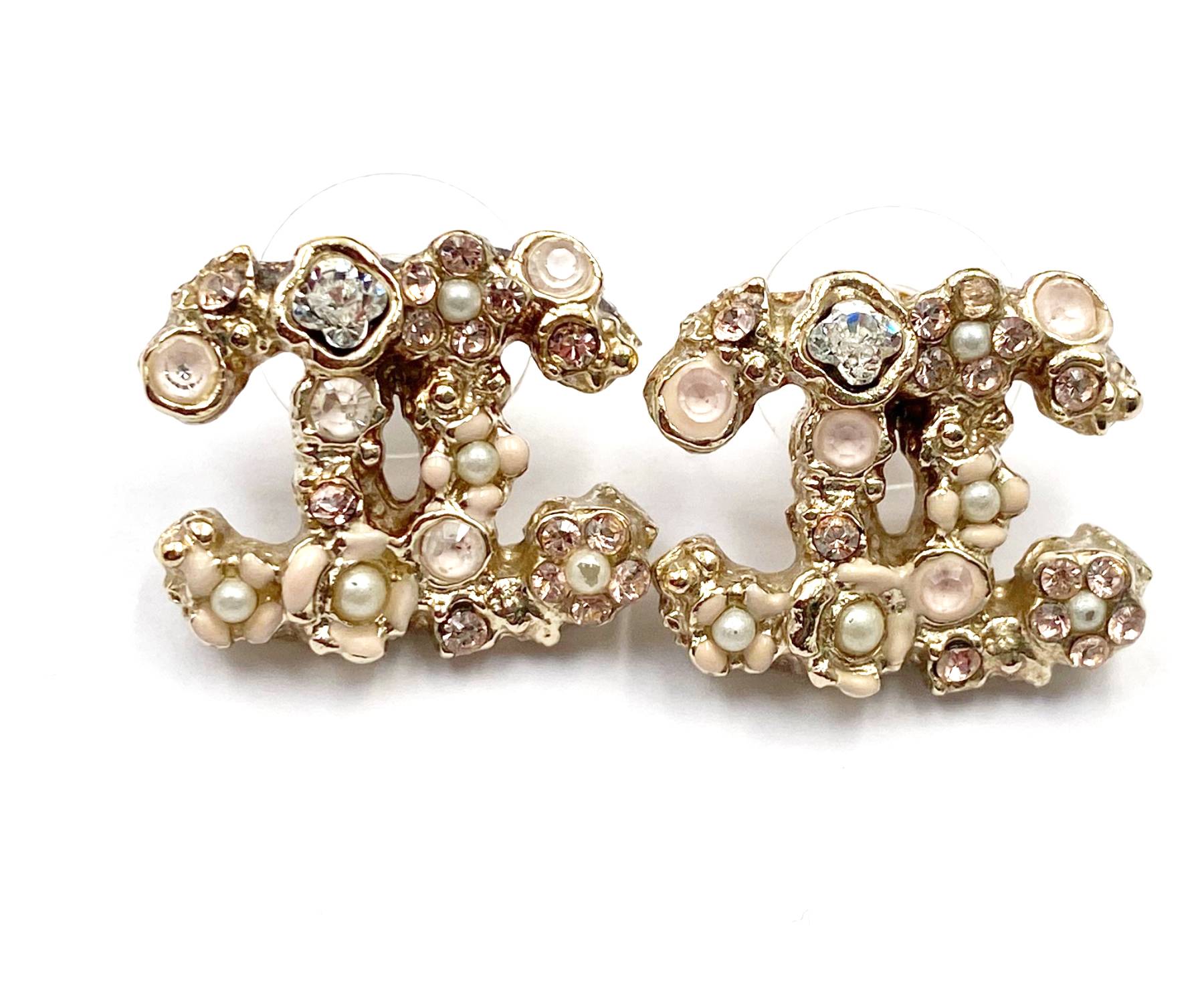 Chanel Gold CC Pink Flower Crystal Piercing Earrings