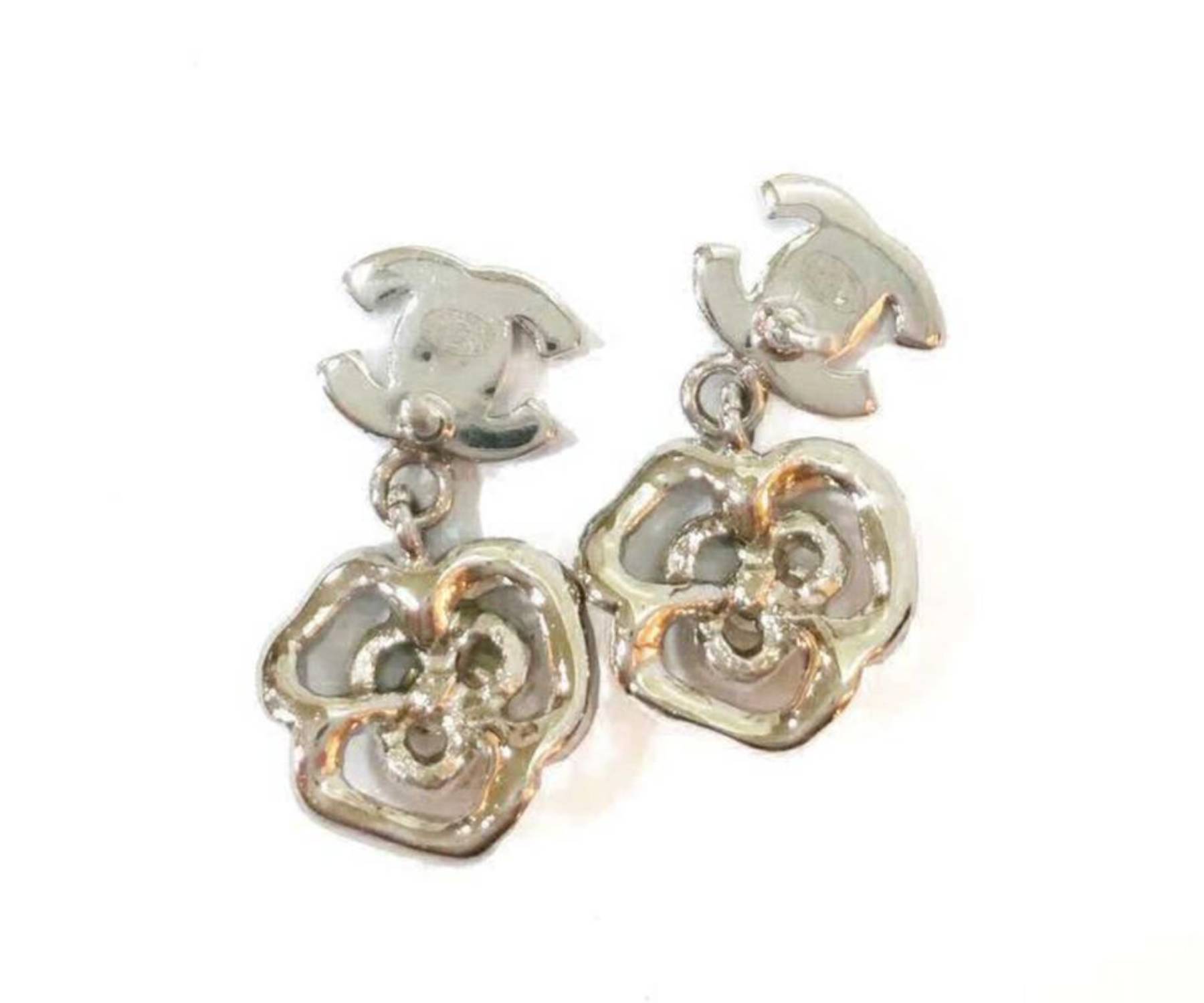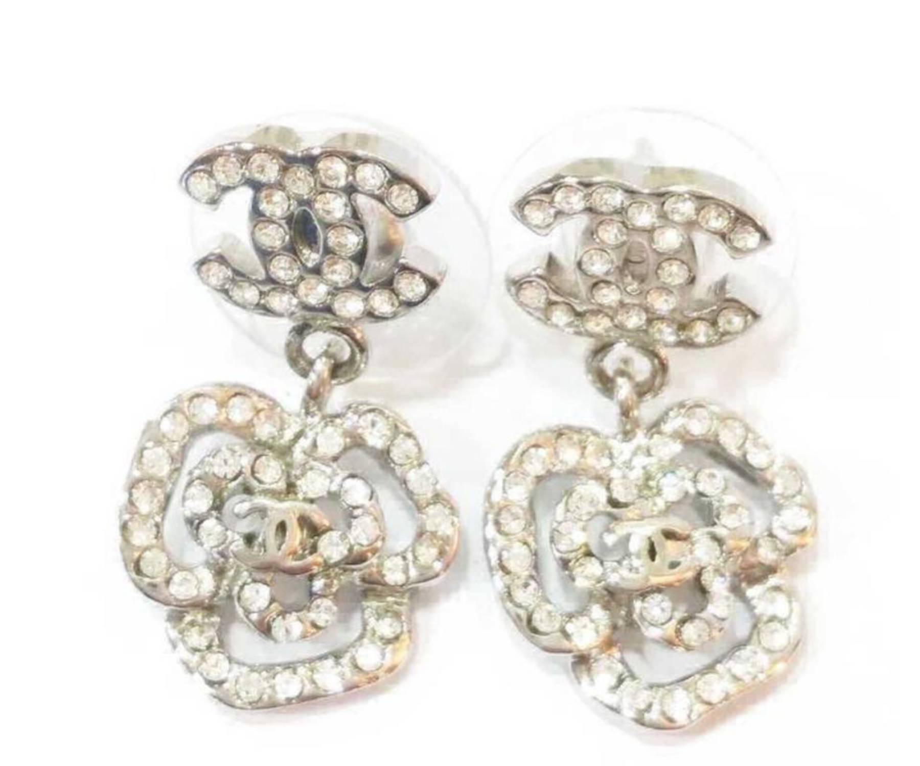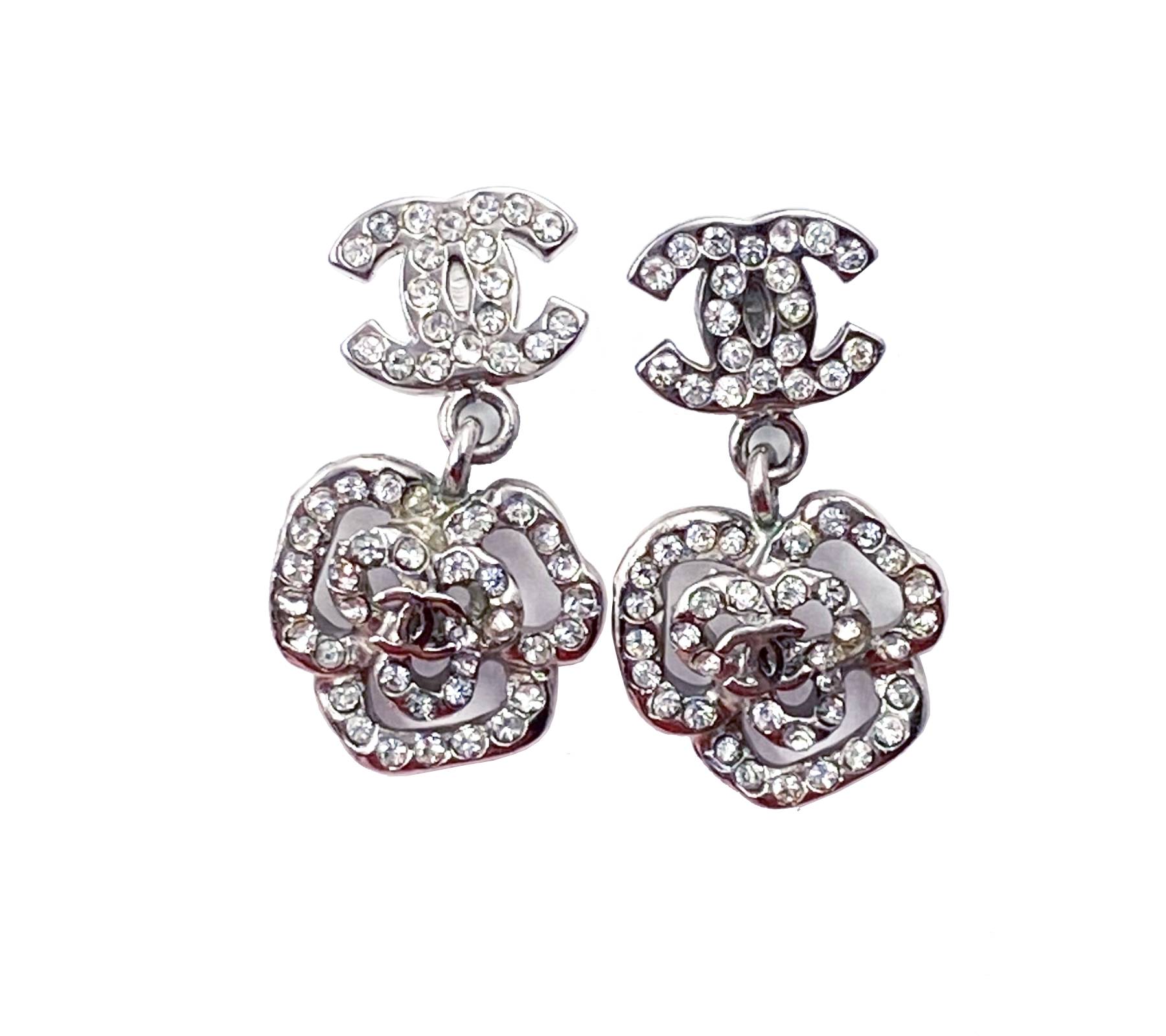 Chanel Silver CC Crystal Camellia Dangle Piercing Earrings