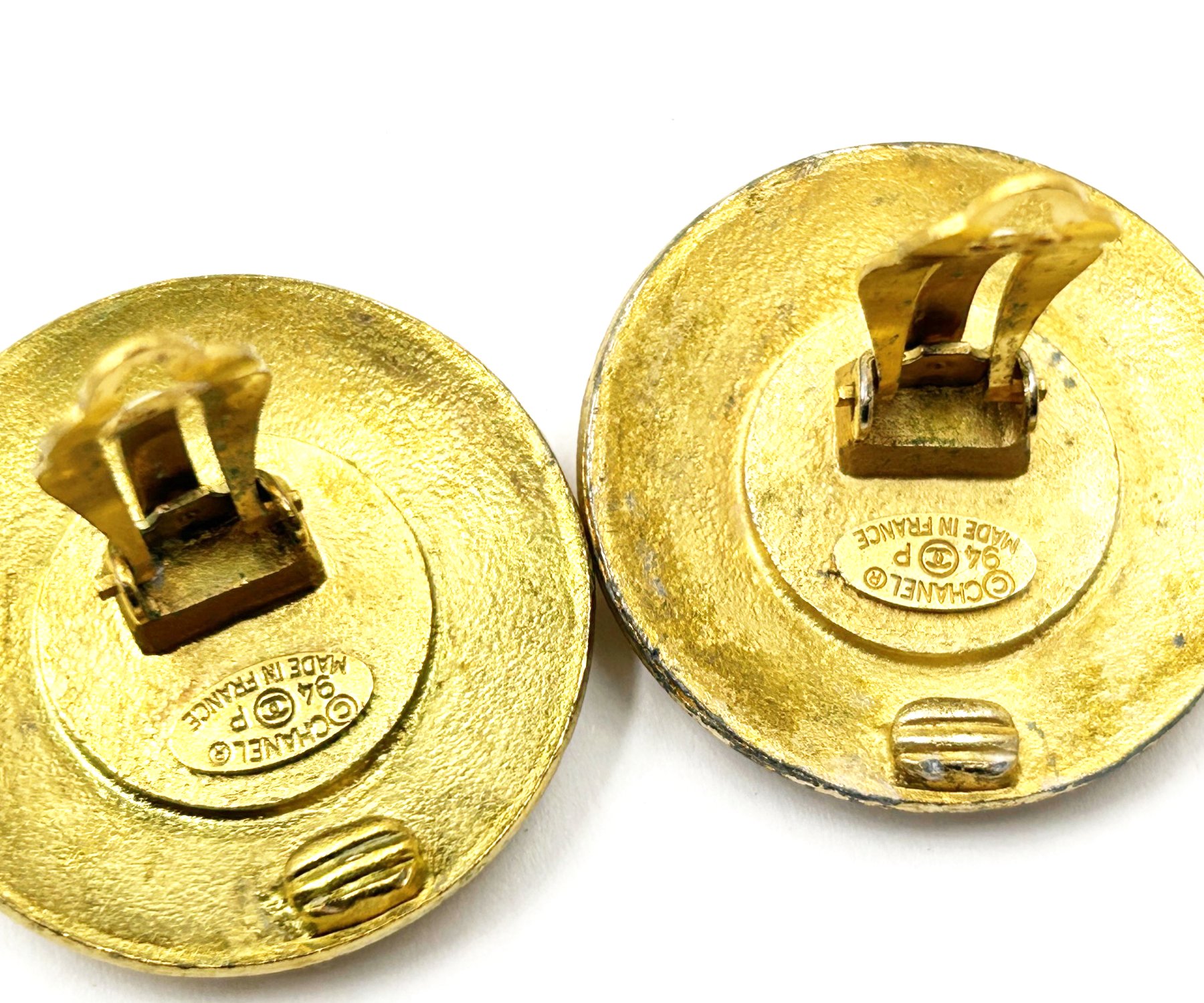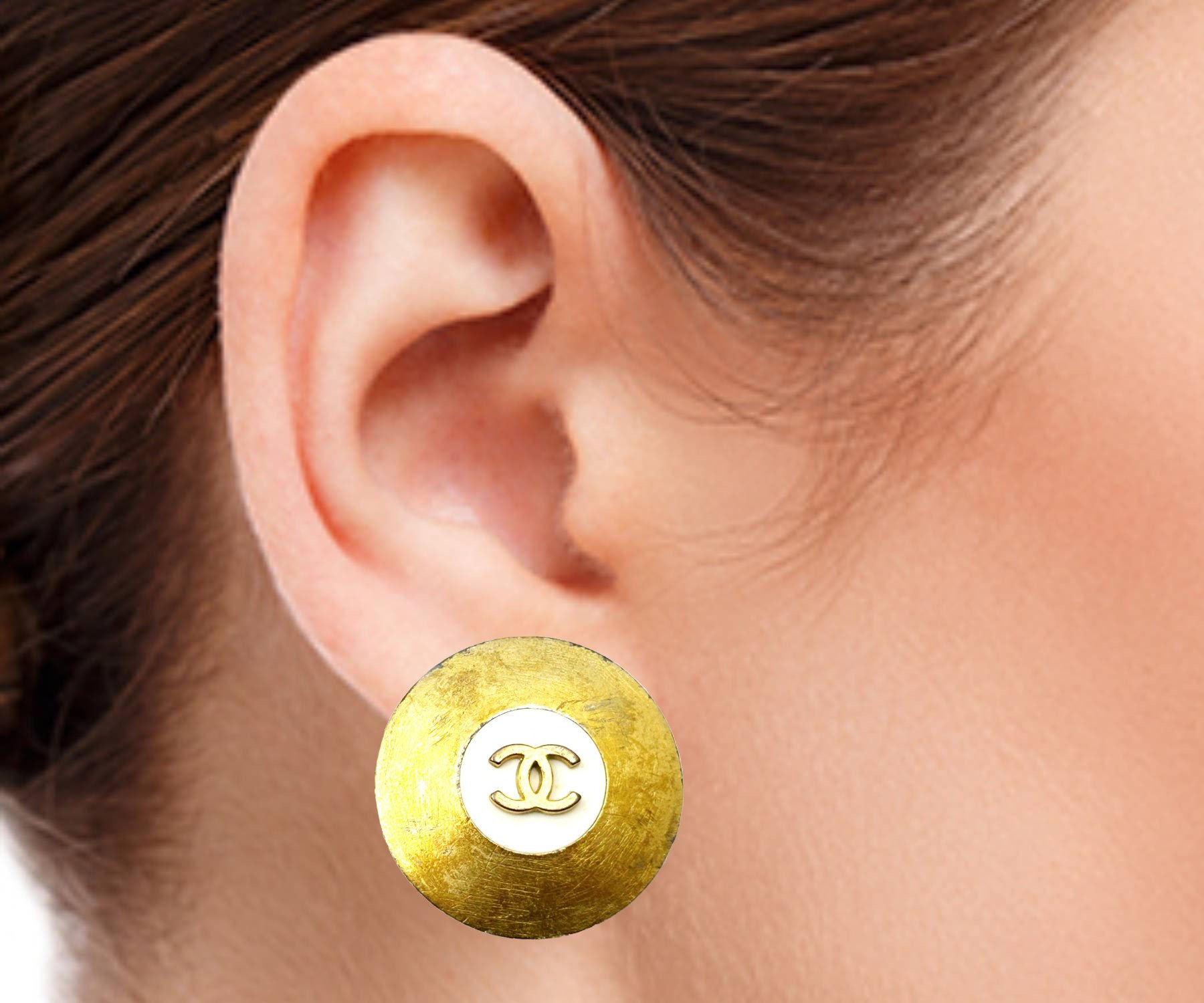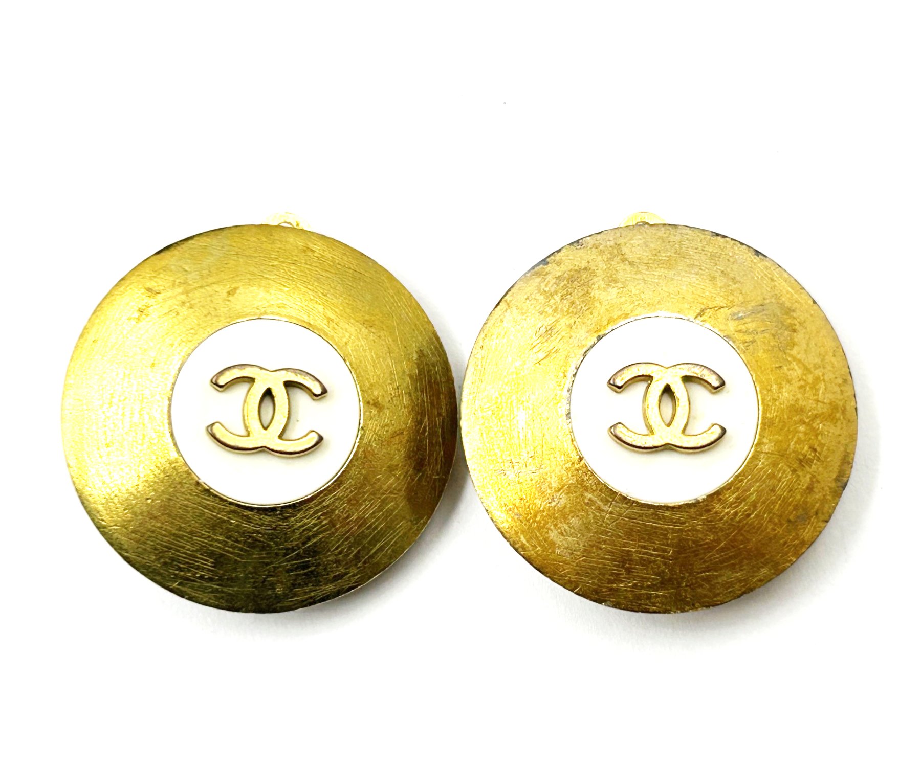 Chanel Gold Plated CC White Disc Clip On Earrings