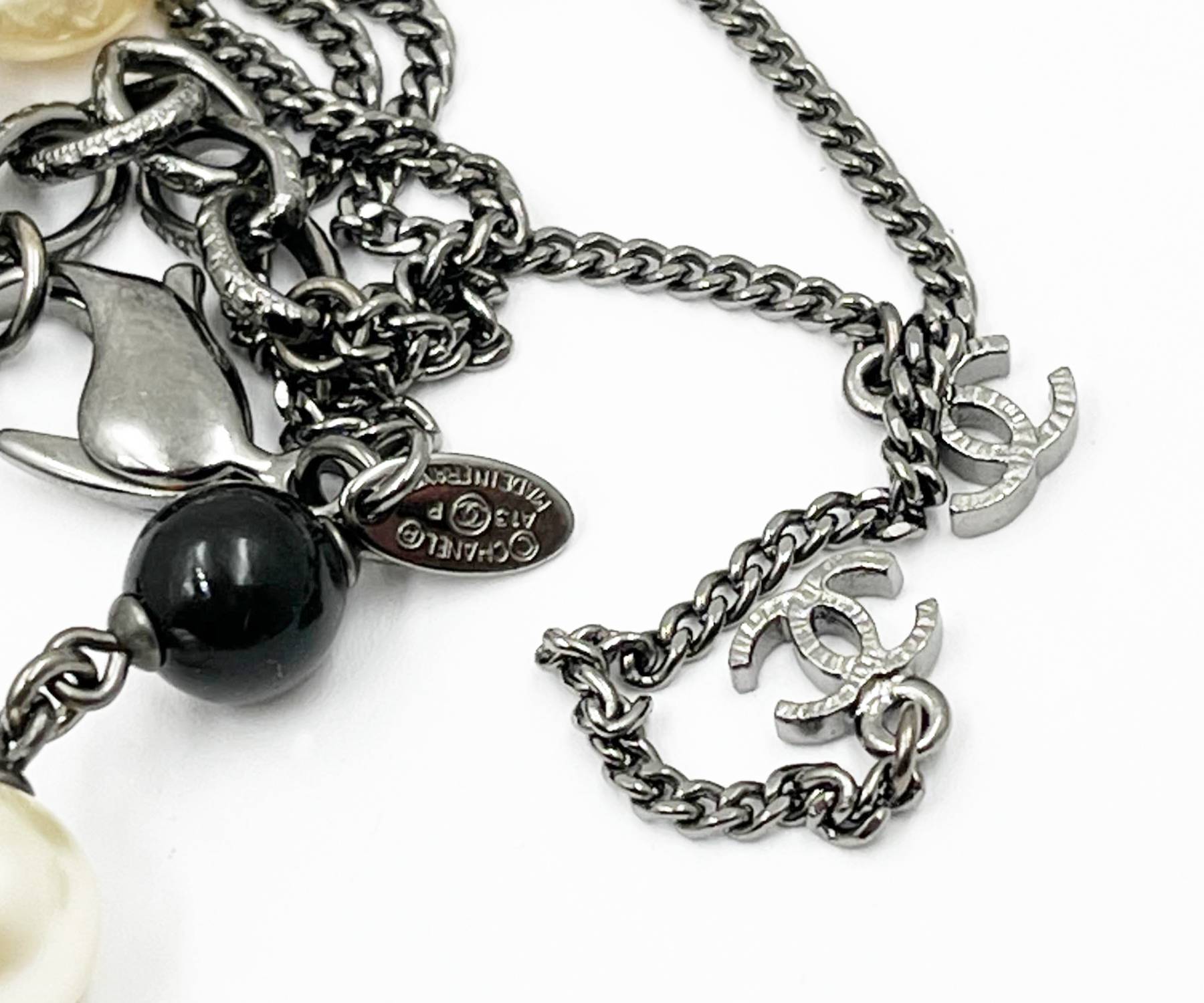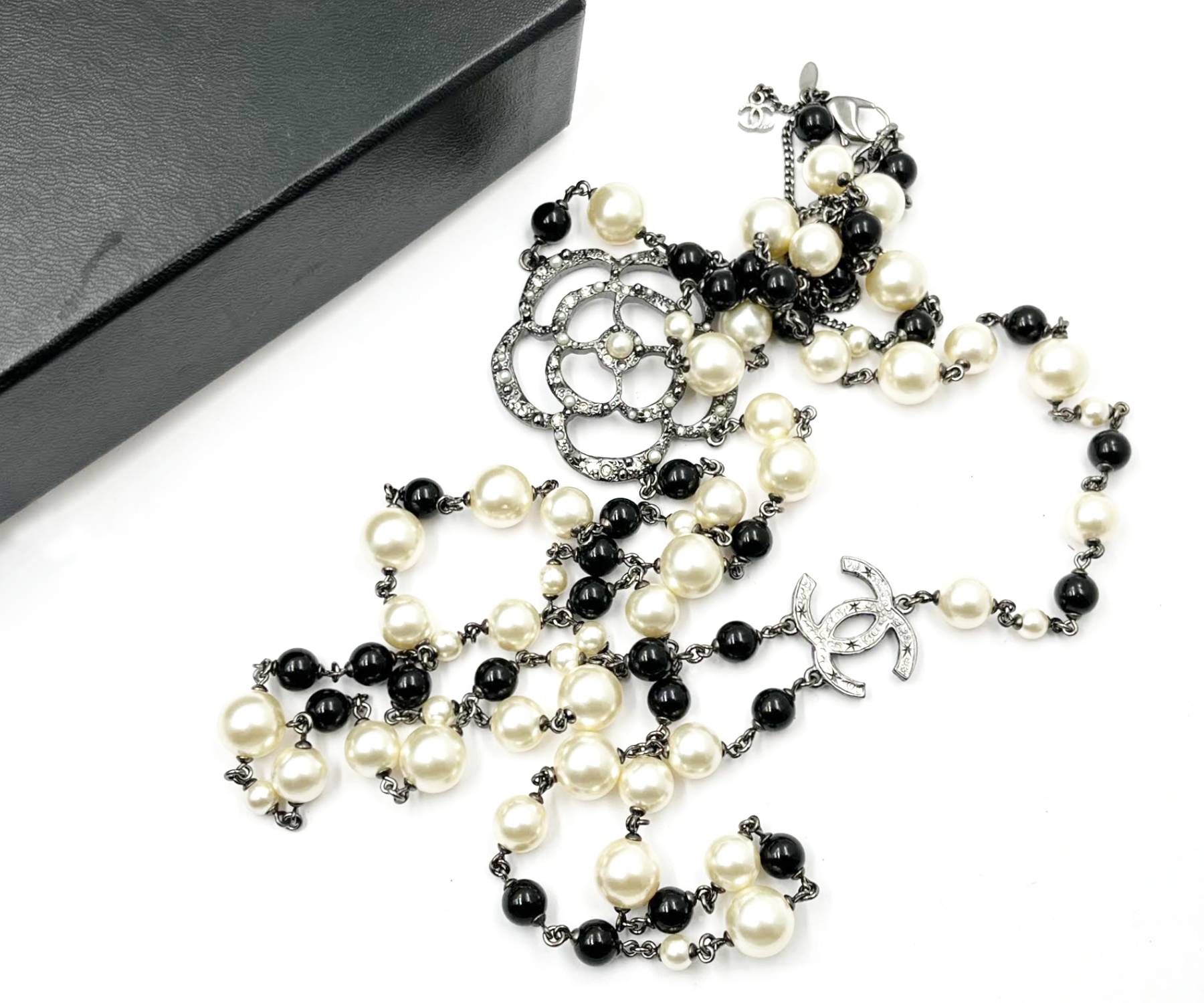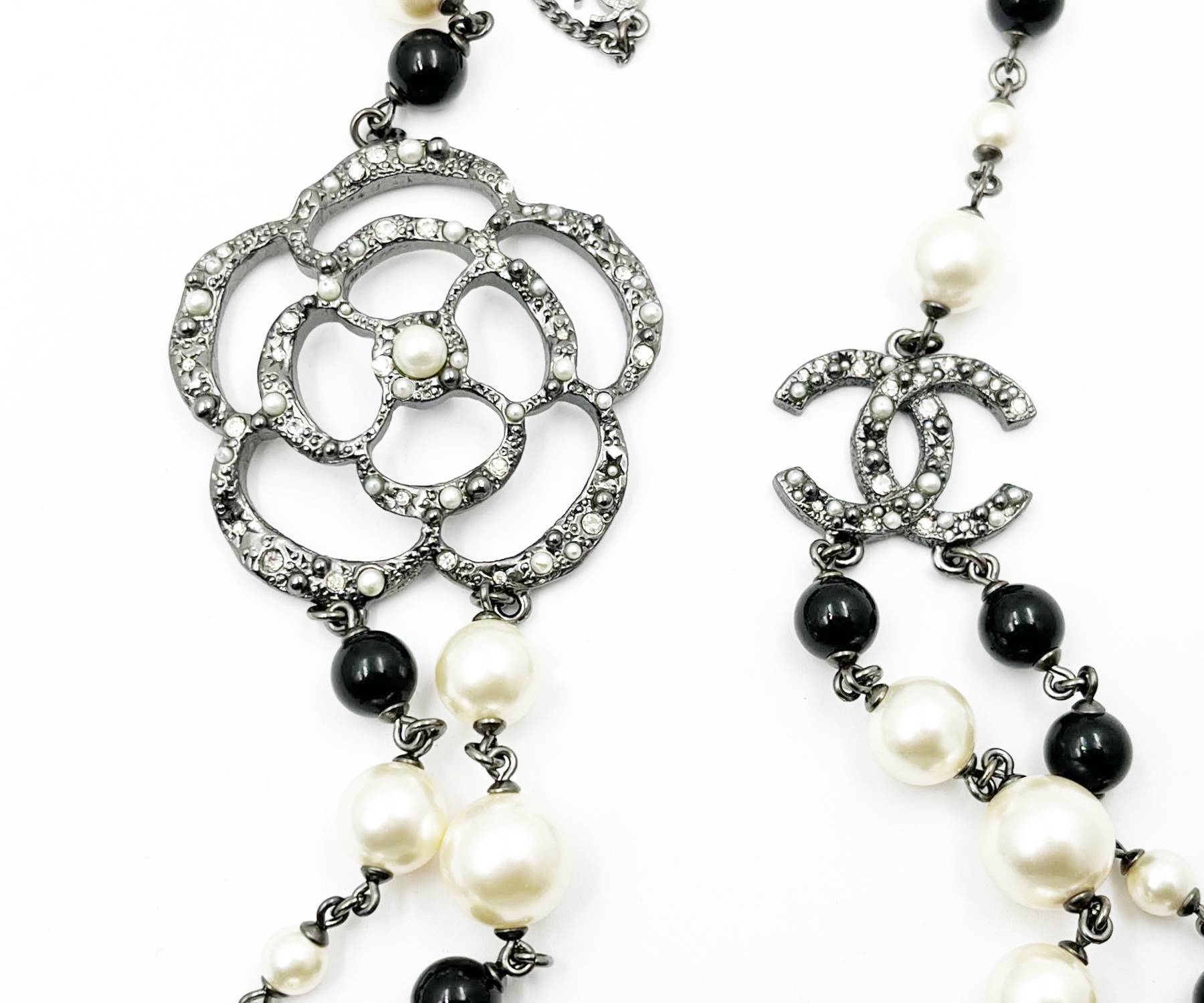 Chanel Gunmetal CC Camellia Pearl Black Beads 2 Strand Long Necklace