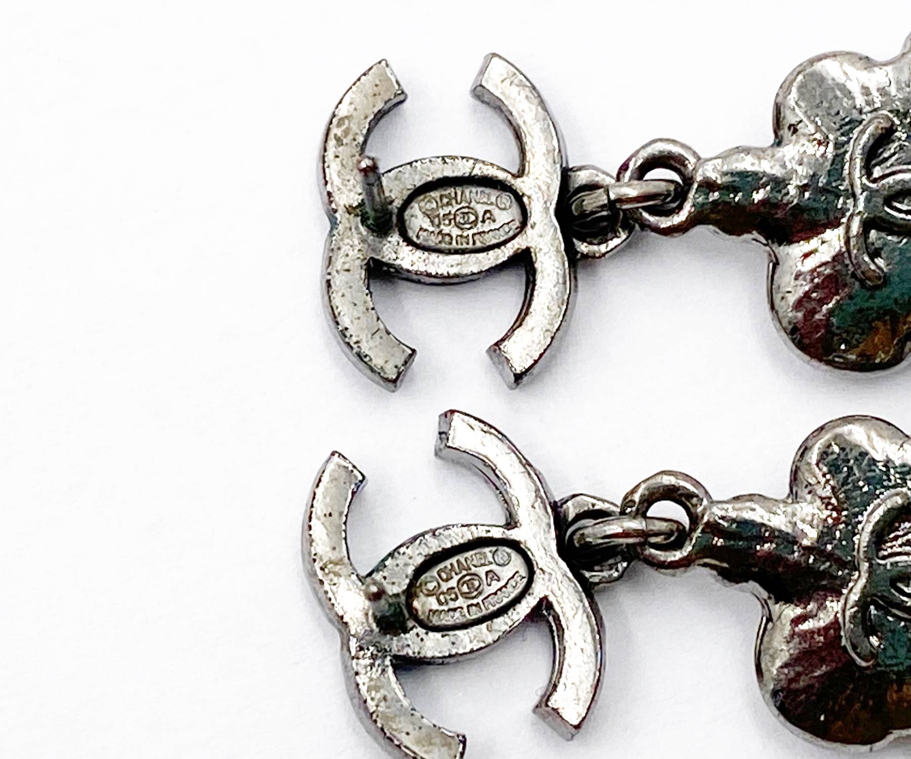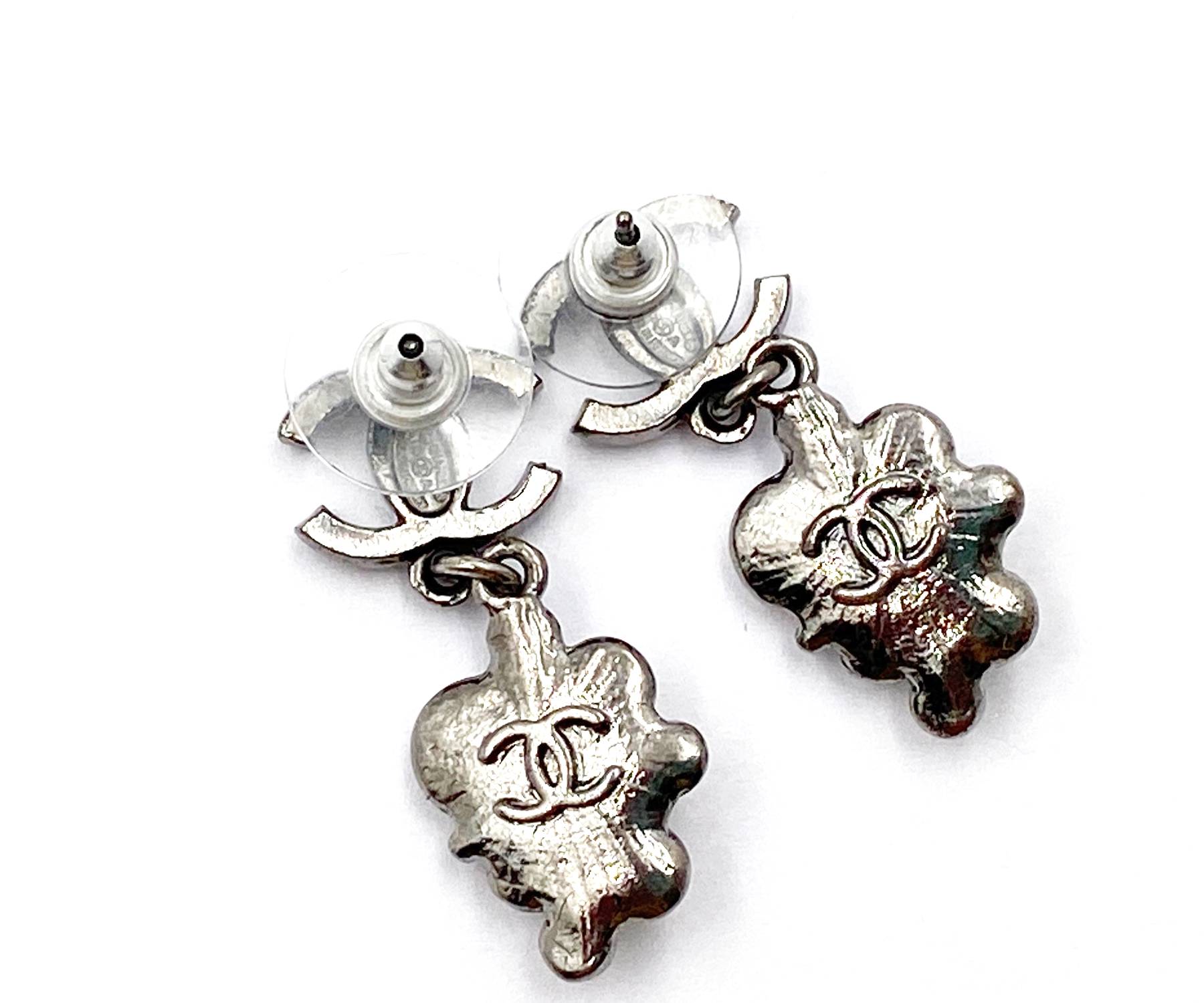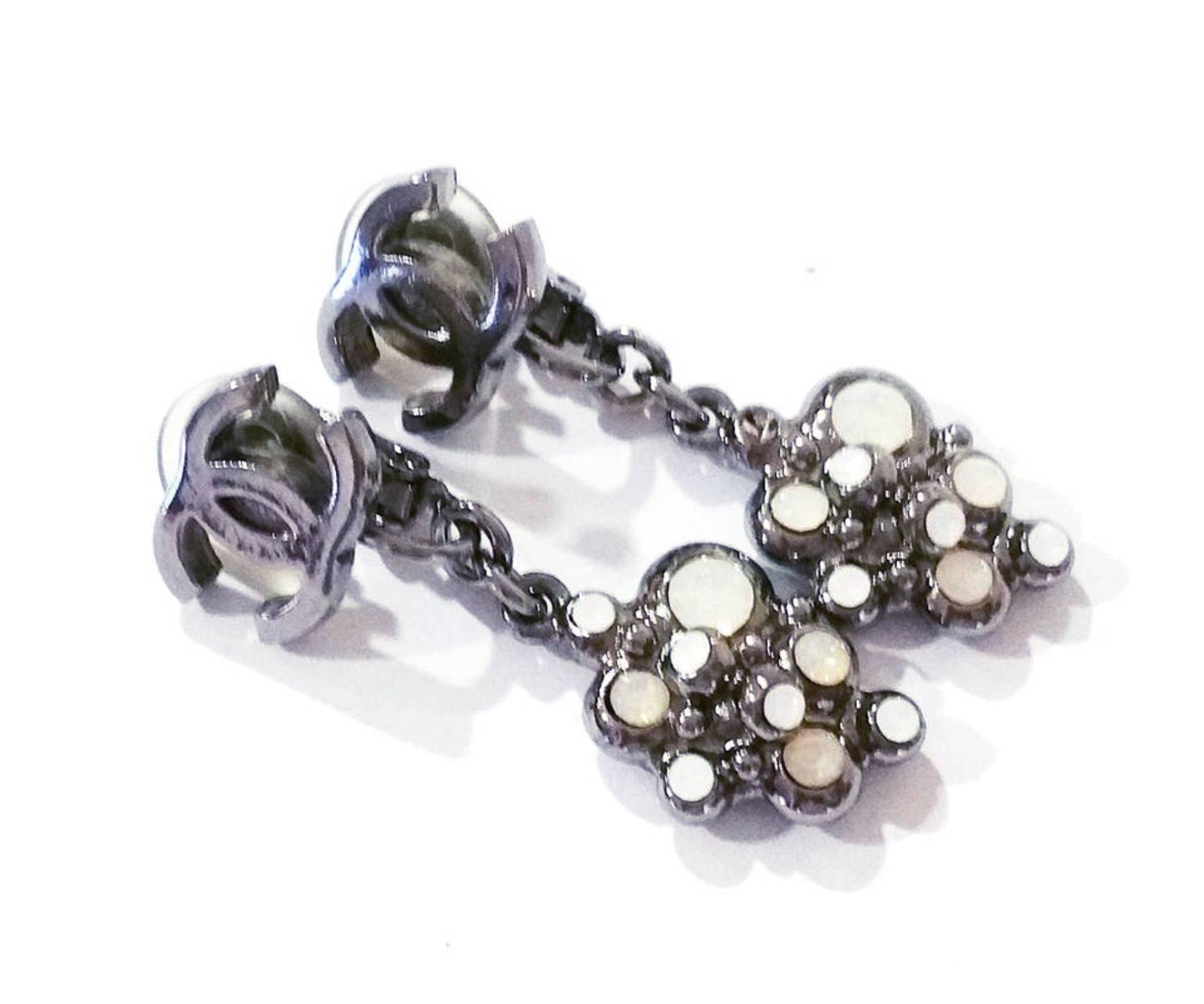 Chanel Gunmetal CC White Opal Stone Dangle Piercing Earrings