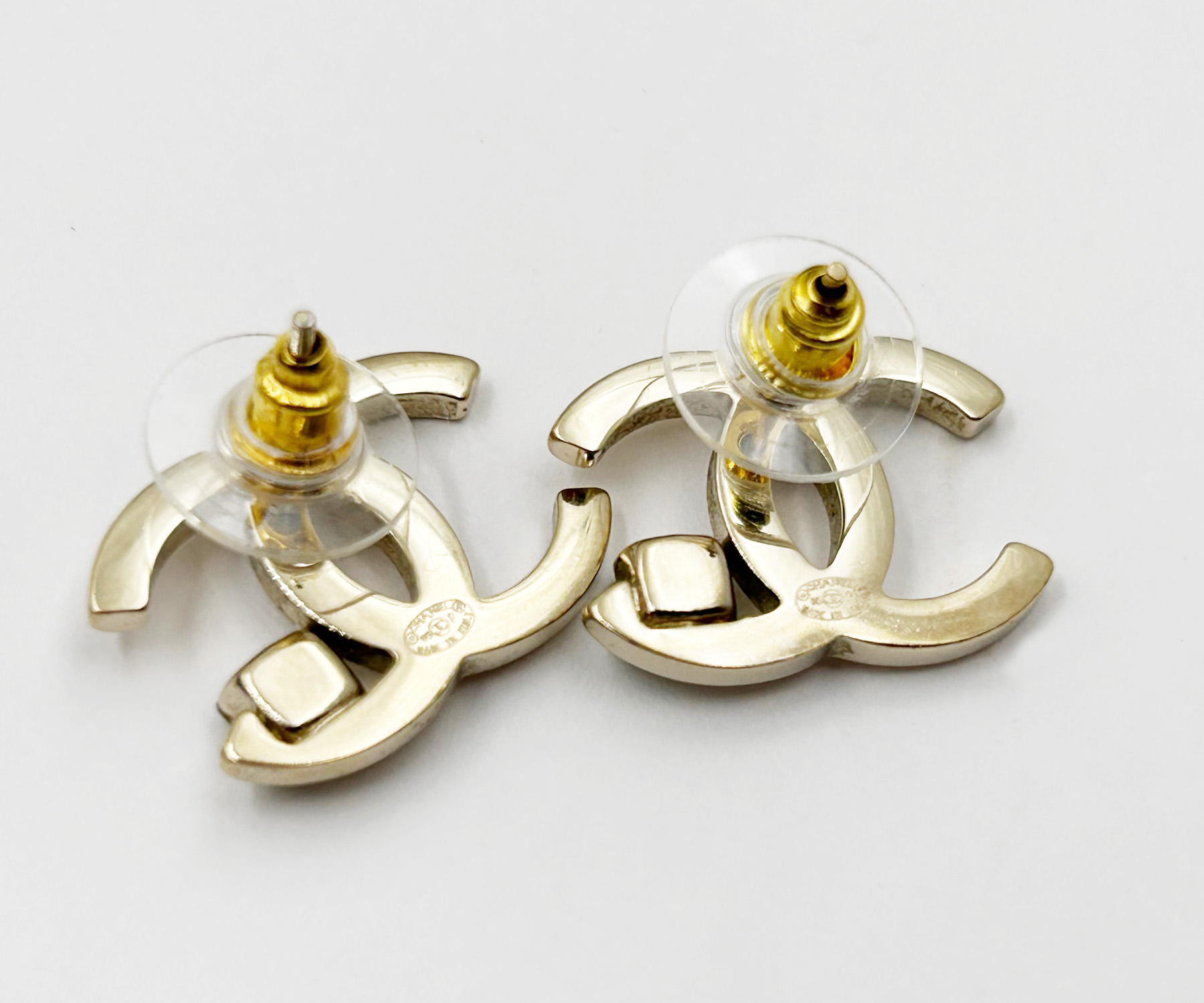 Chanel Light Gold CC Corner Green Crystal Piercing Earrings