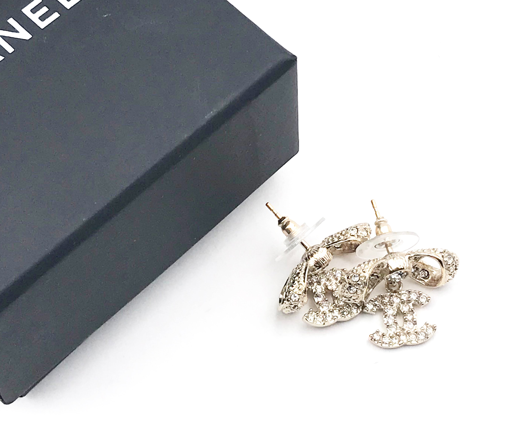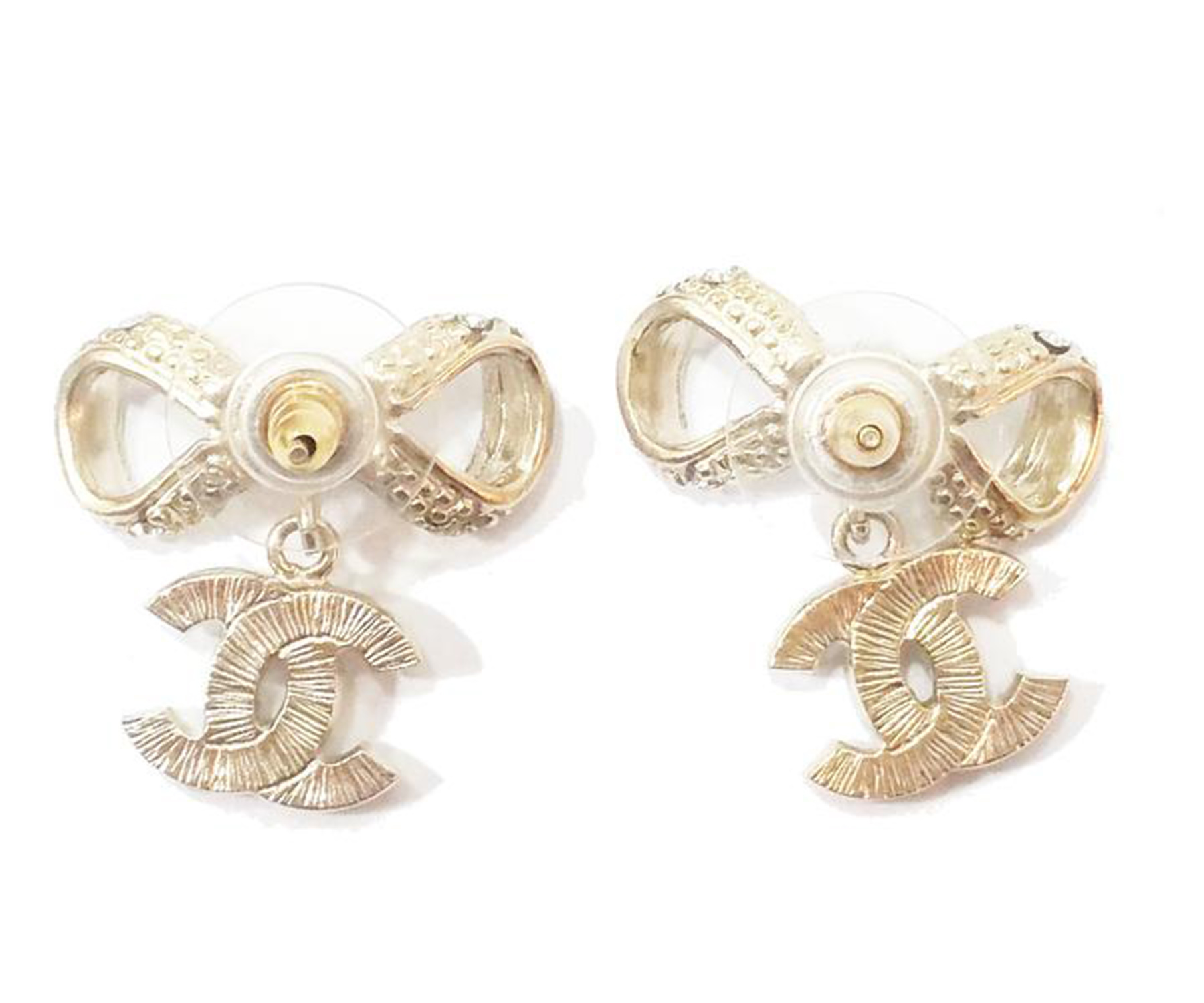 Chanel Light Gold Ribbon Bow CC Crystal Piercing Earrings
