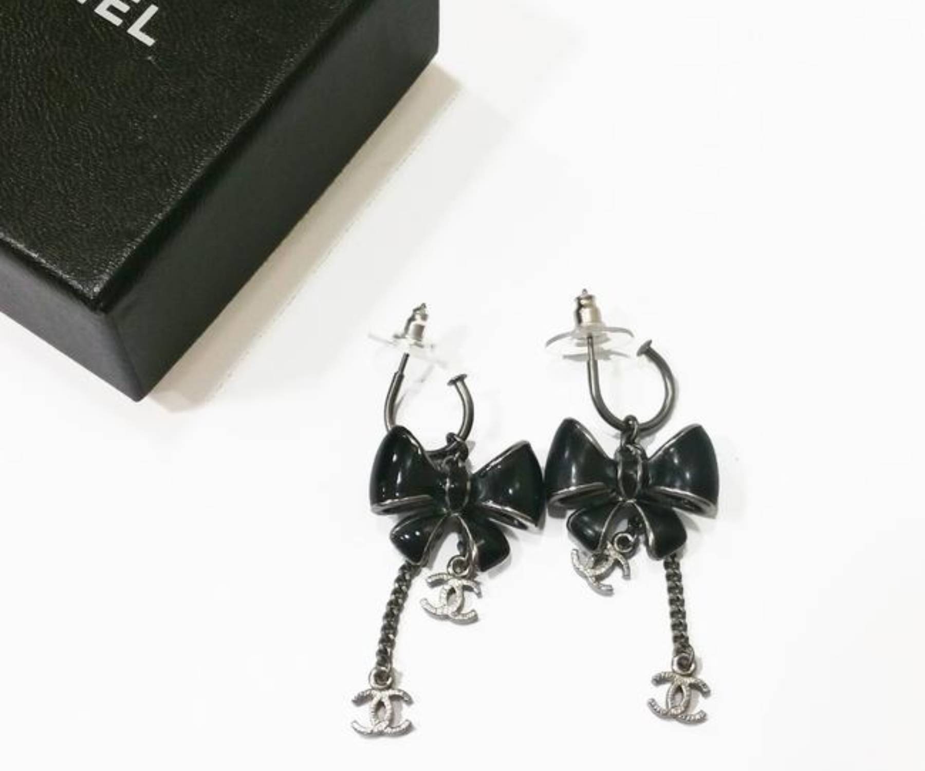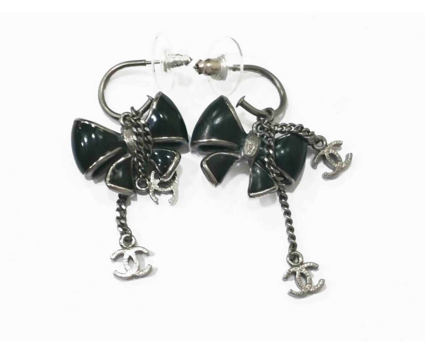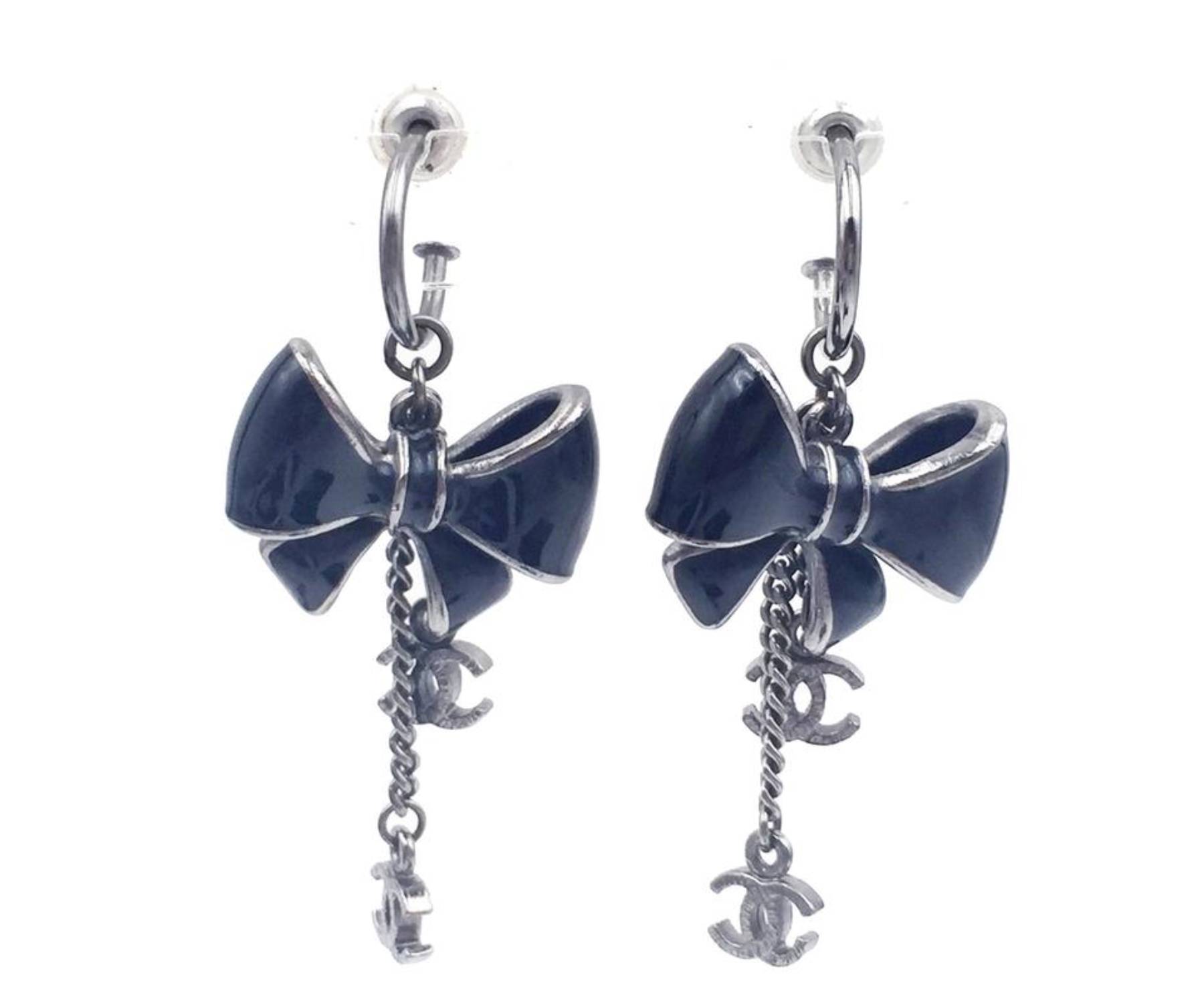 Chanel Rare Black Ribbon Bow CC Dangle Piercing Earrings