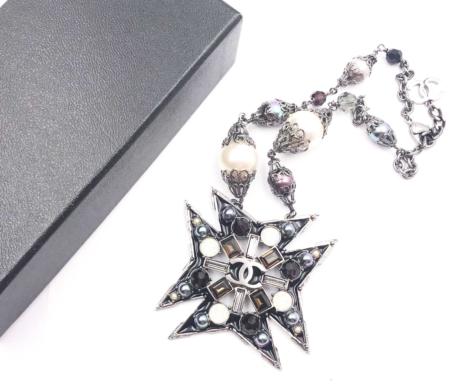 Chanel Rare Gunmetal Star Multi Color Stone Faux Pearl Necklace