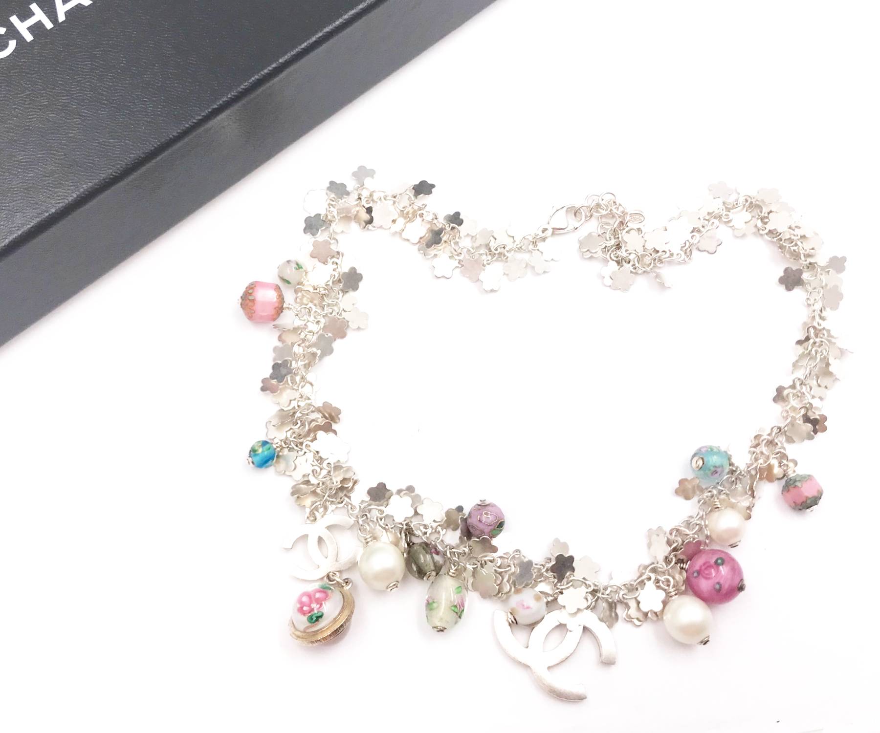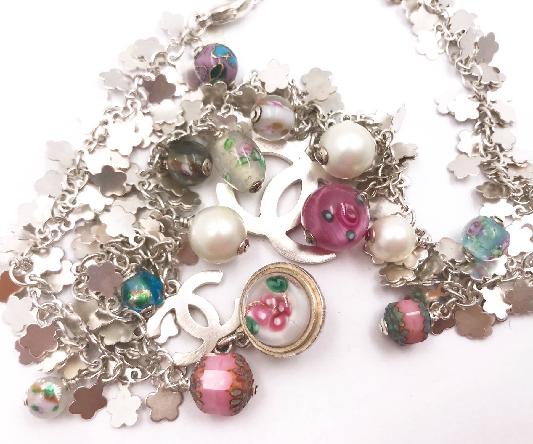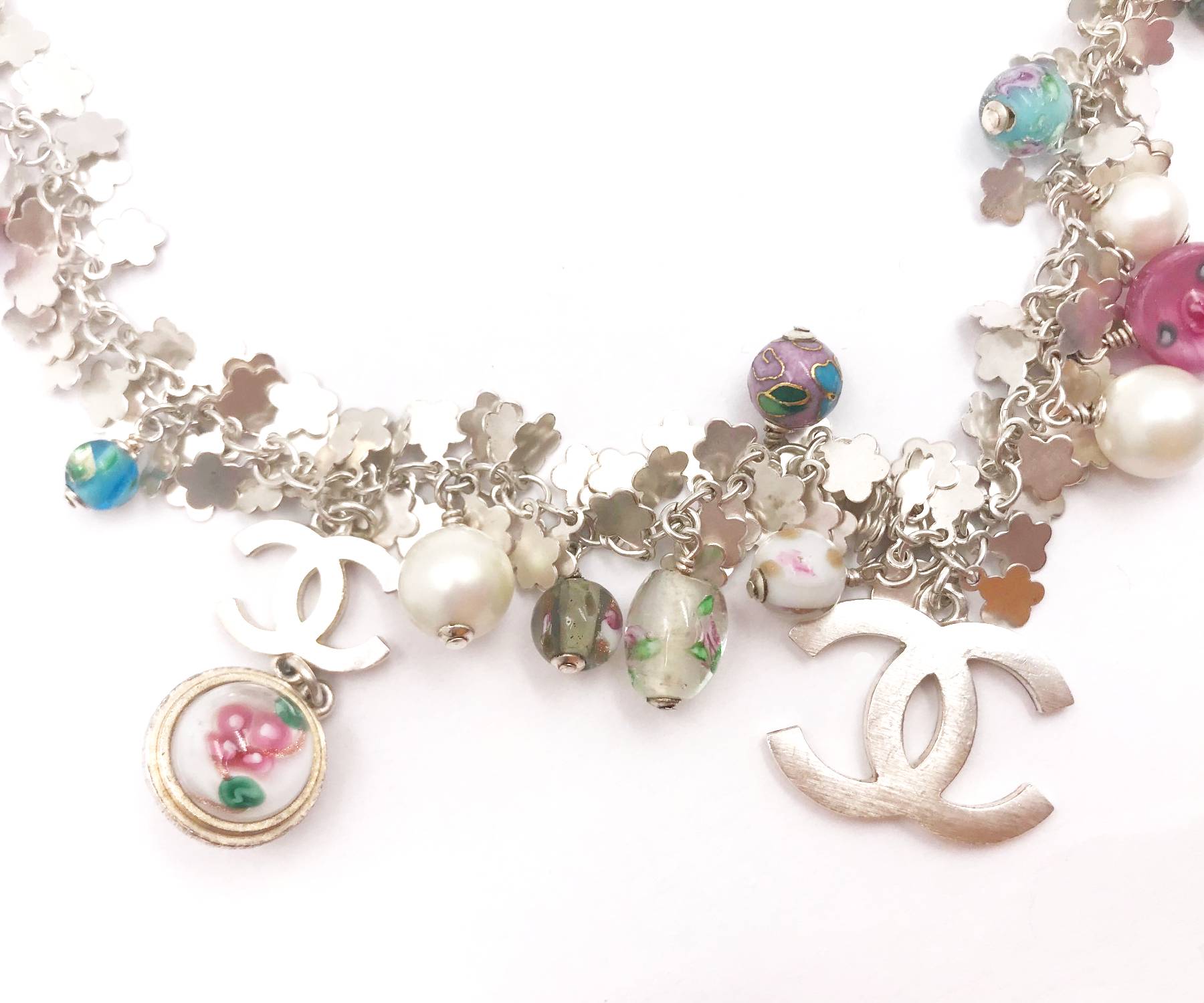 Chanel Rare Silver CC Flower Porcelain Bead Necklace