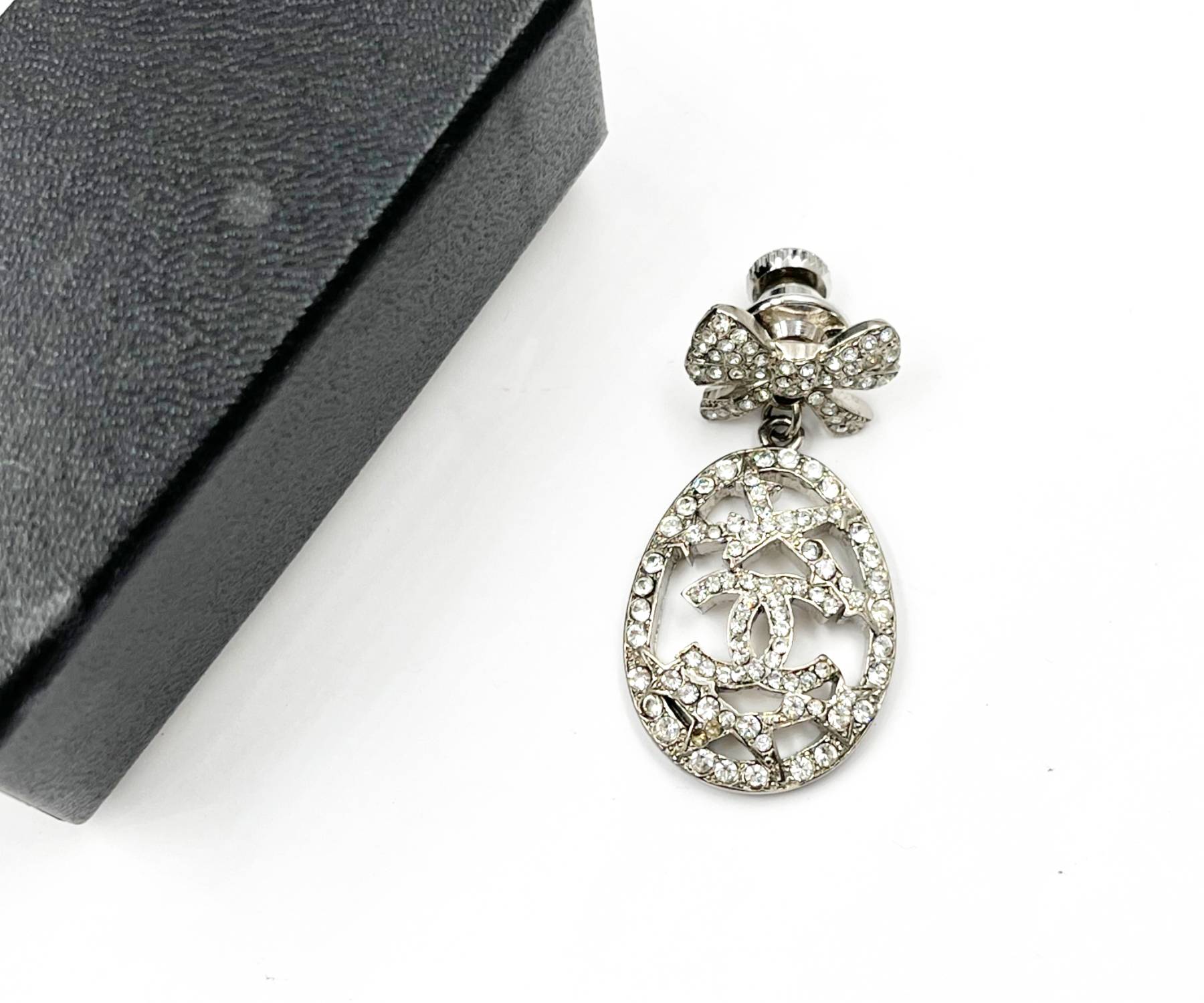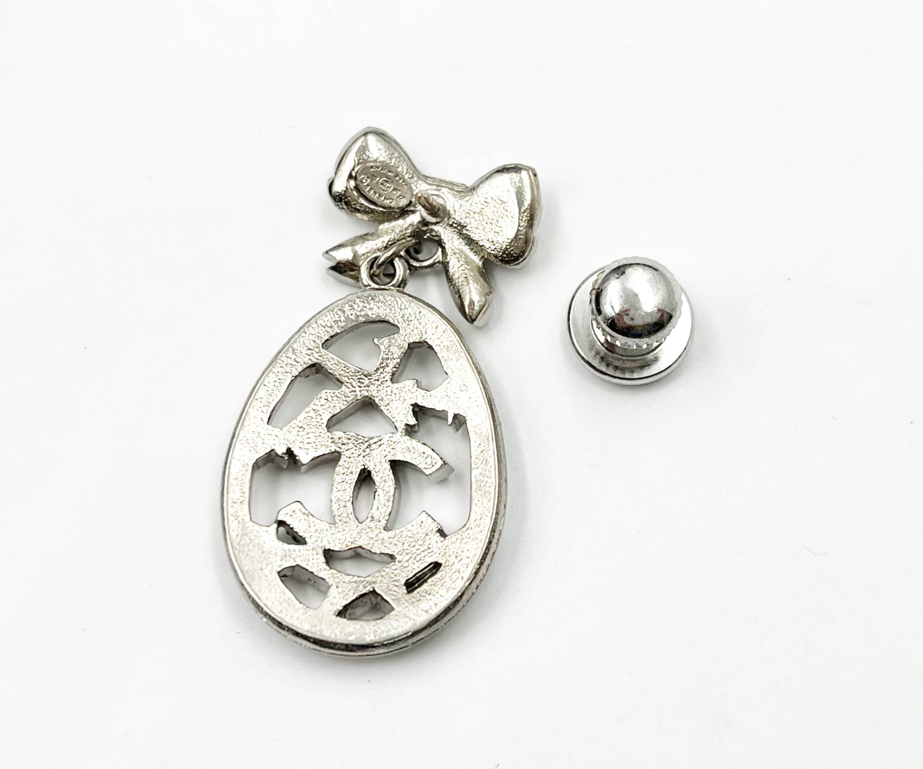 Chanel Rare Silver Ribbon Bow CC Egg Dangle Pin