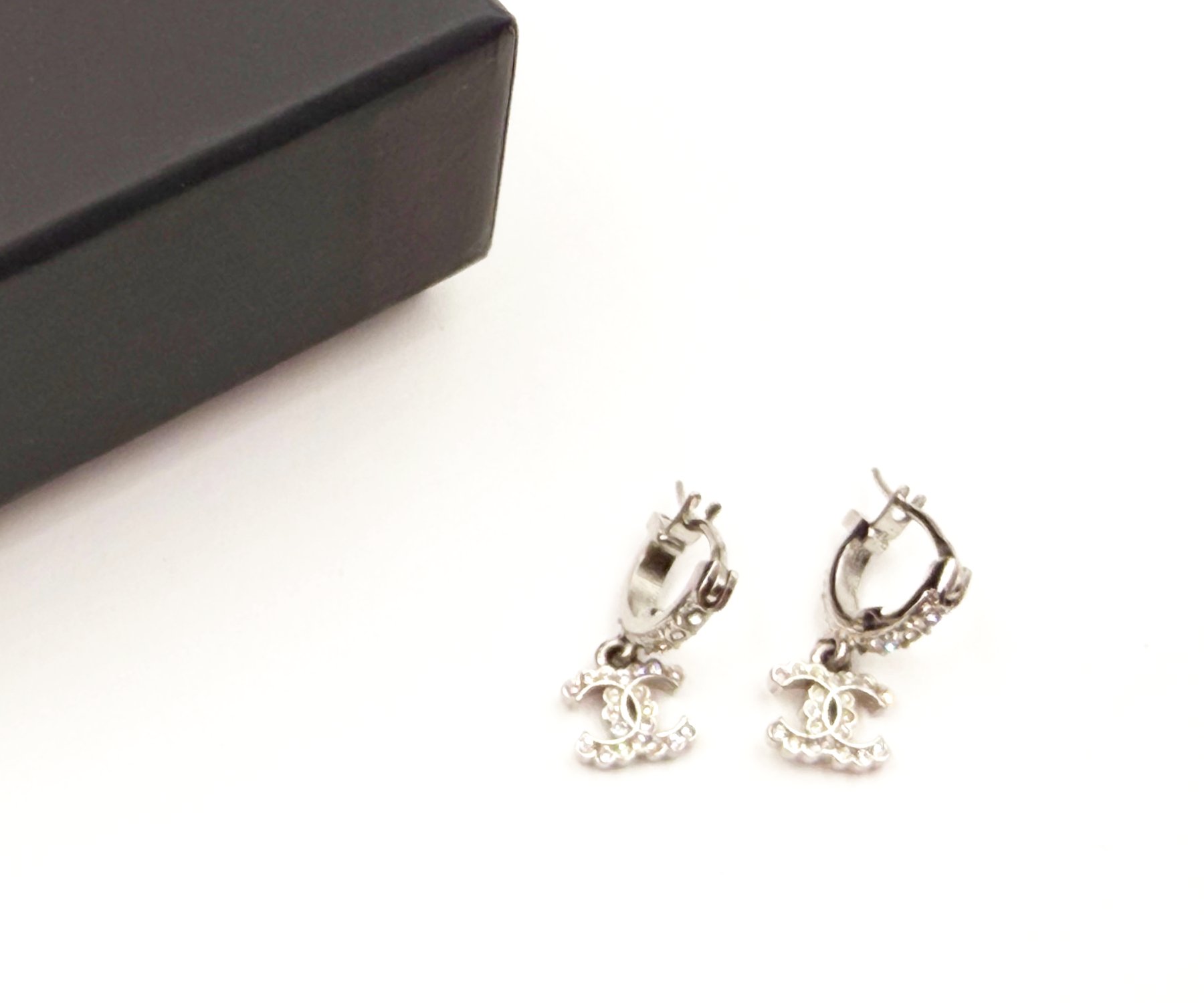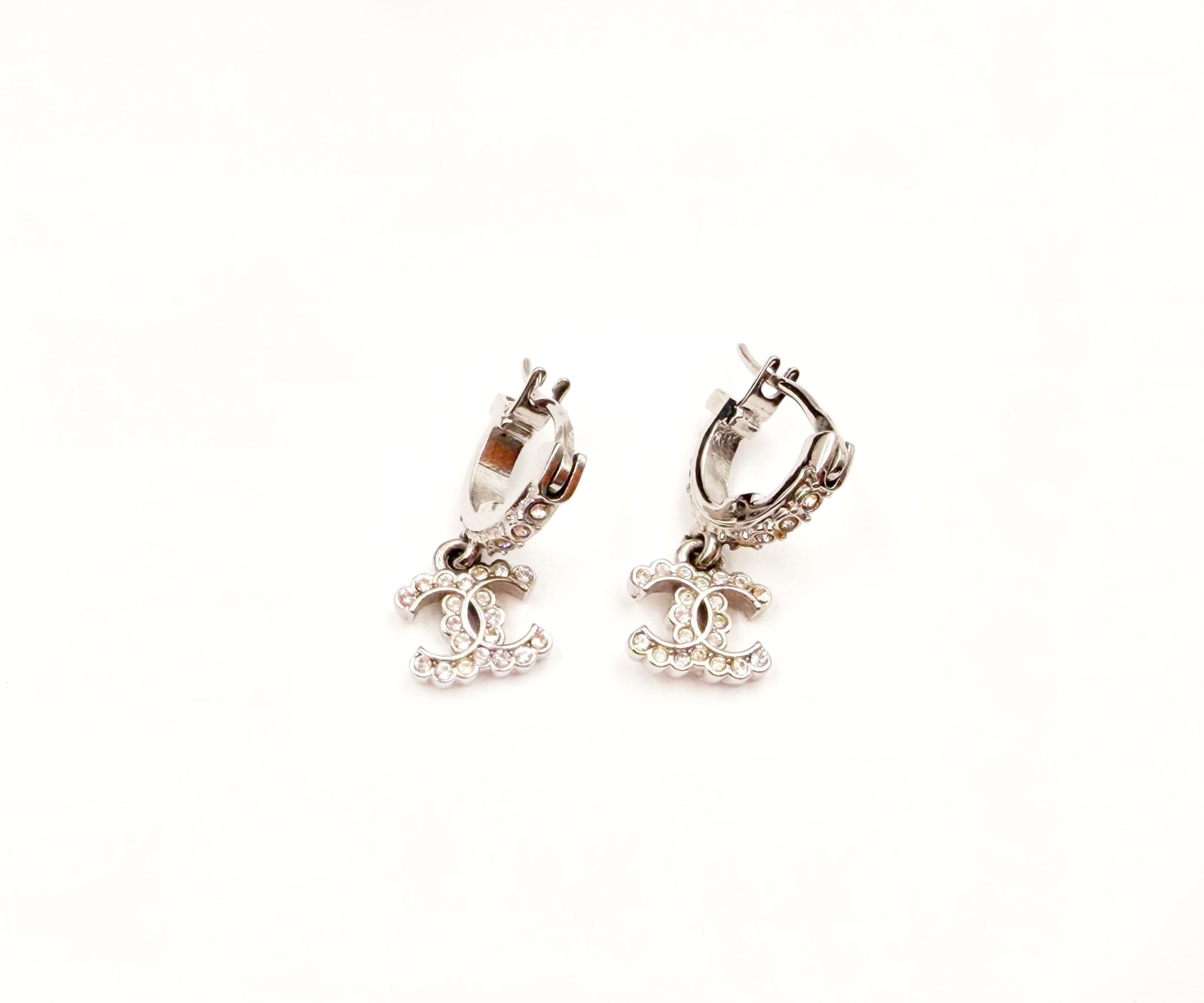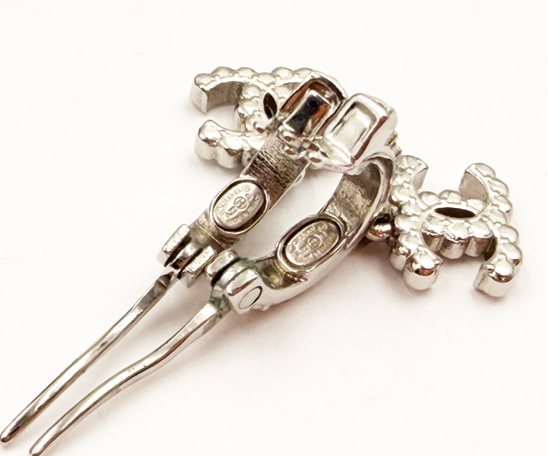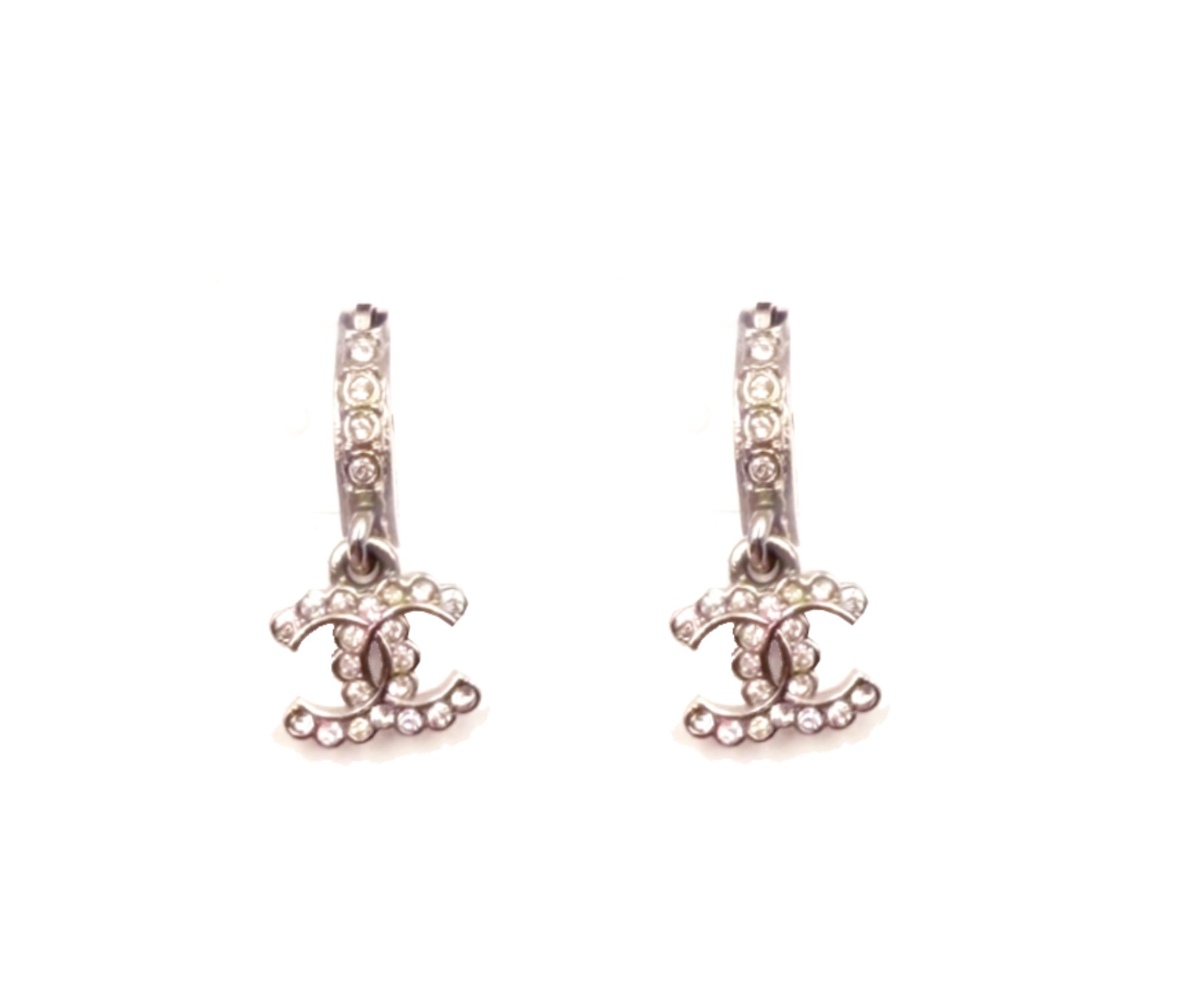 Chanel Silver Bar CC Ruffle Crystal Hoop Earrings