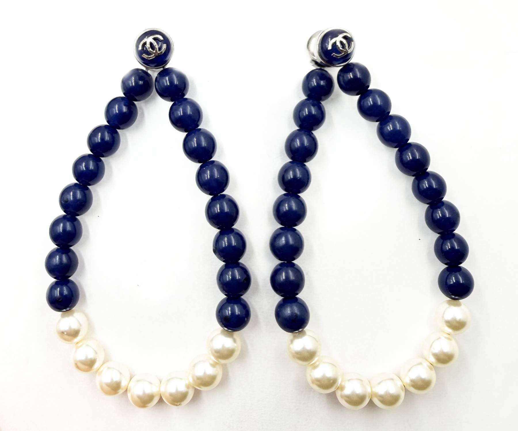Chanel Silver CC Blue Bead Pearl Large Loop Magnetic Earrings
