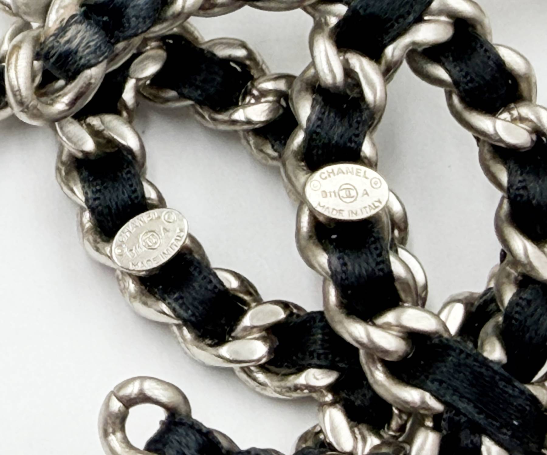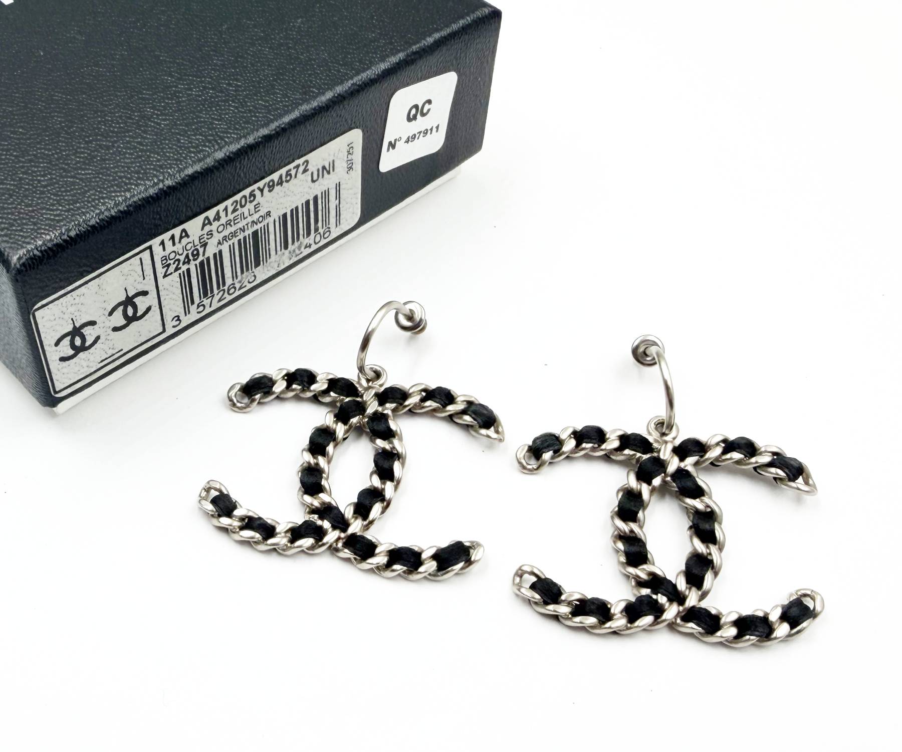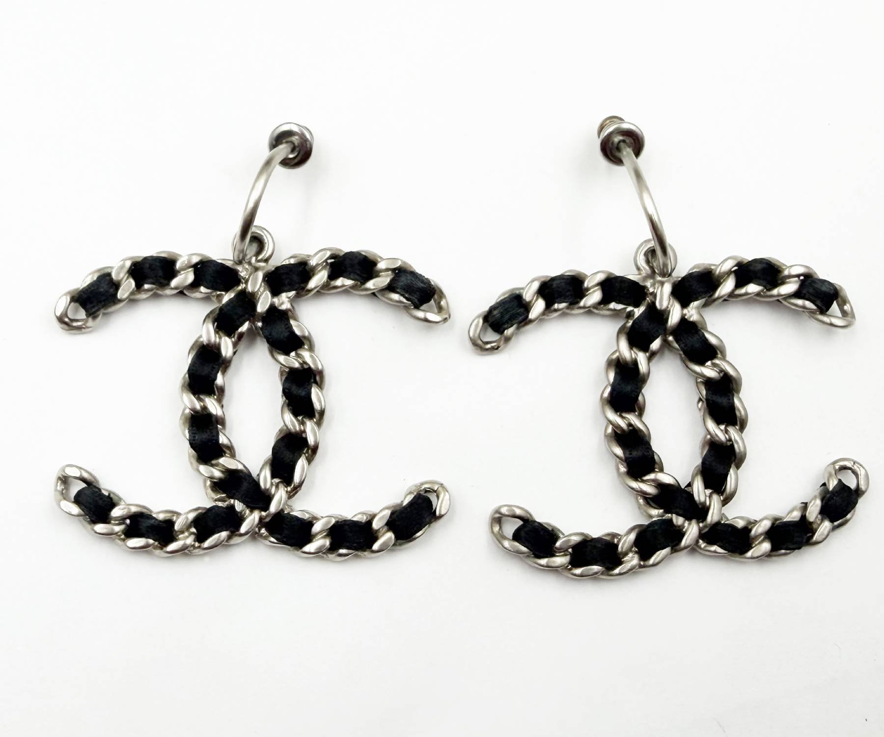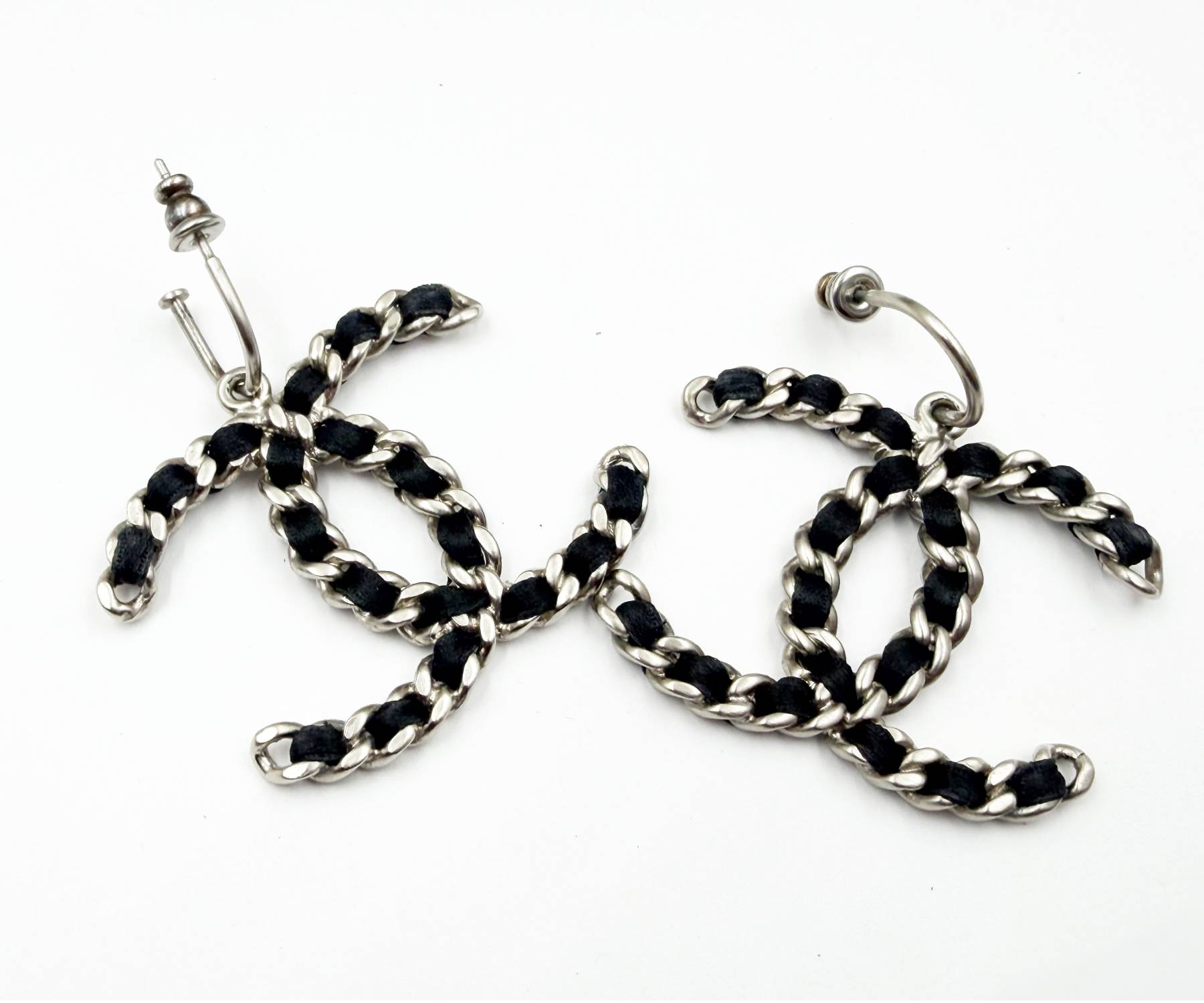 Chanel Silver CC Chain Black Ribbon XL Hoop Earrings