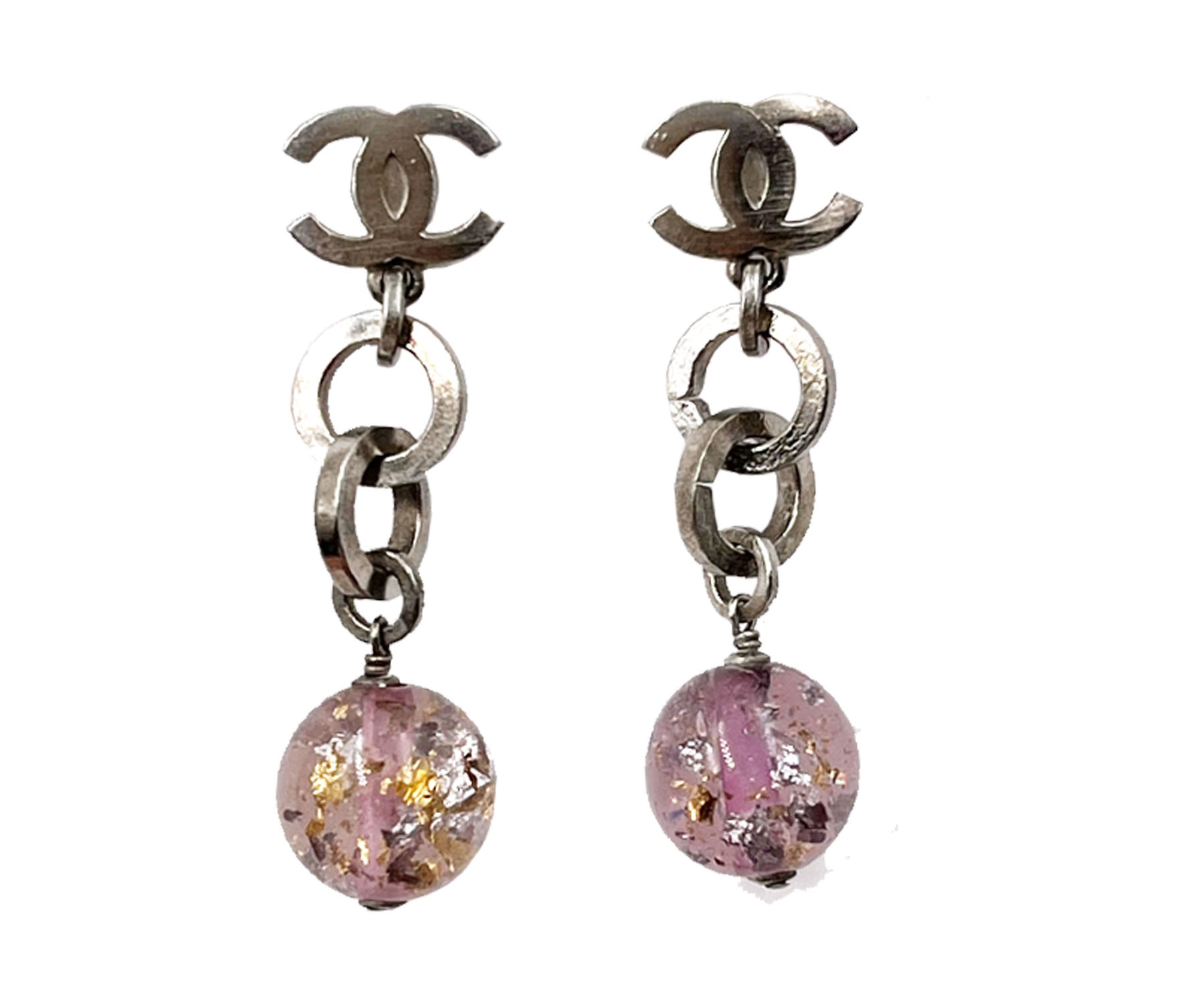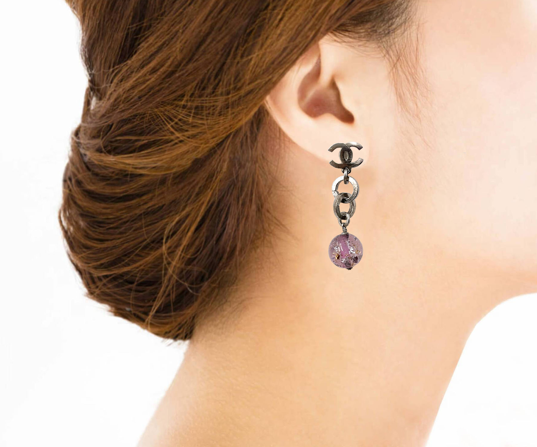Chanel Silver CC Chain Purple Bead Long Piercing Earrings