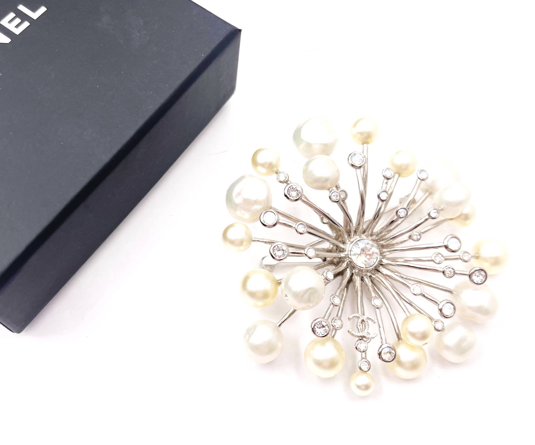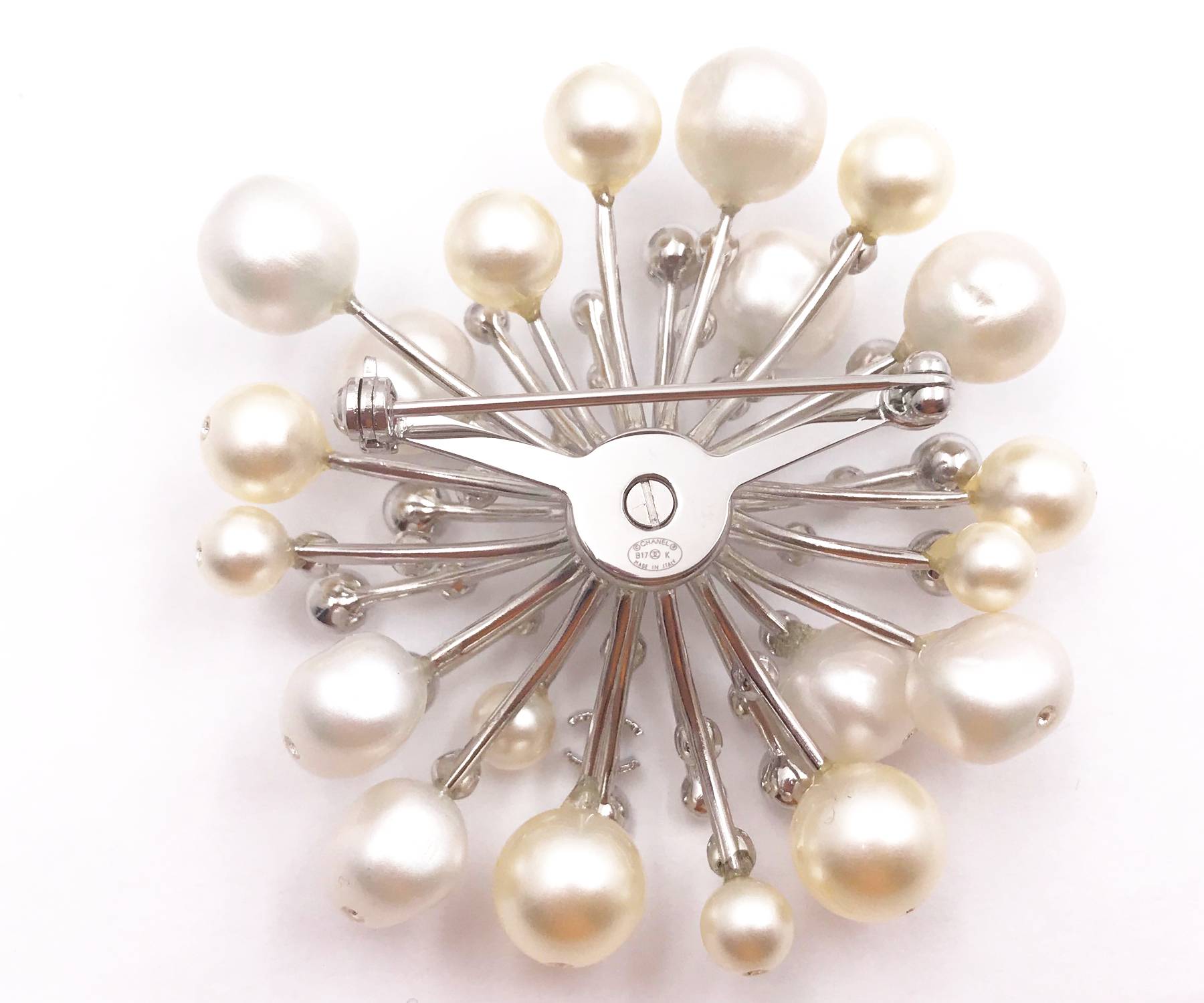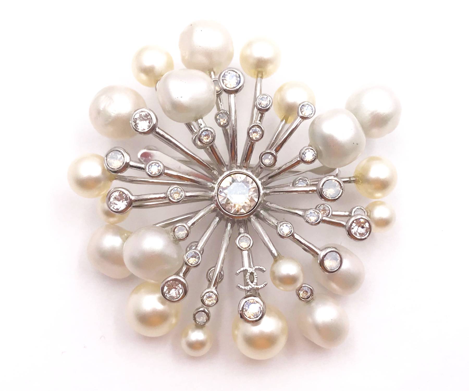 Chanel Silver CC Fresh Water Pearl Crystal Spiky Brooch