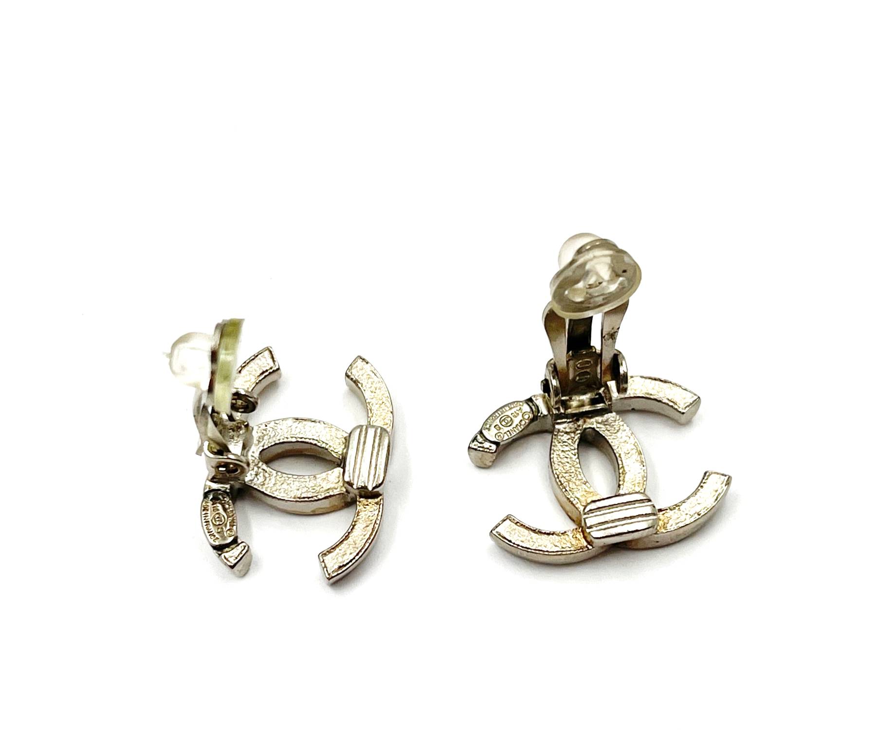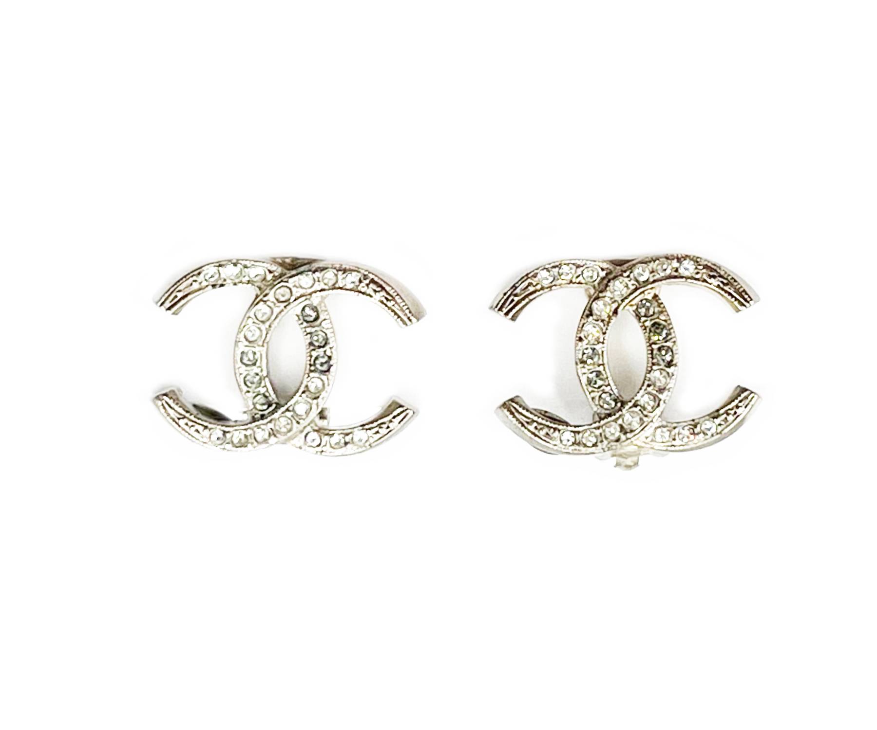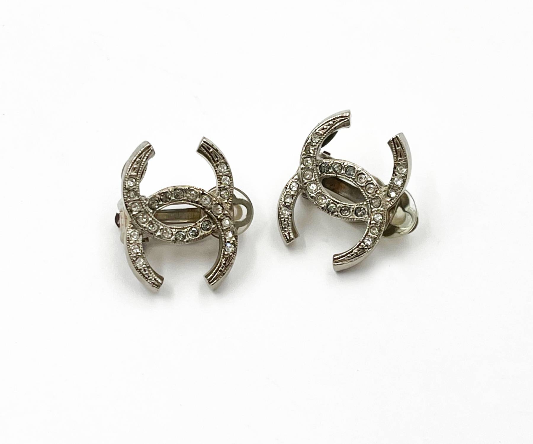 Chanel Silver CC Grey Crystal Clip on Earrings