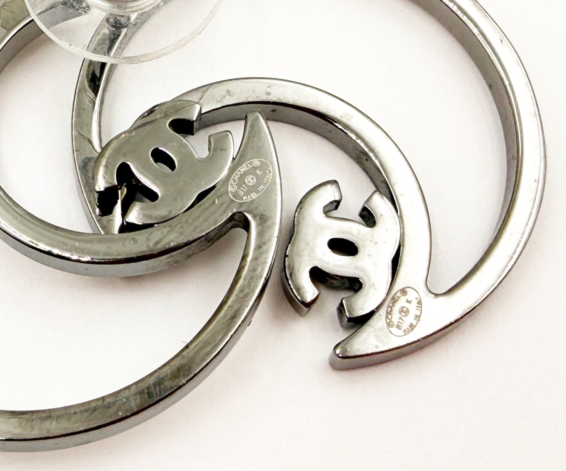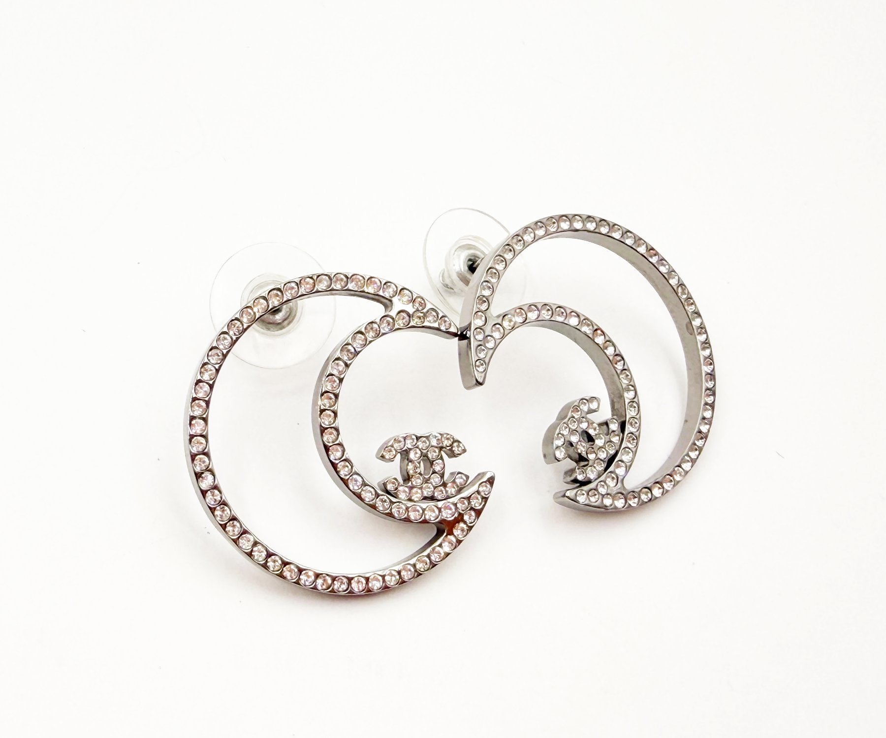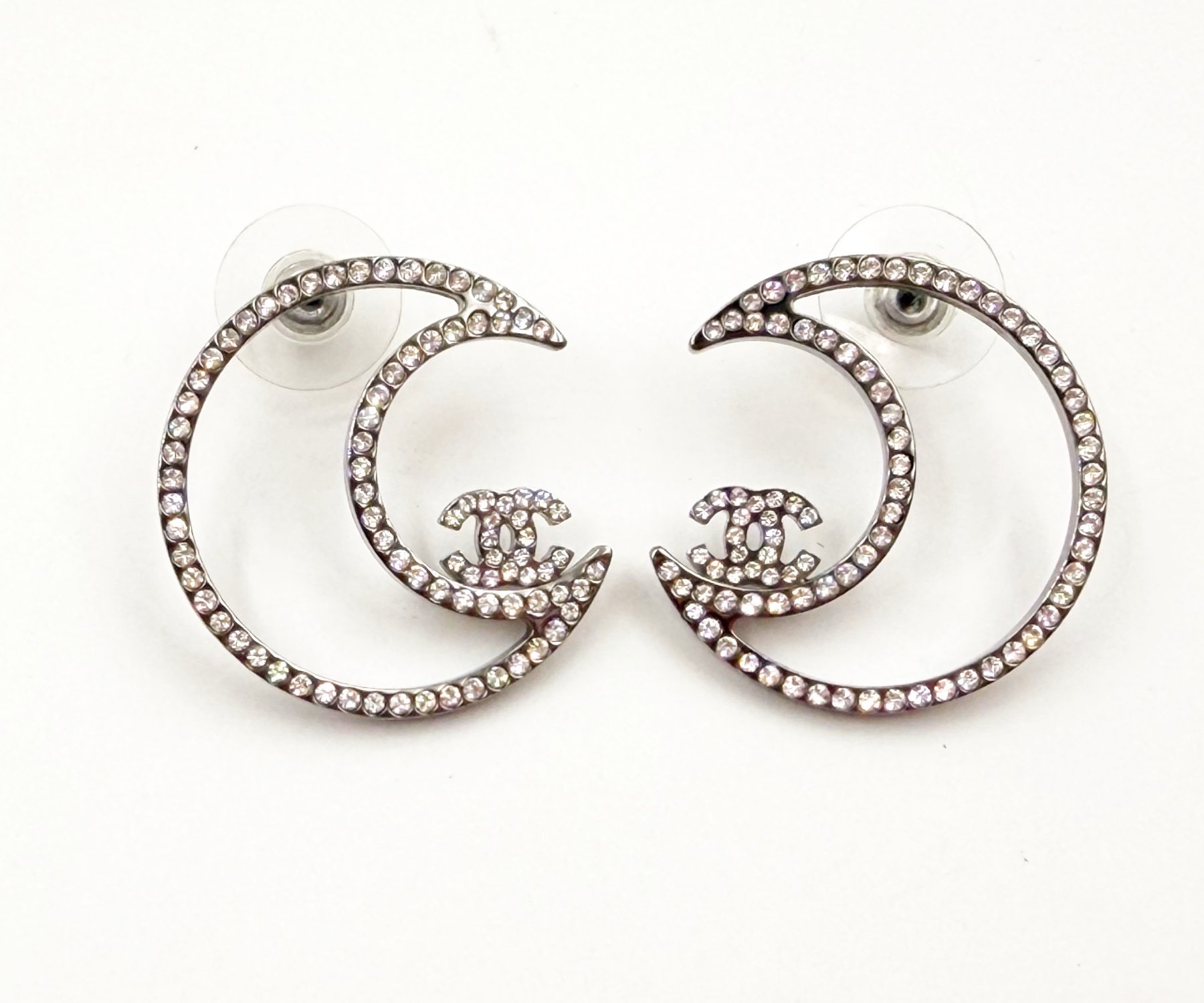 Chanel Silver CC Half Moon Crystal Piercing Earrings