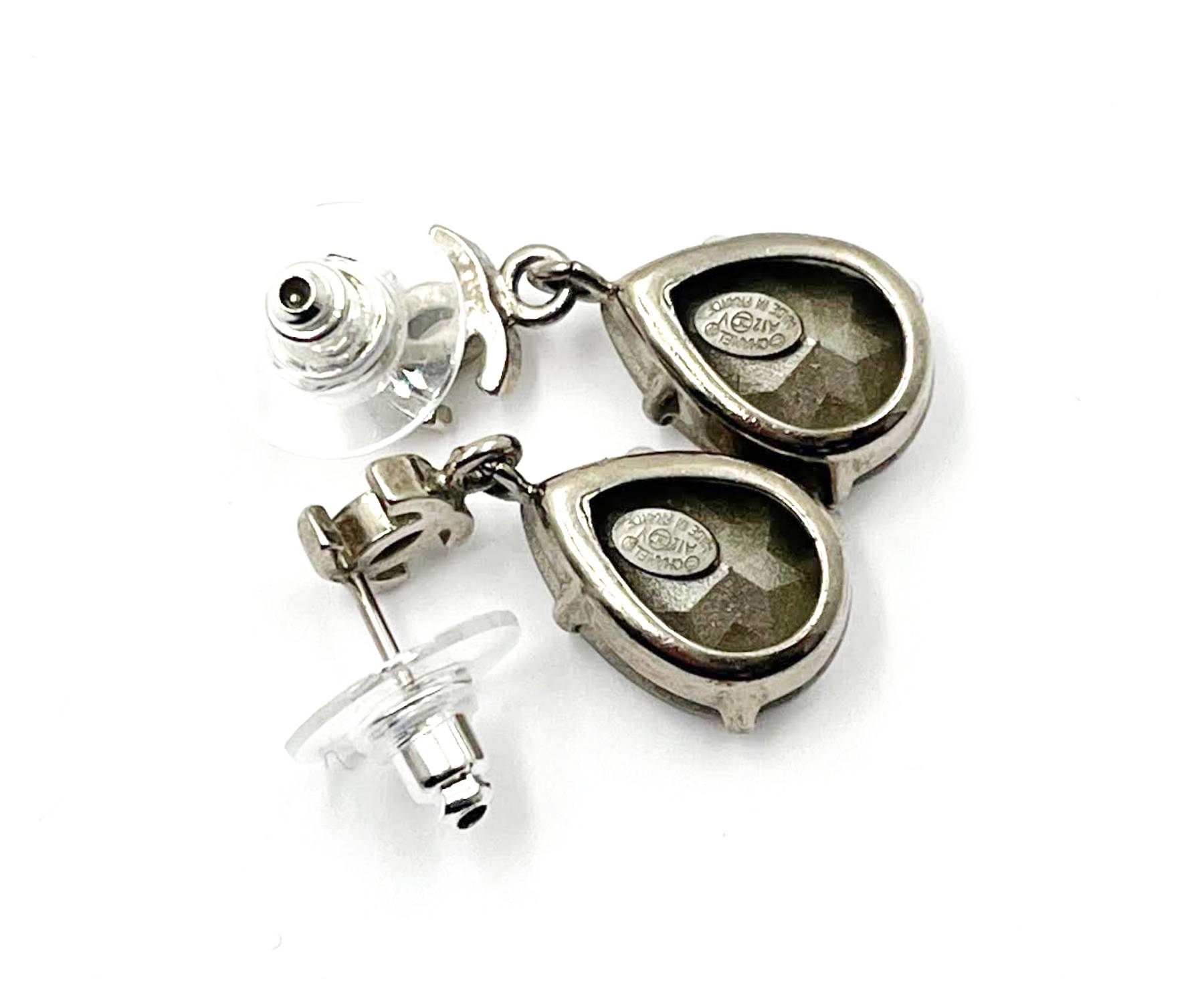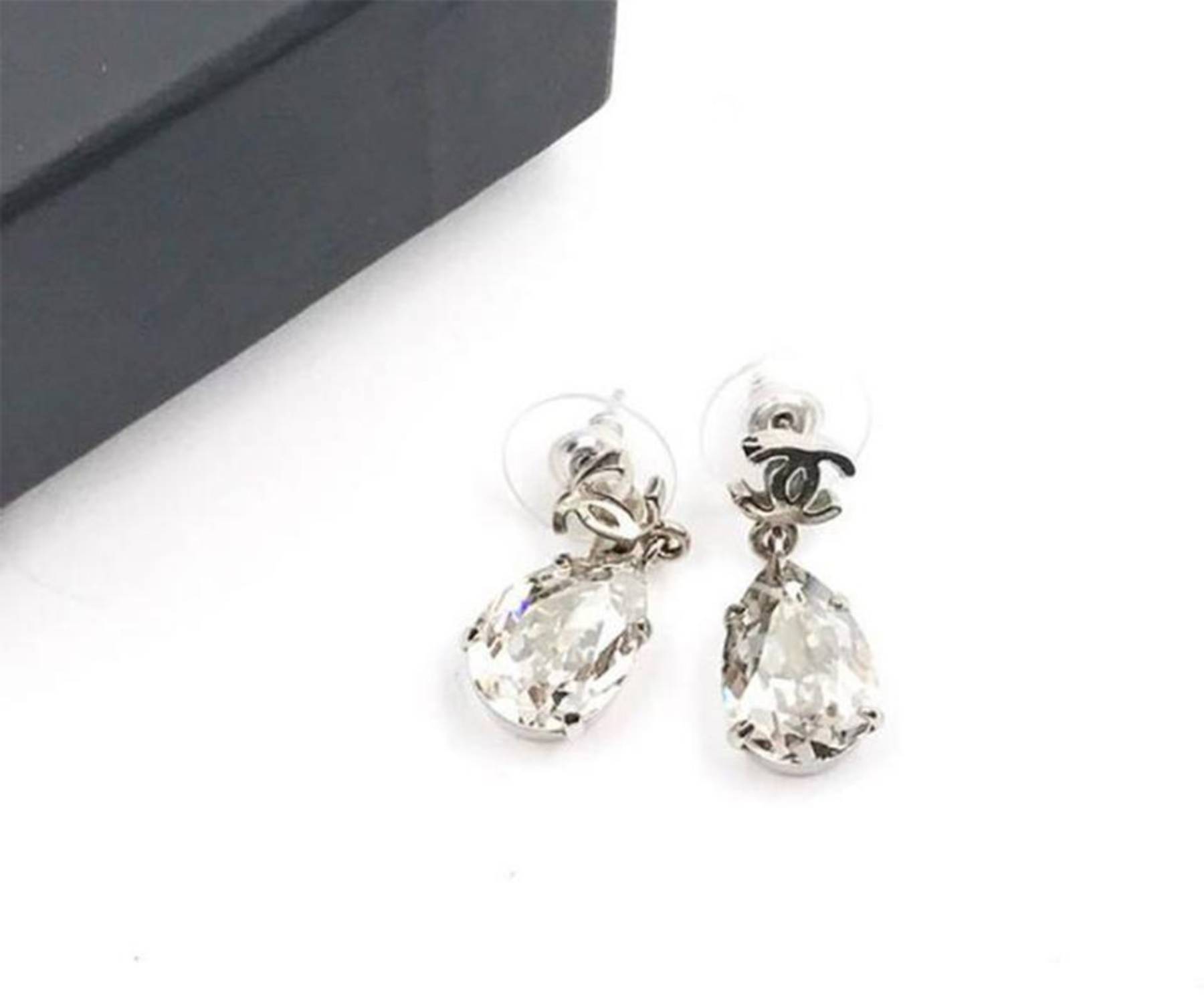 Chanel Silver CC Tear Drop Crystal Shiny Piercing Earrings