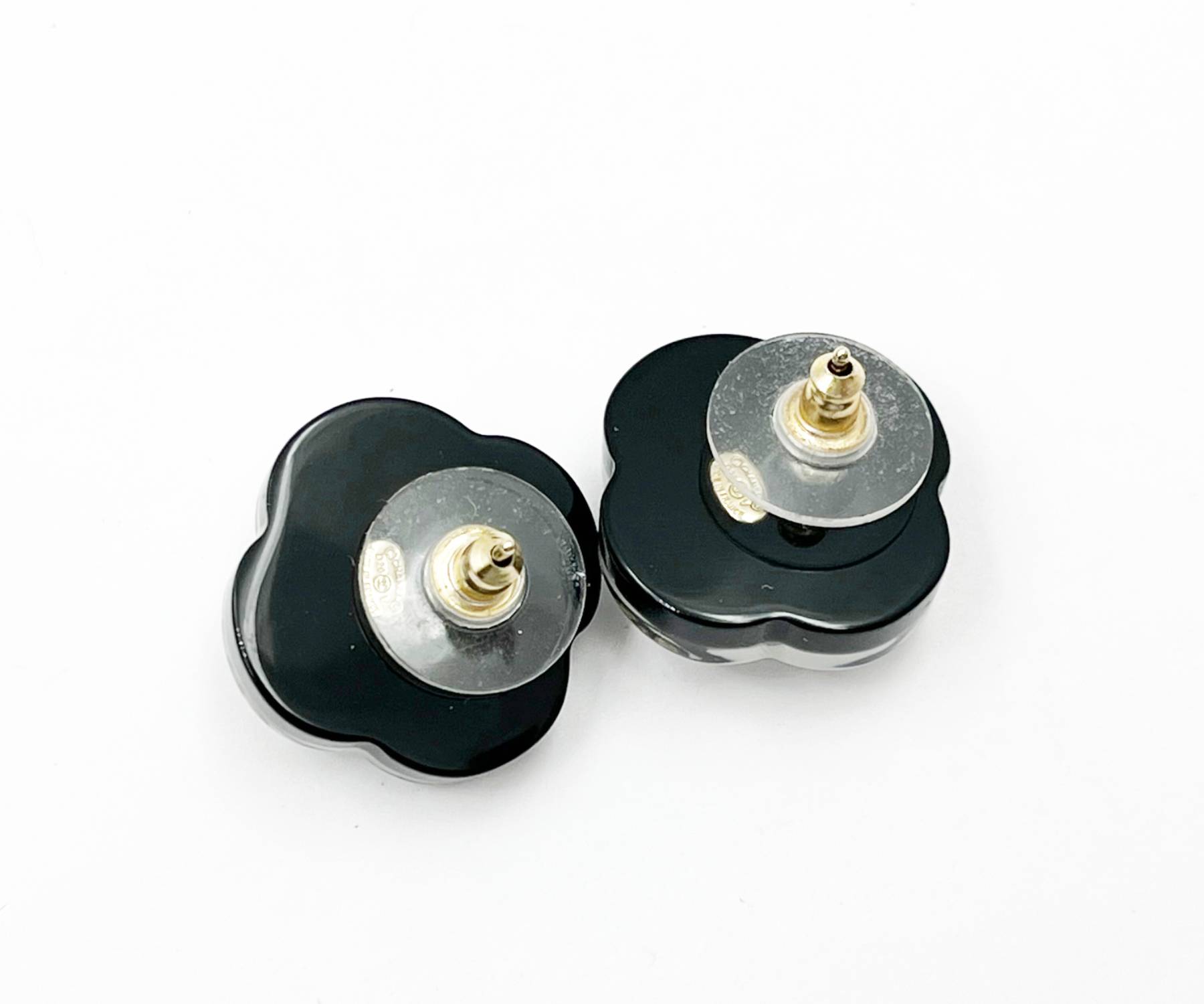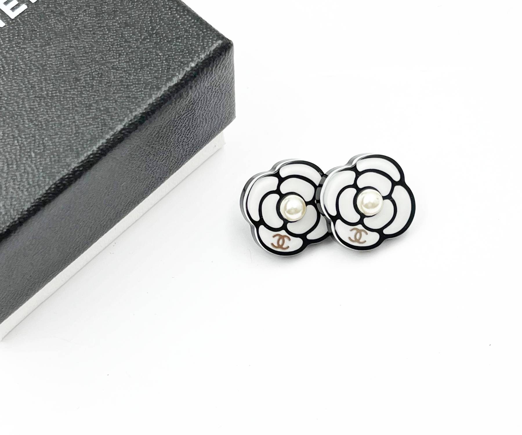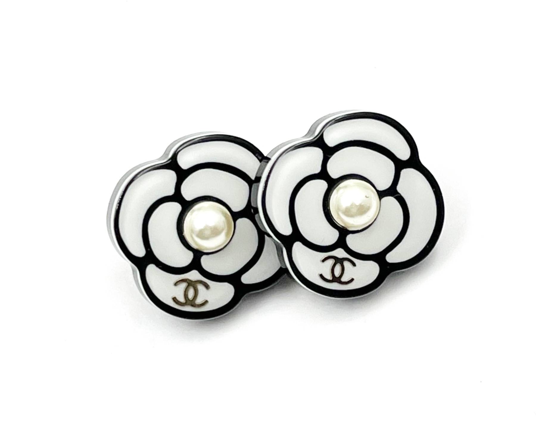 Chanel Silver CC White Black Camellia Pearl Piercing Earrings