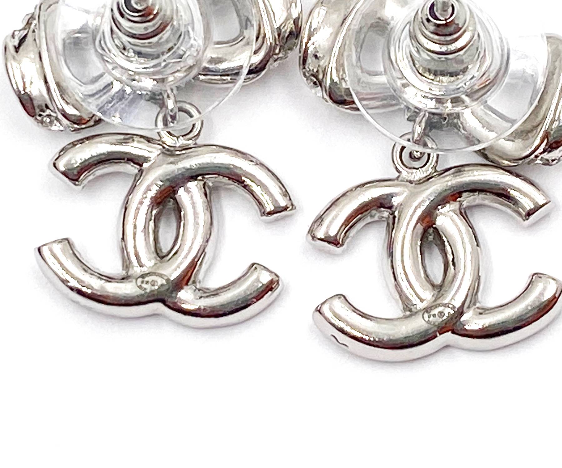Chanel Silver Ribbon CC Dangle Crystal Piercing Earrings