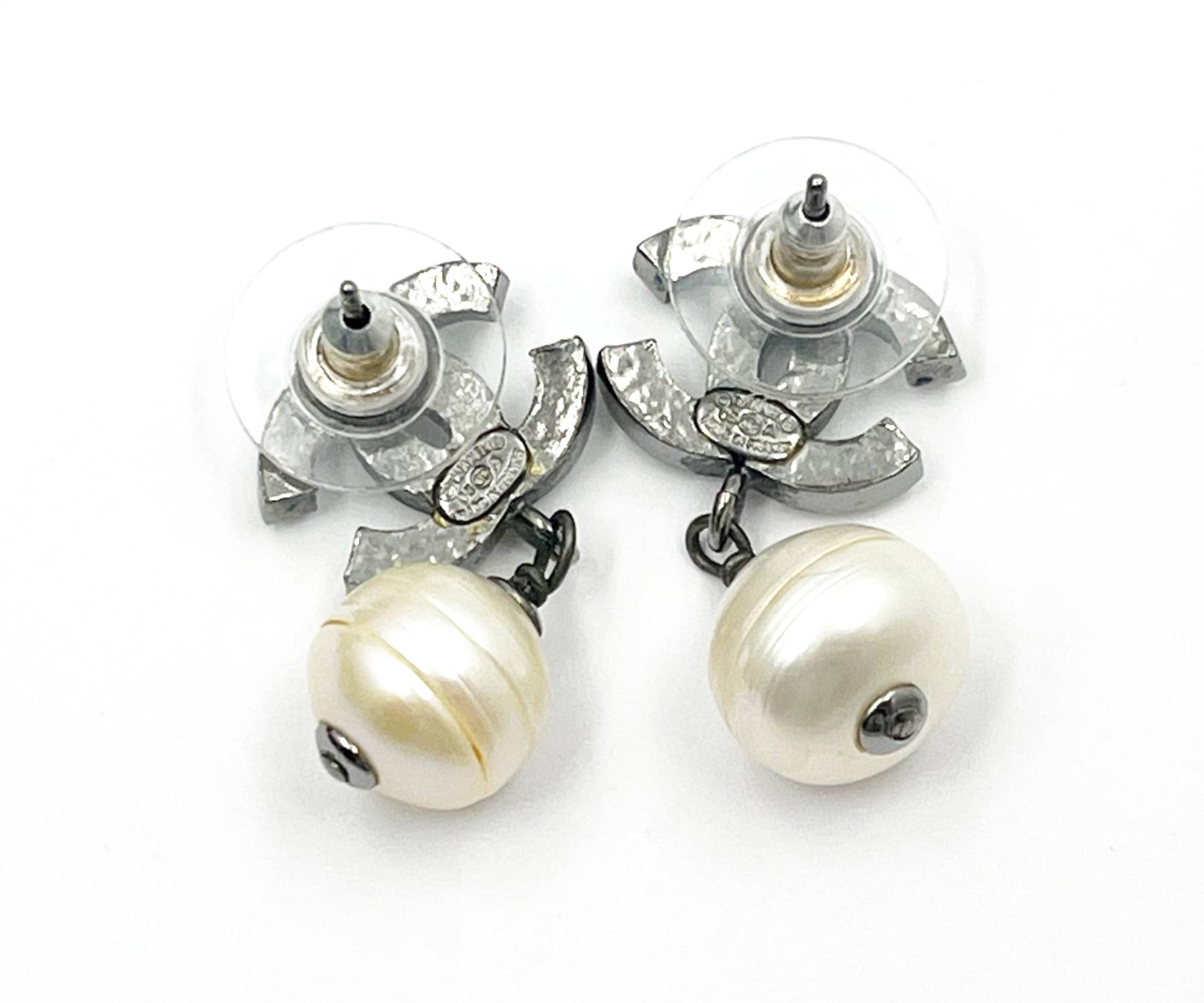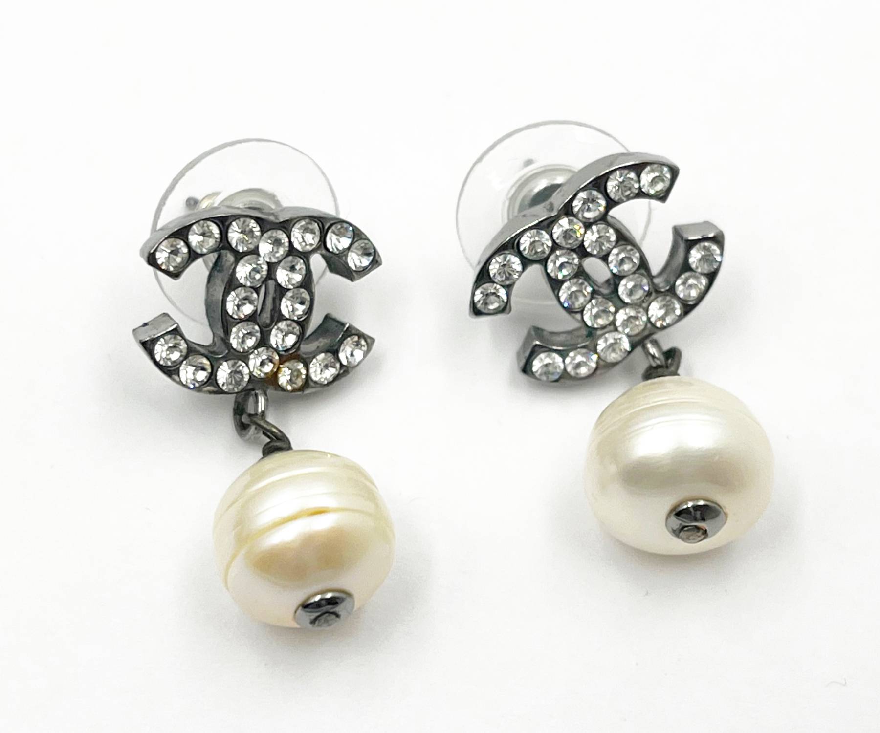 Chanel Small Gunmetal CC Crystal Faux Baroque Pearl Dangle Piercing Earrings
