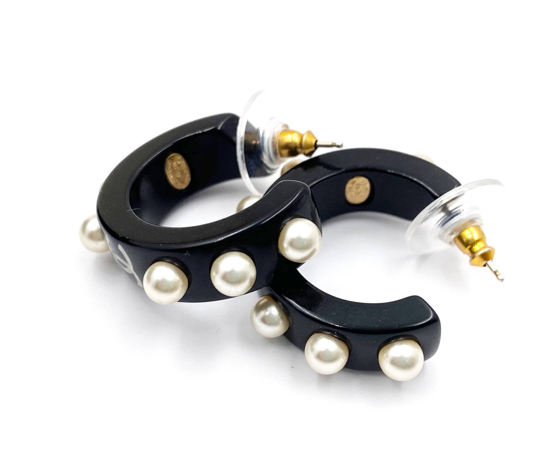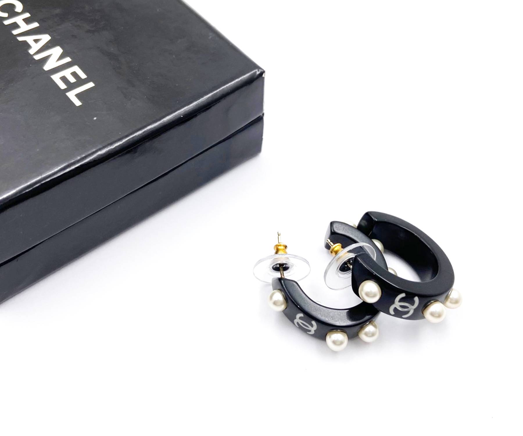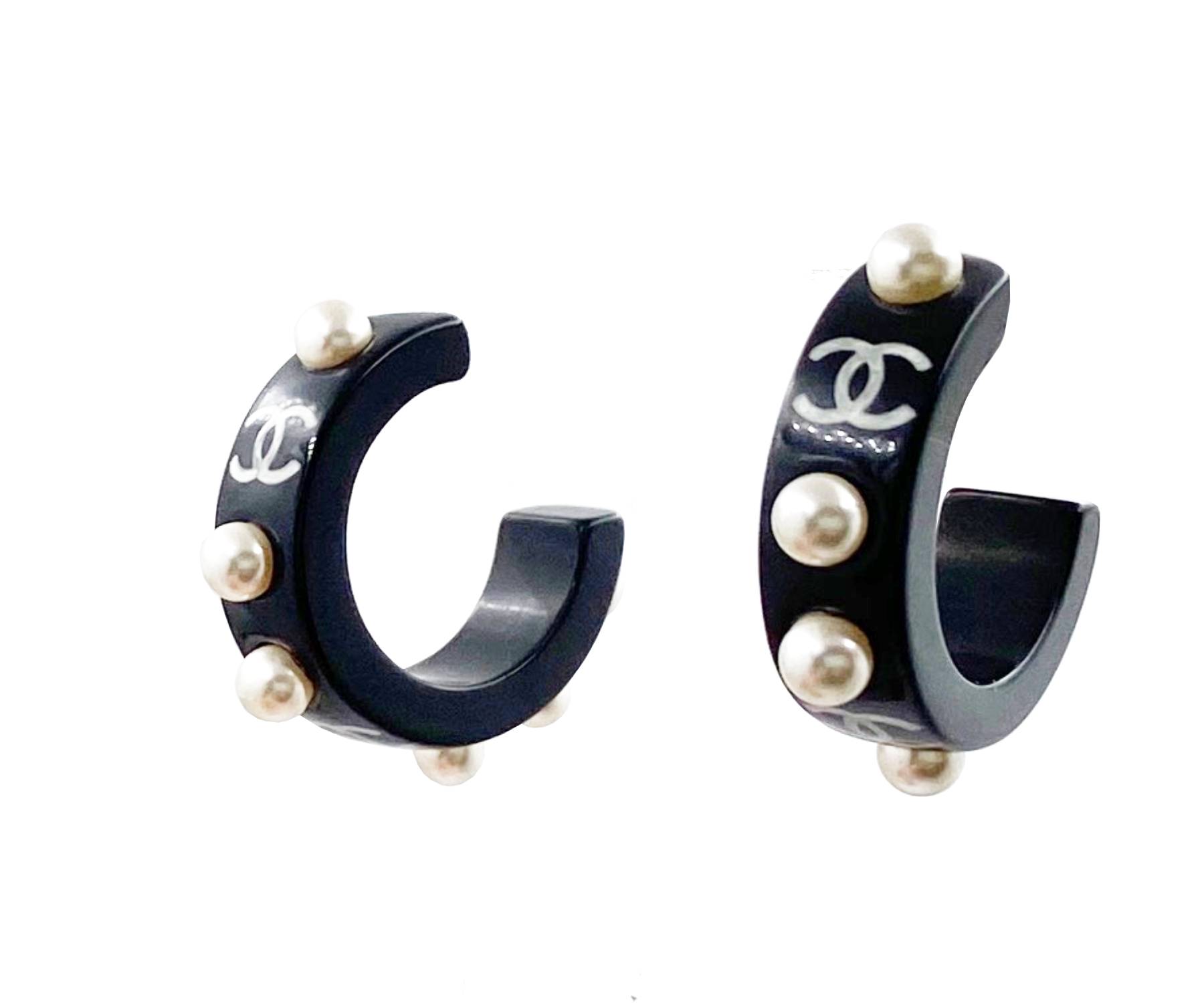 Chanel Vintage Gold CC Pearl Black Resin Hoop Piercing Earrings