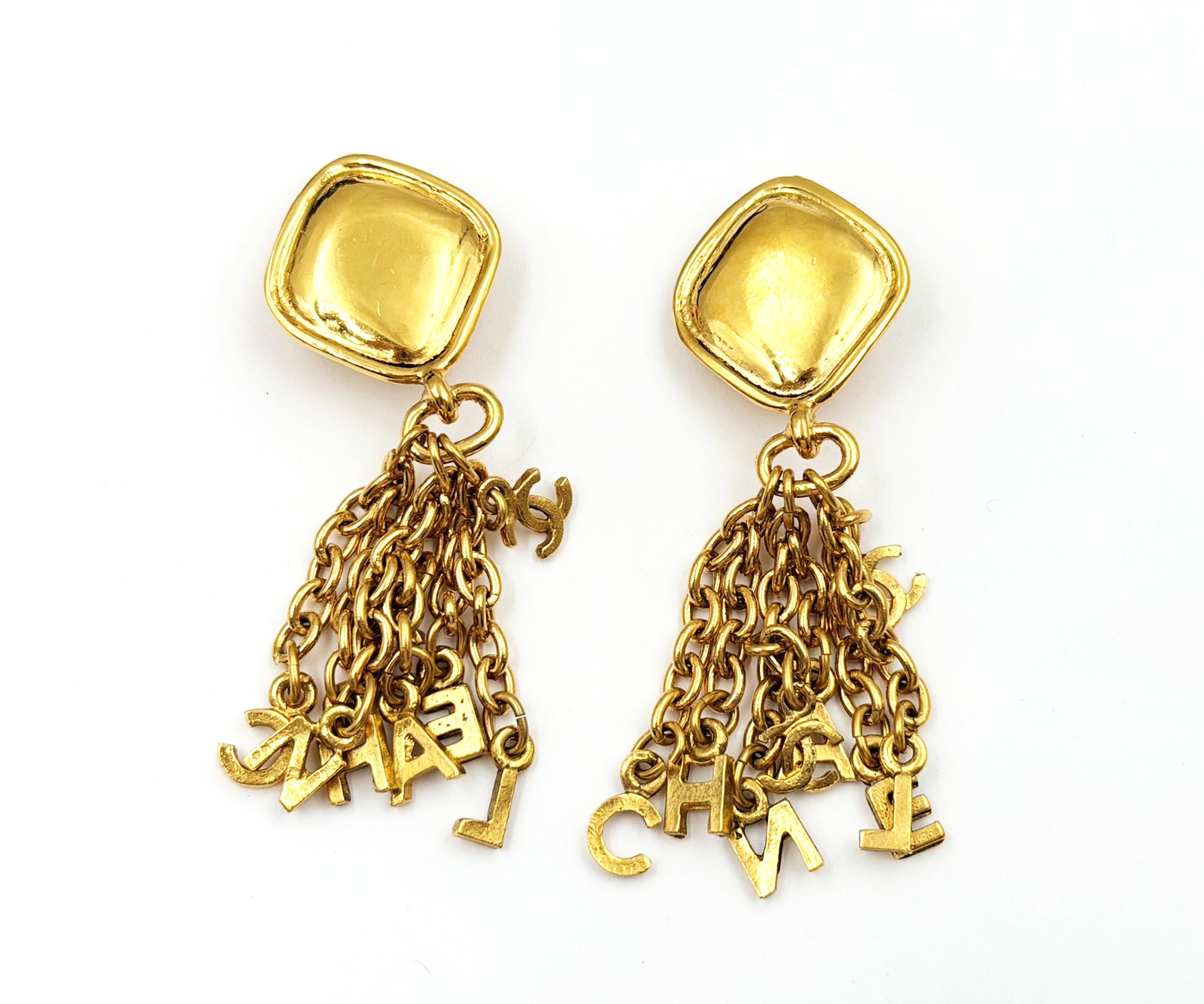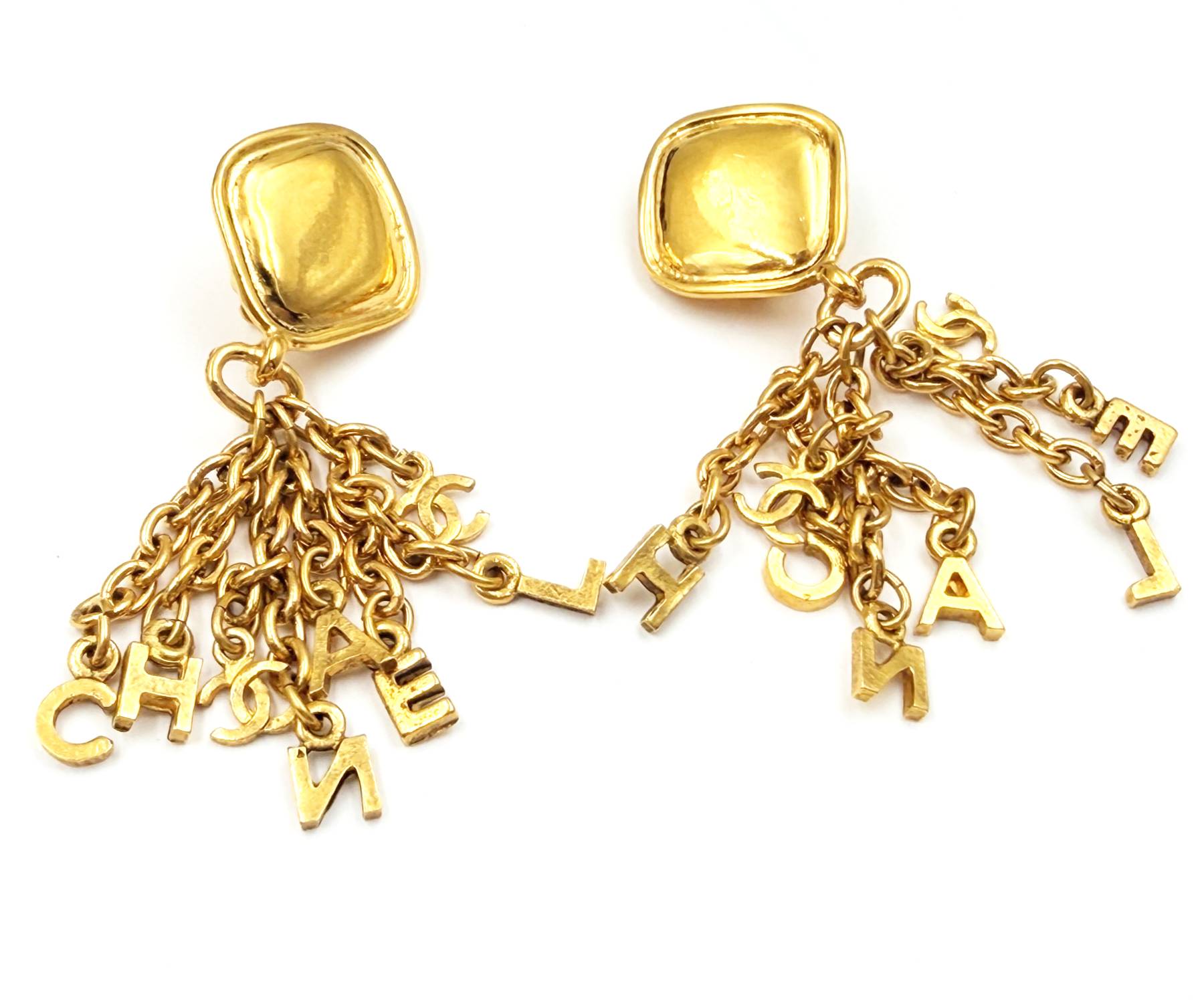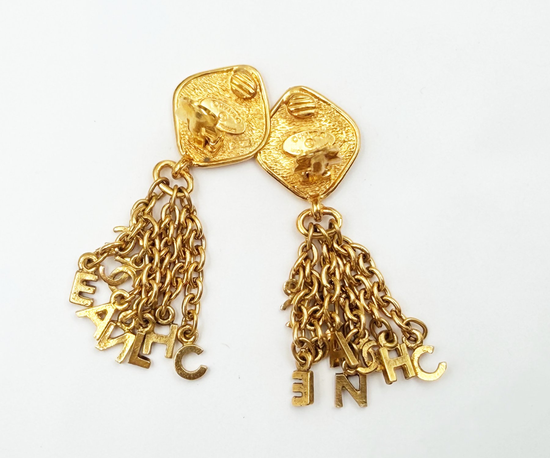 Chanel Vintage Gold Plated Argyle Letter Chain Dangle Clip on Earrings