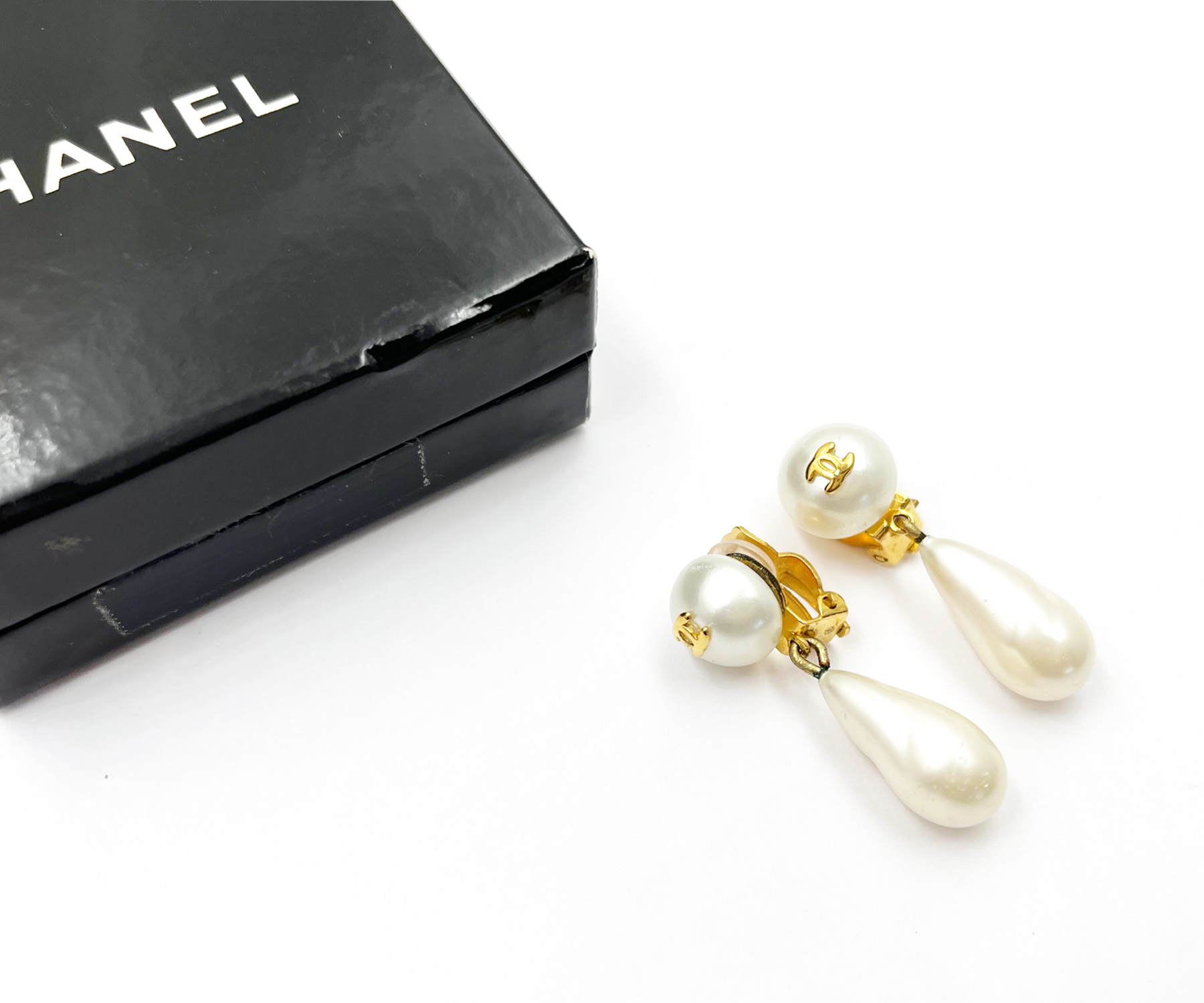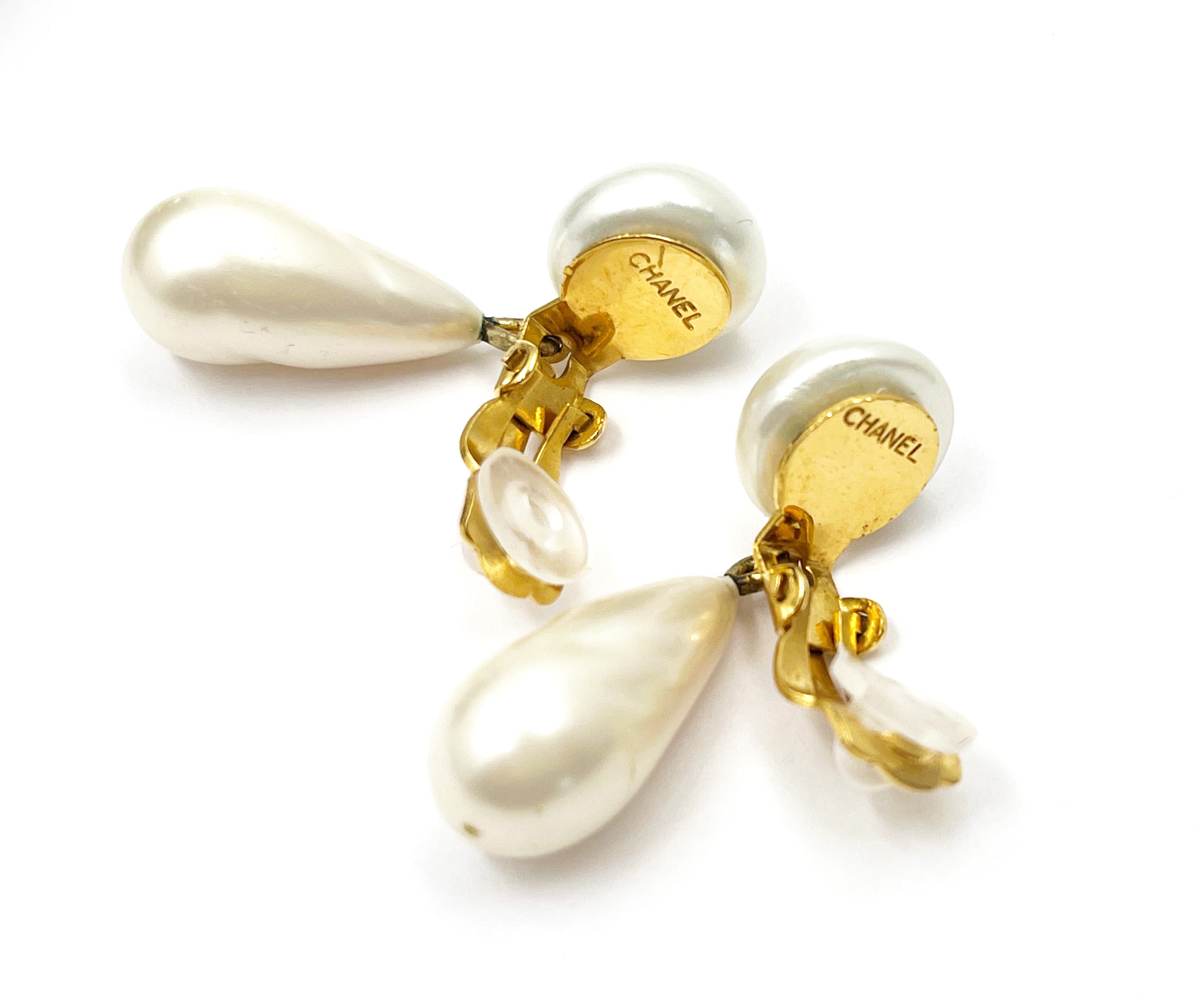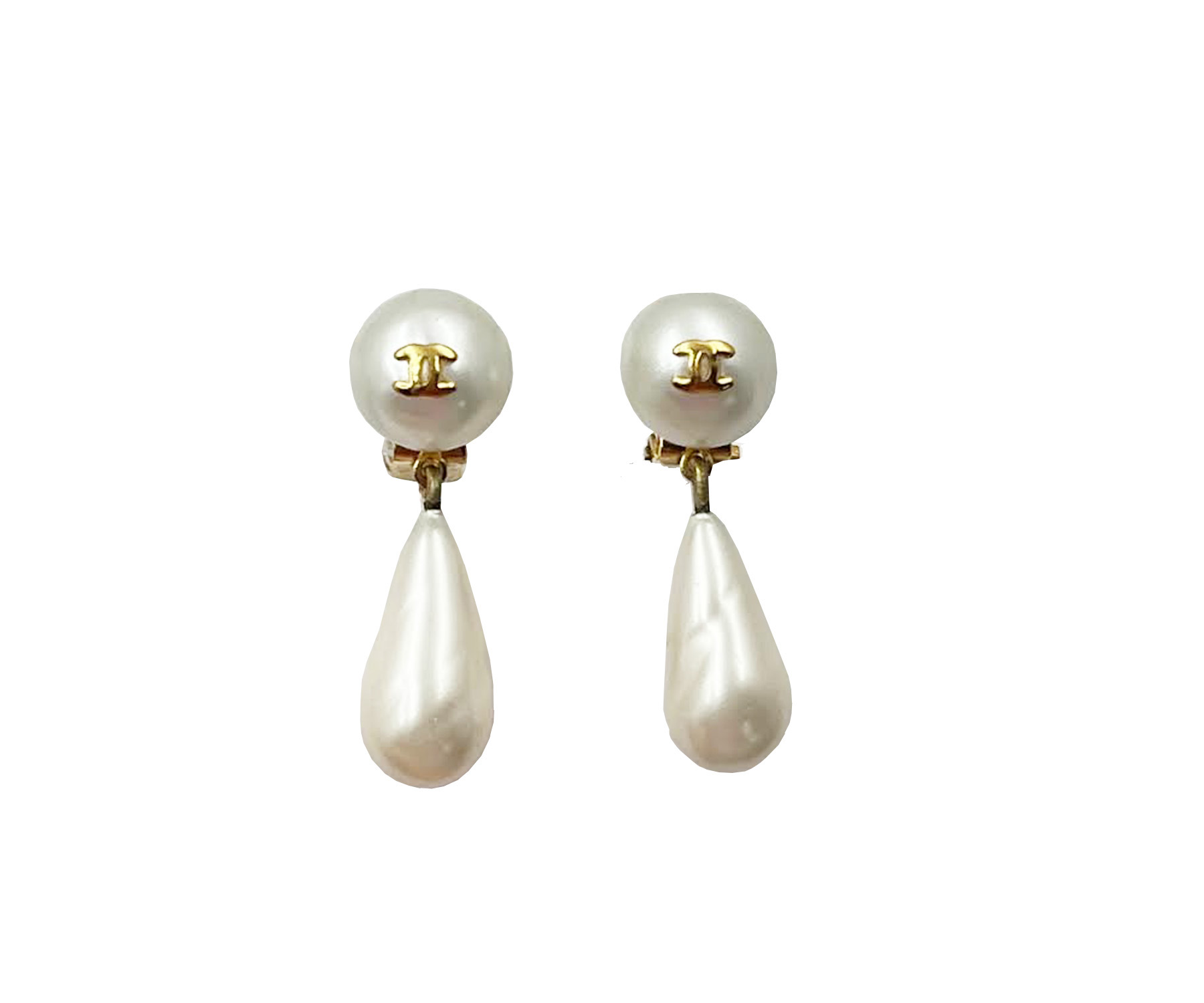 Chanel Vintage Gold Plated CC Faux Pearl Dangle Clip on Earrings