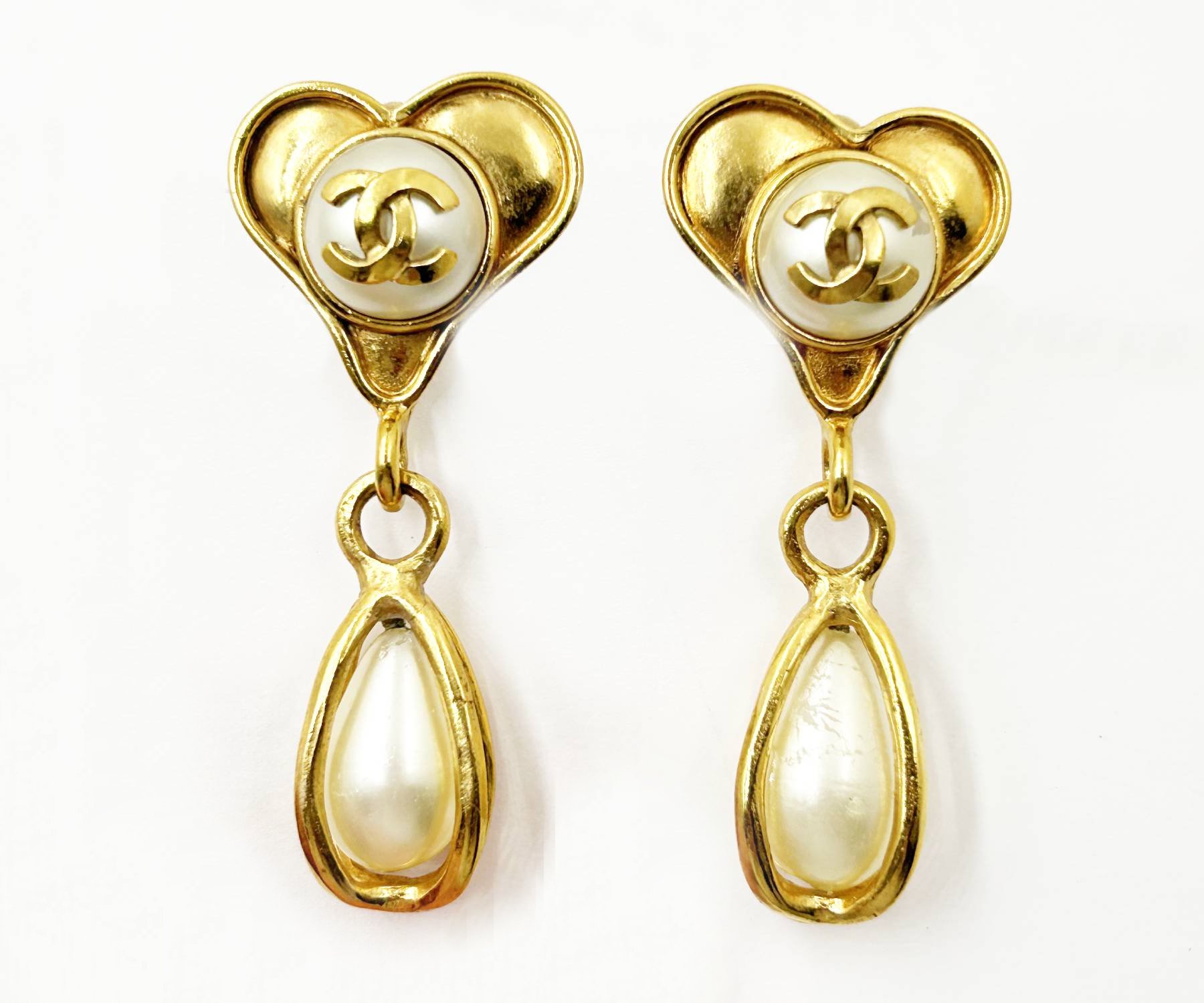 Chanel Vintage Gold Plated CC Heart Pearl Tear Drop Dangle Clip on Large Earrings