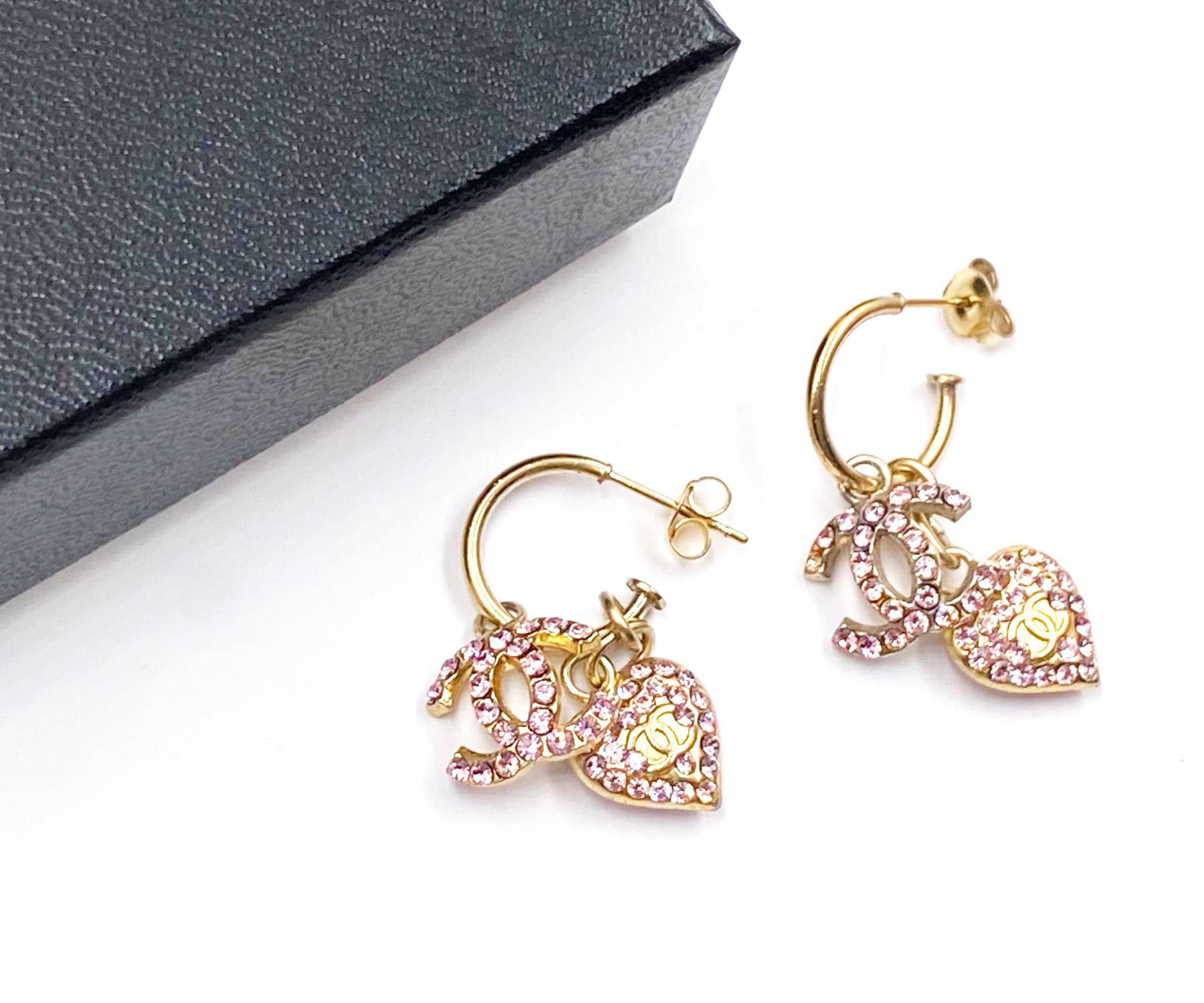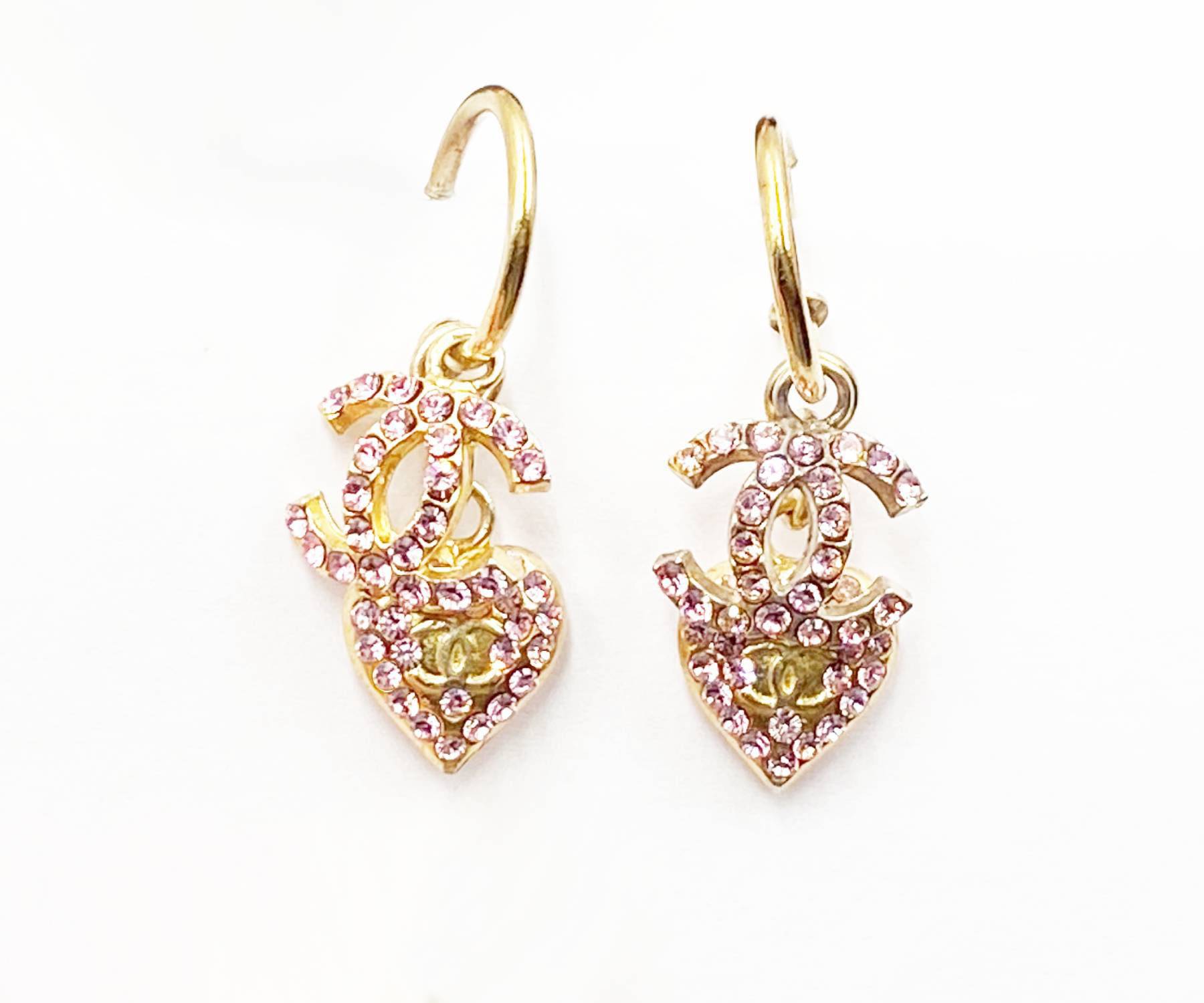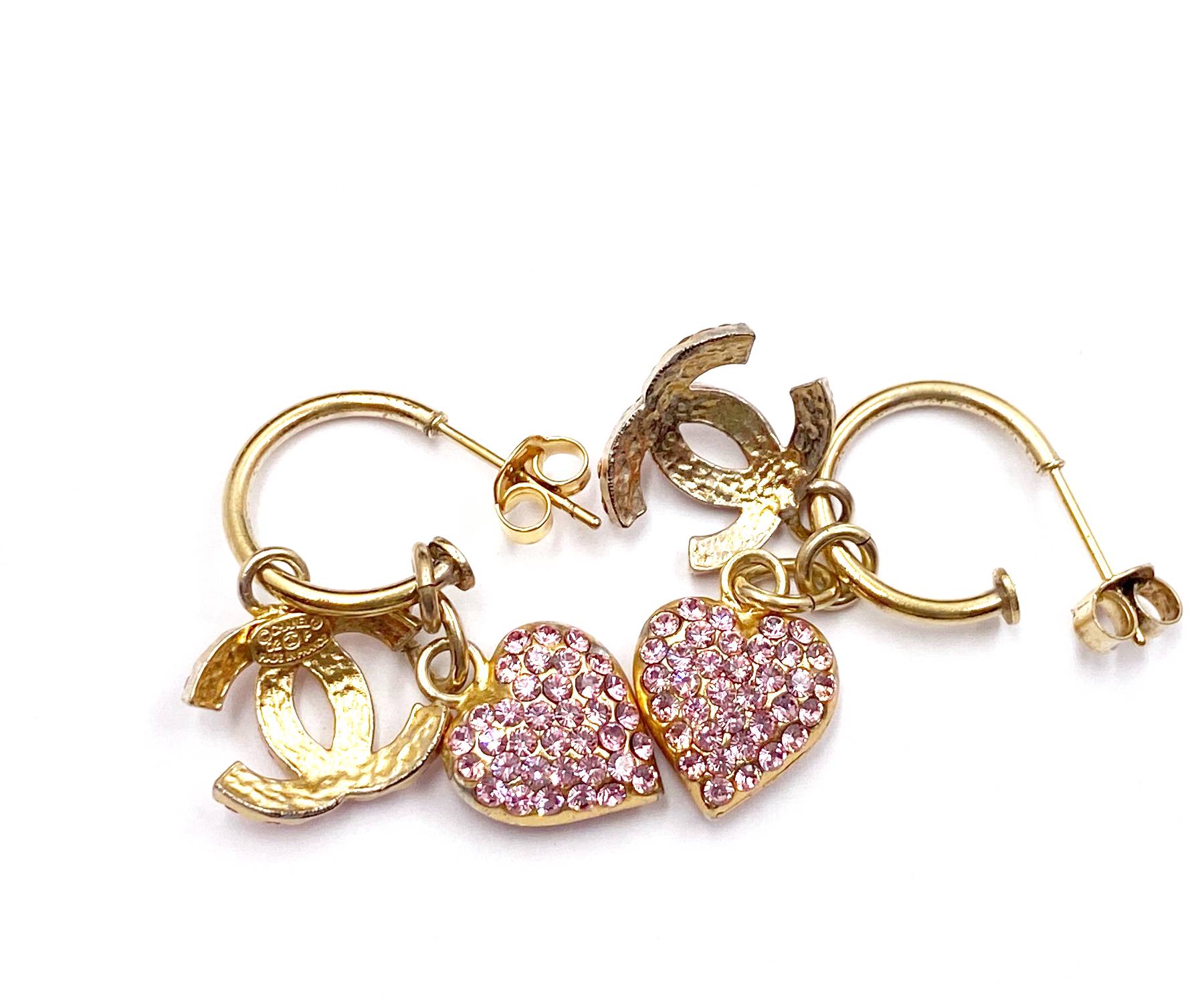 Chanel Vintage Gold Plated CC Pink Crystal Heart Hoop Piercing Earrings