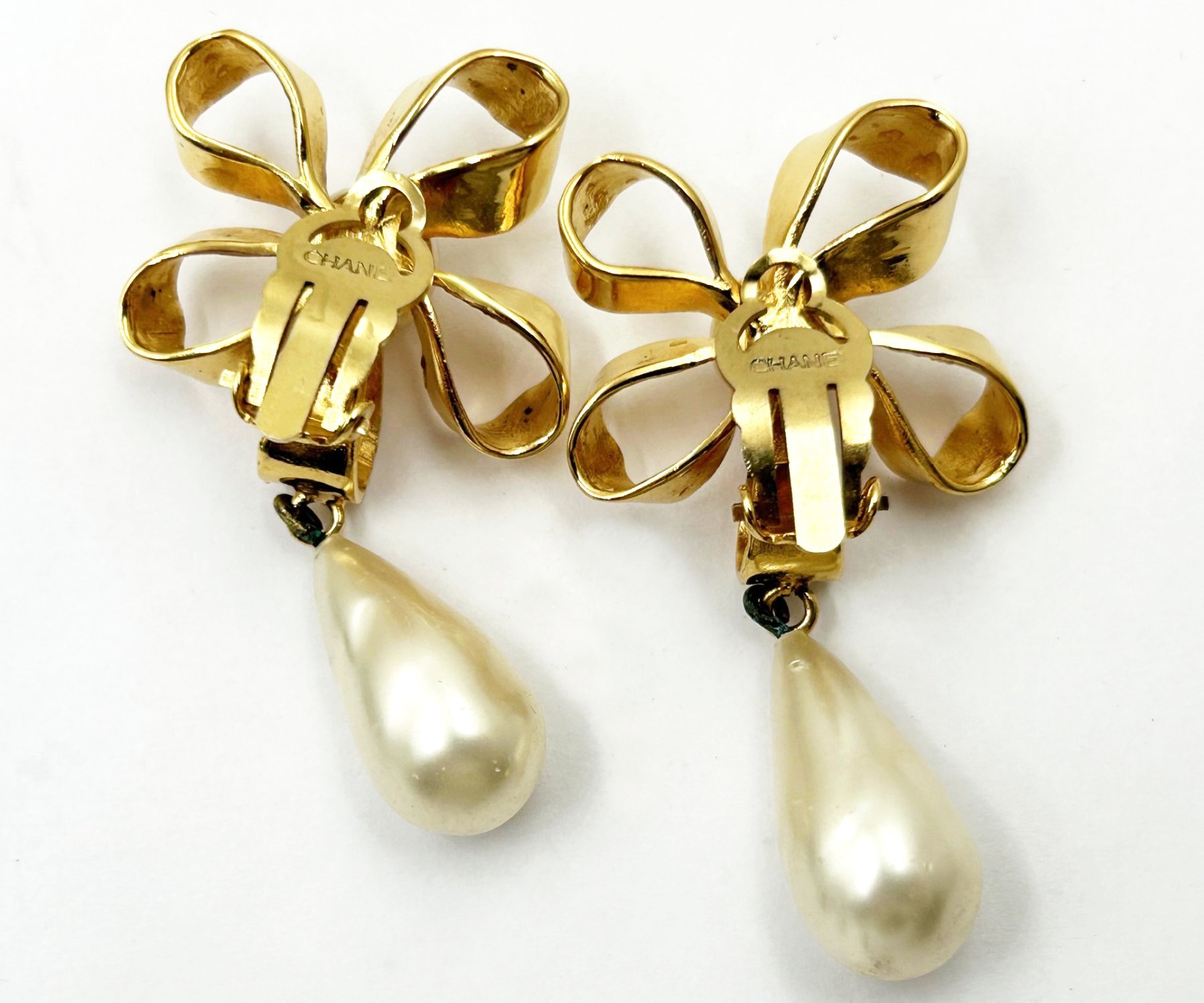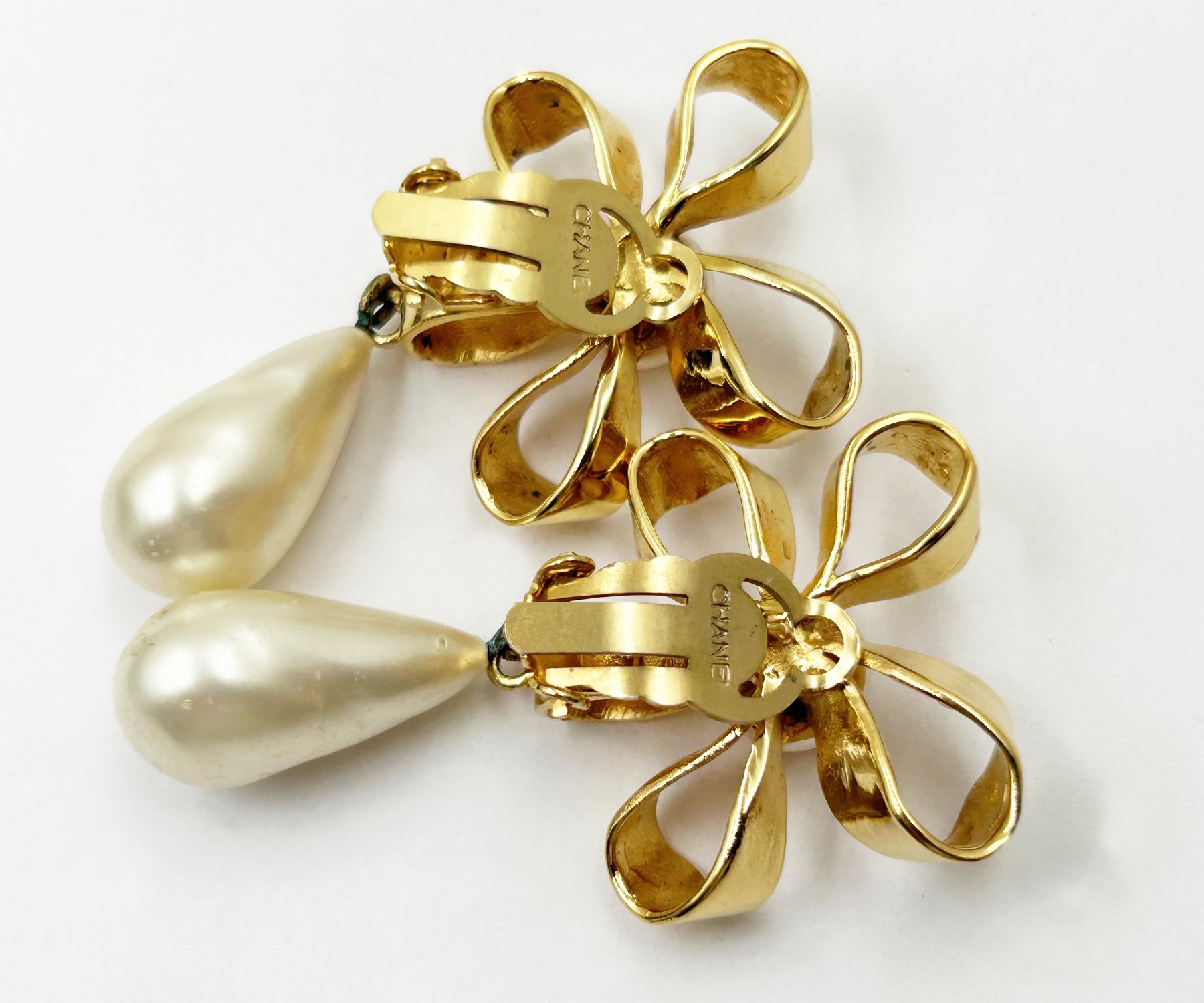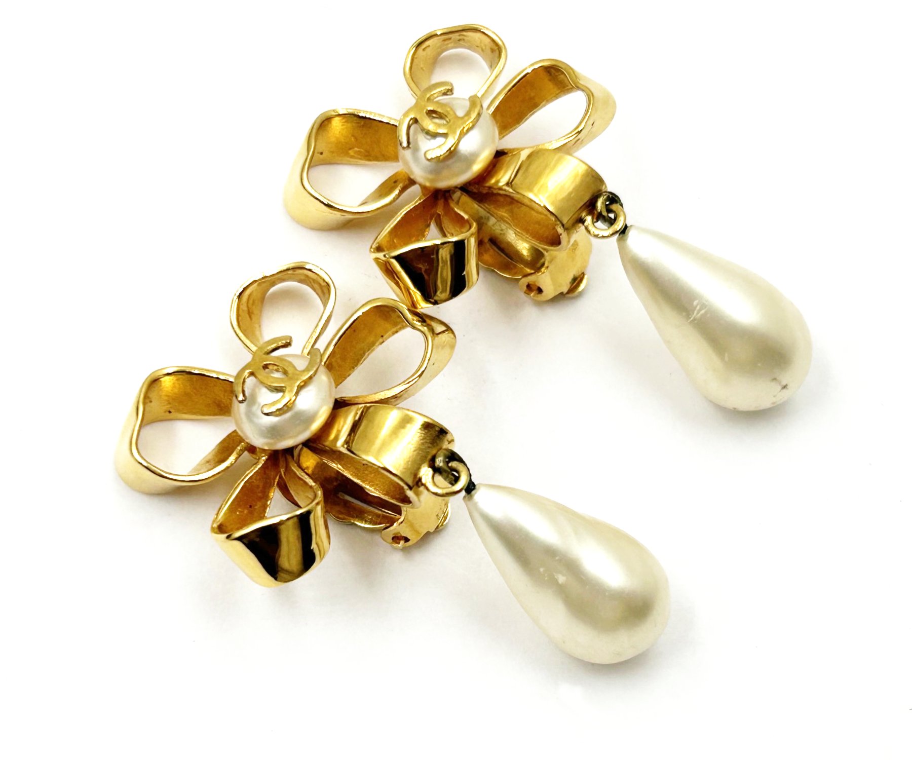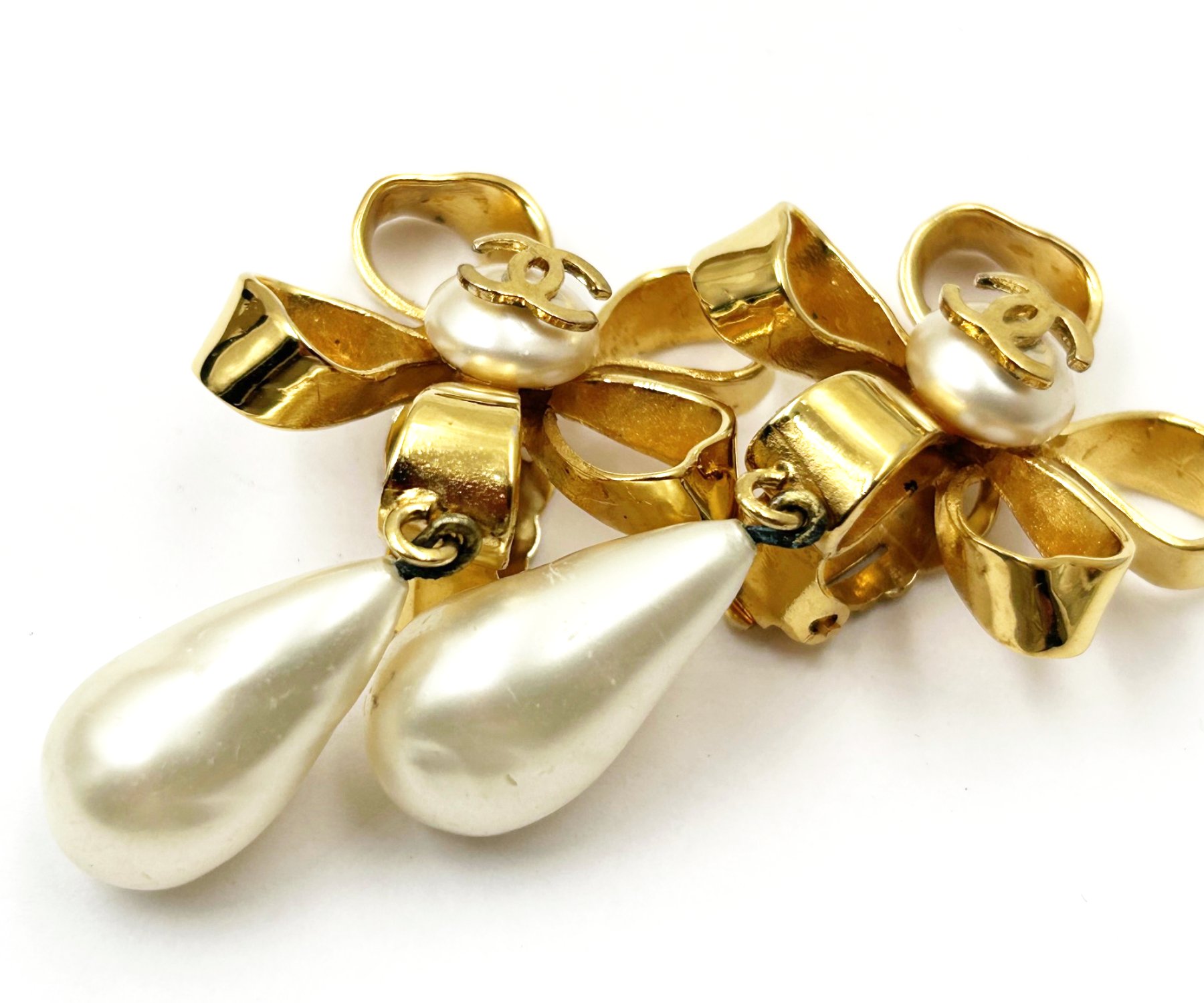 Chanel Vintage Gold Plated CC Ribbon Flower Pearl Dangle Clip on Earrings