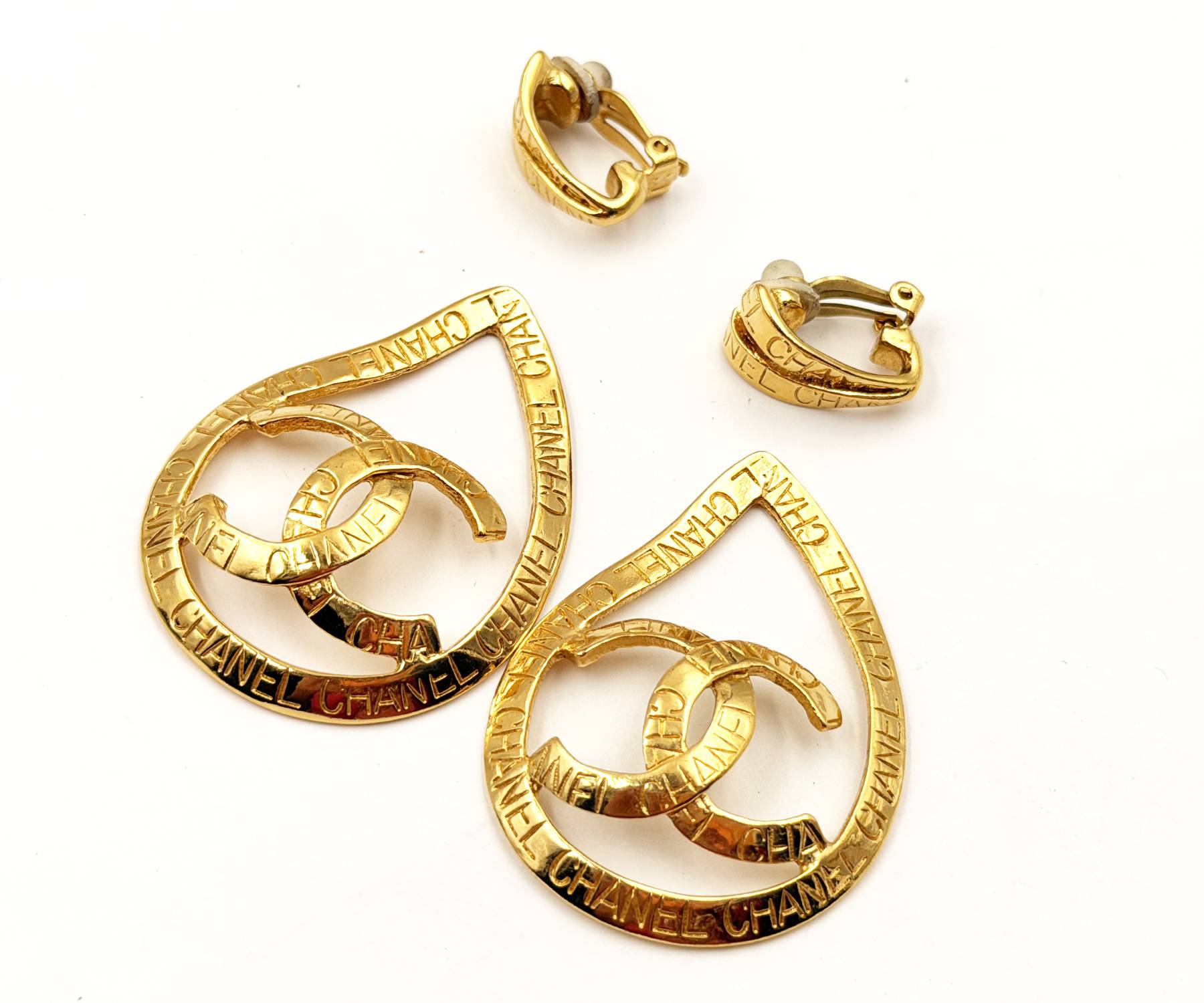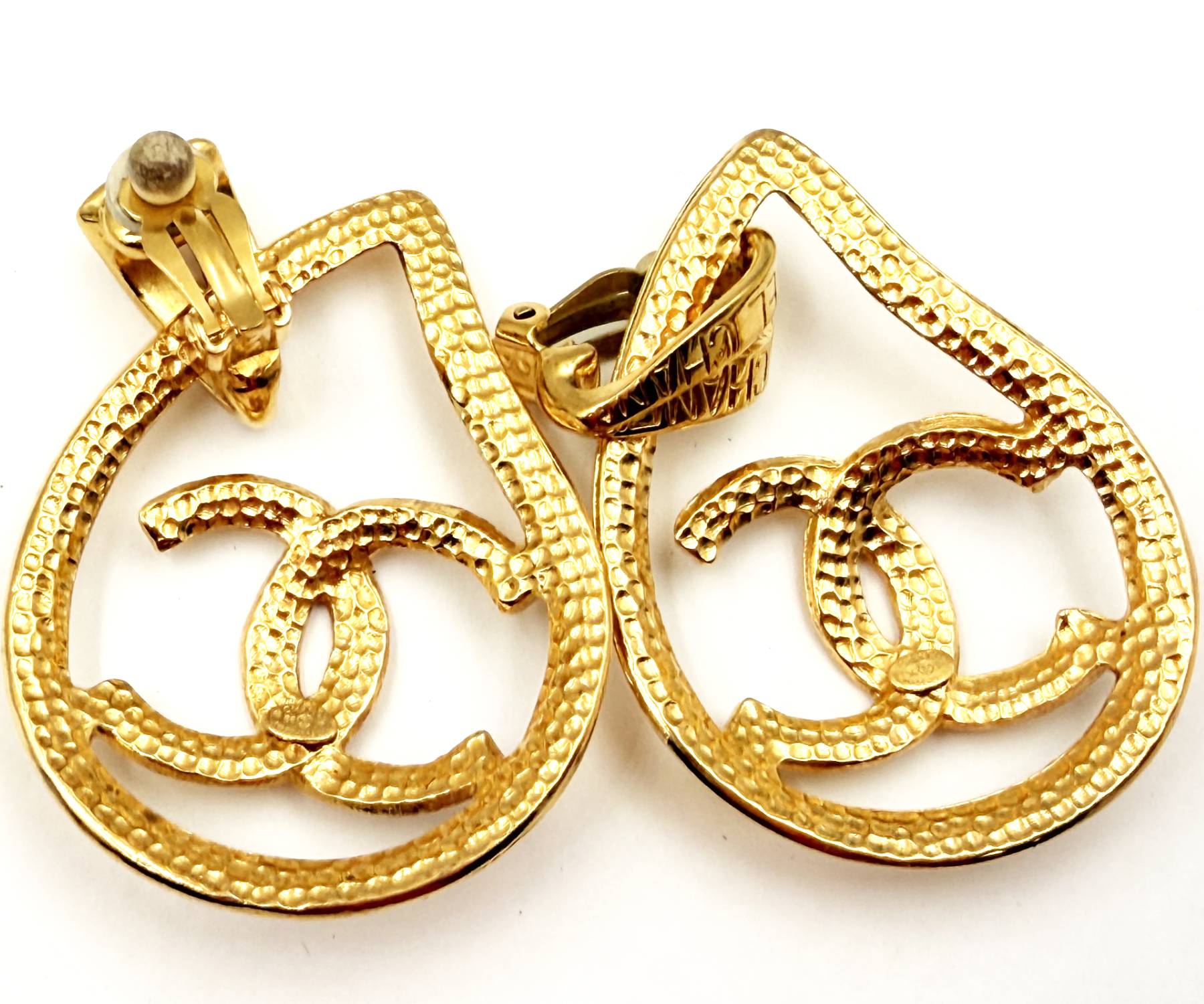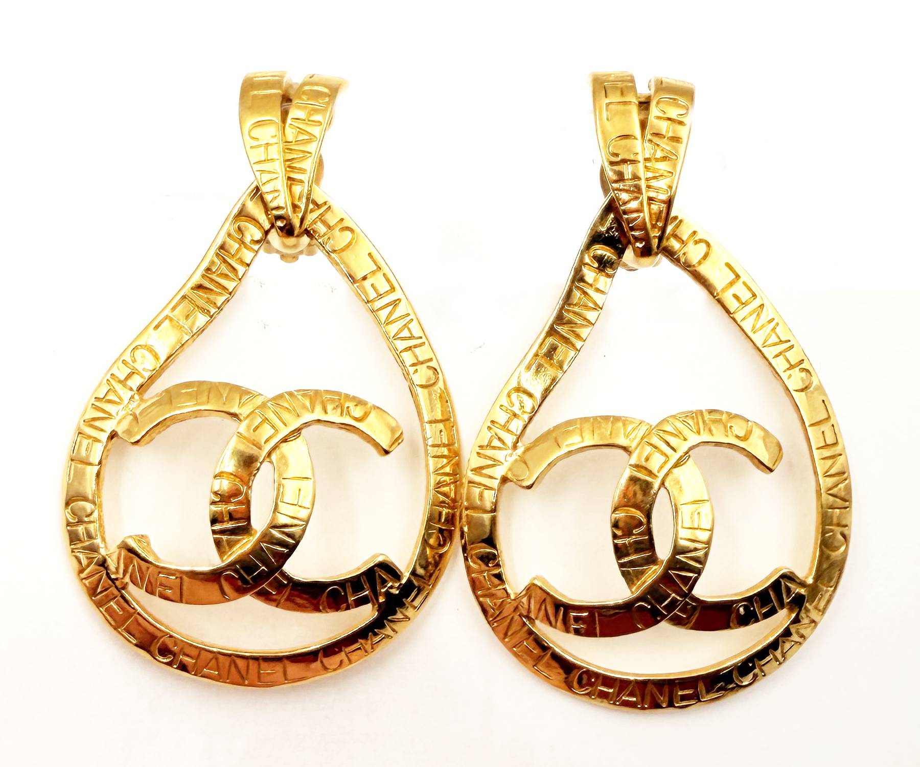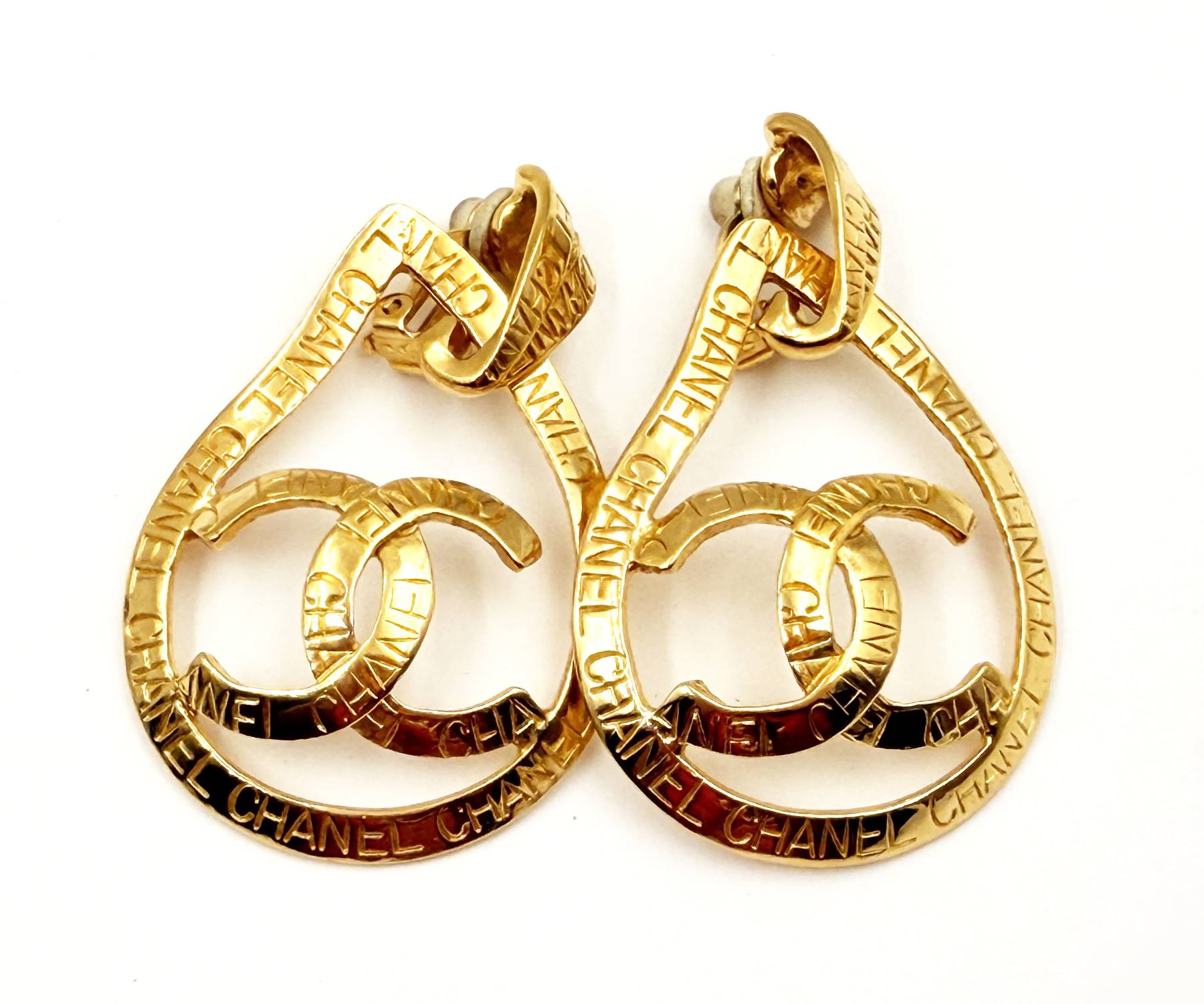 Chanel Vintage Gold Plated CC Ribbon Tear Drop Ribbon Large 2 in 1 Clip on Earrings