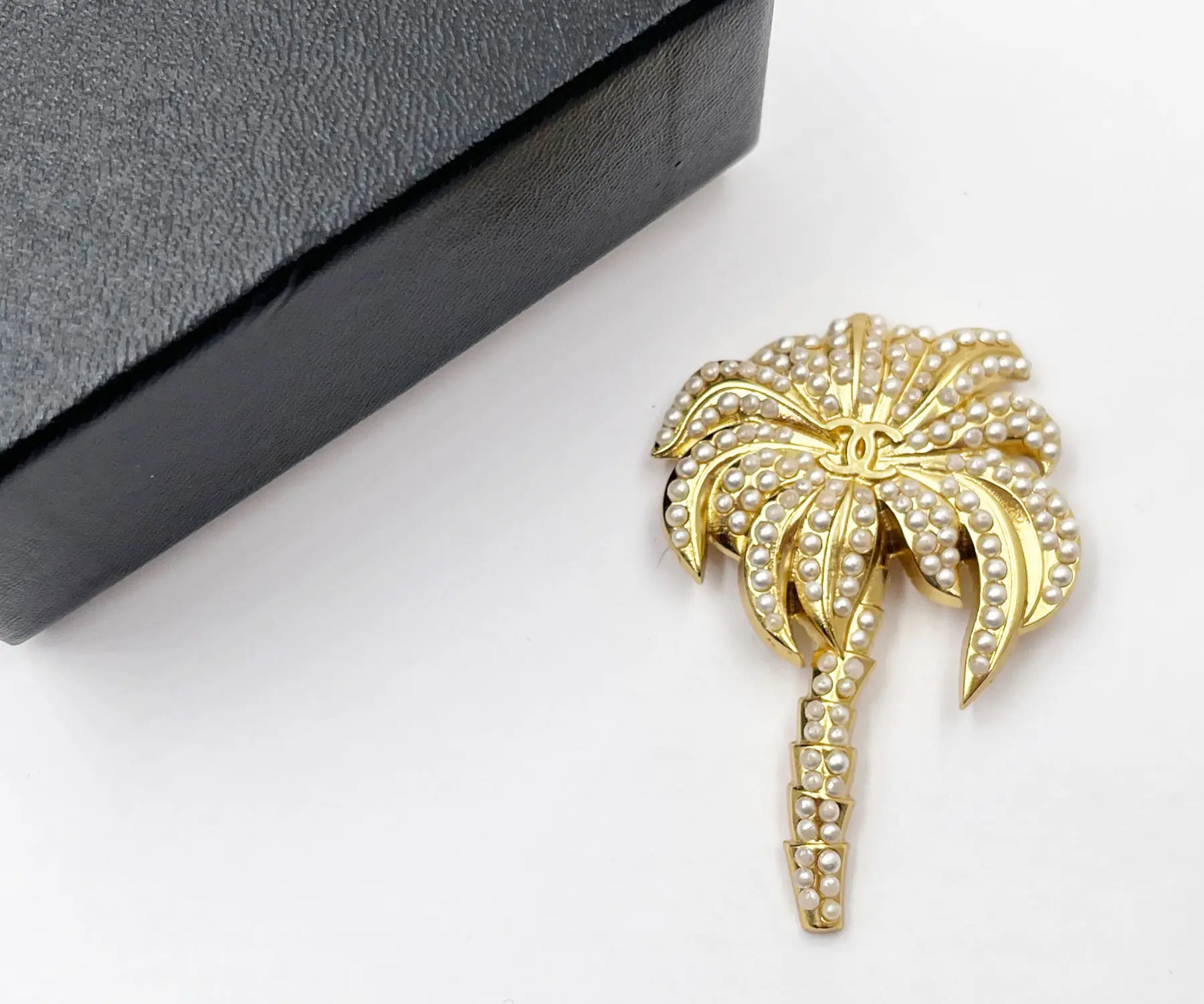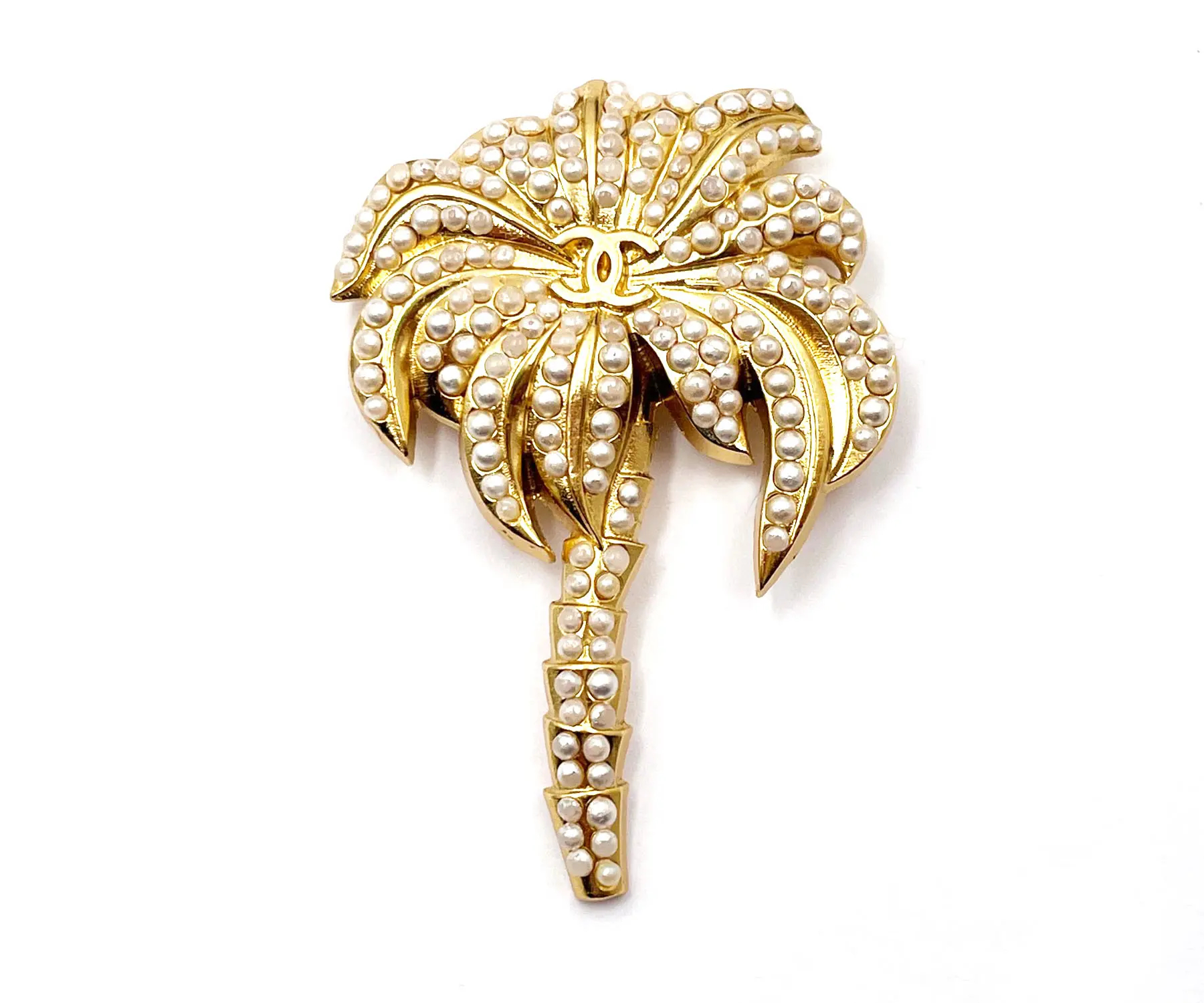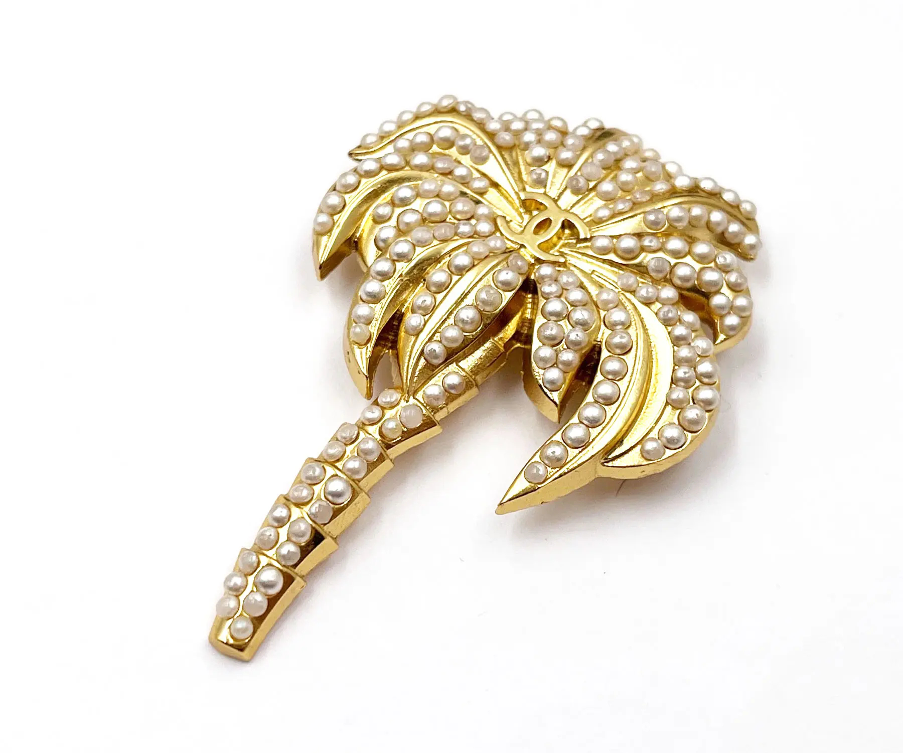 Chanel Vintage Gold Plated CC Seed Pearl Palm Tree Large Brooch