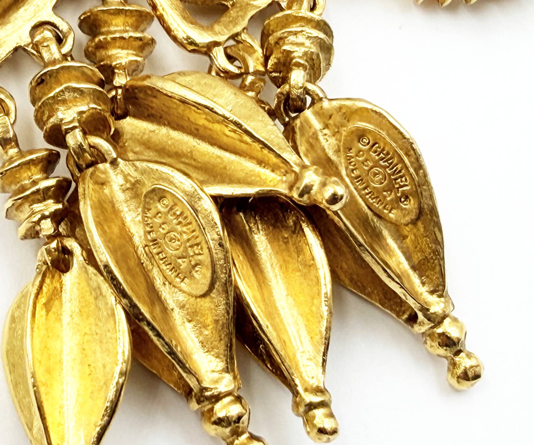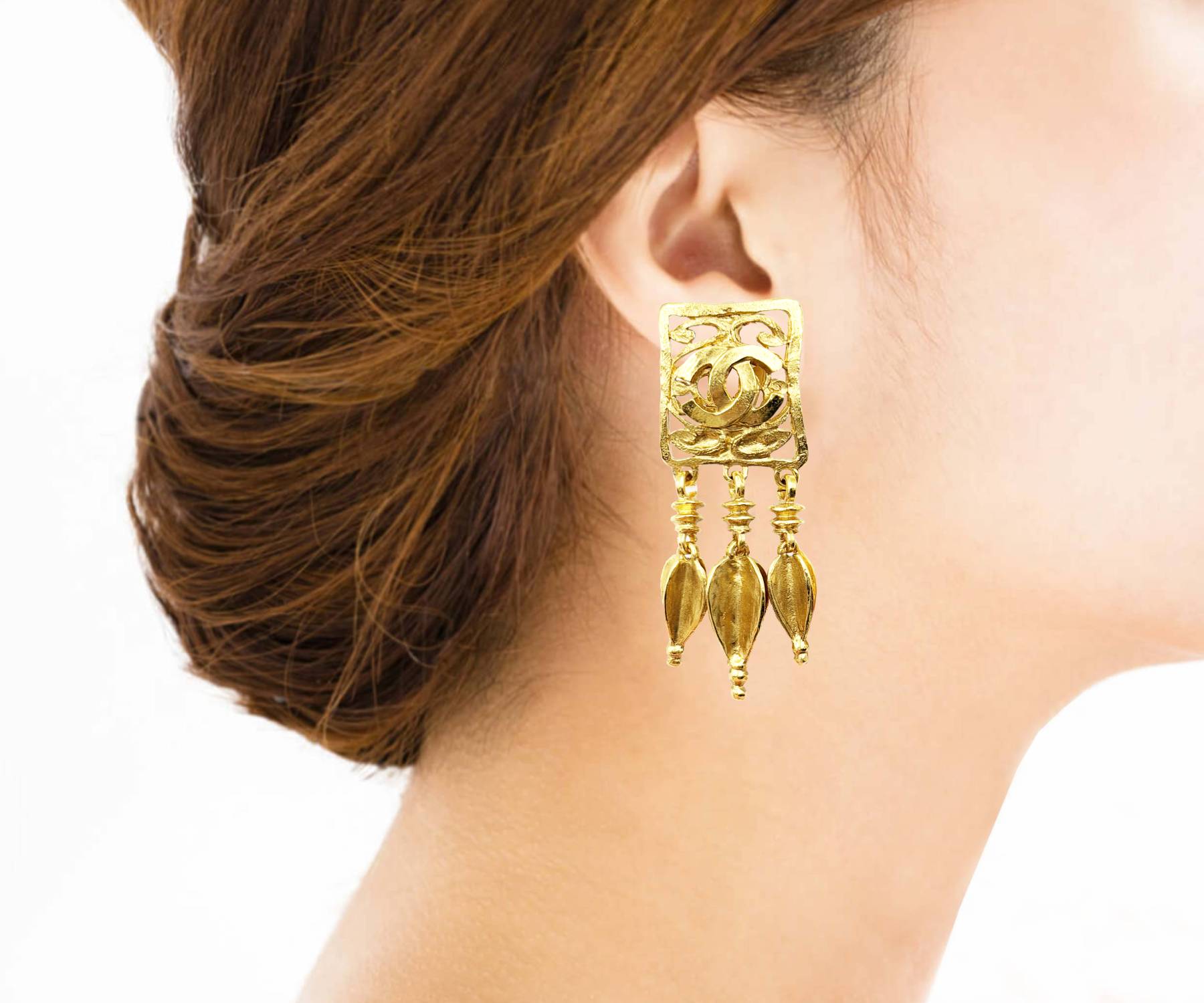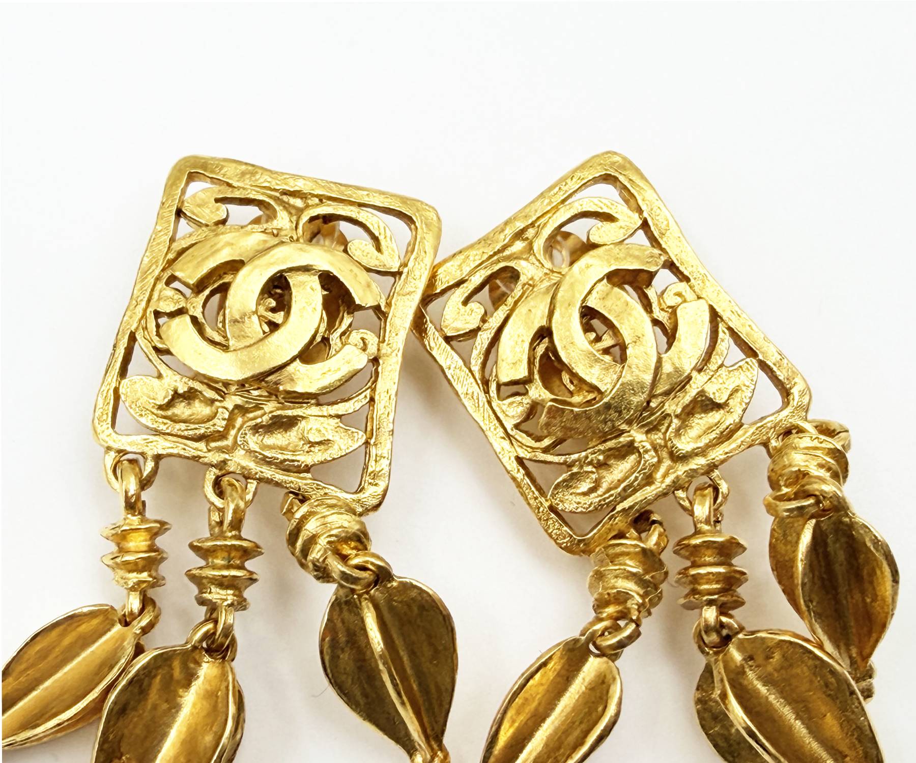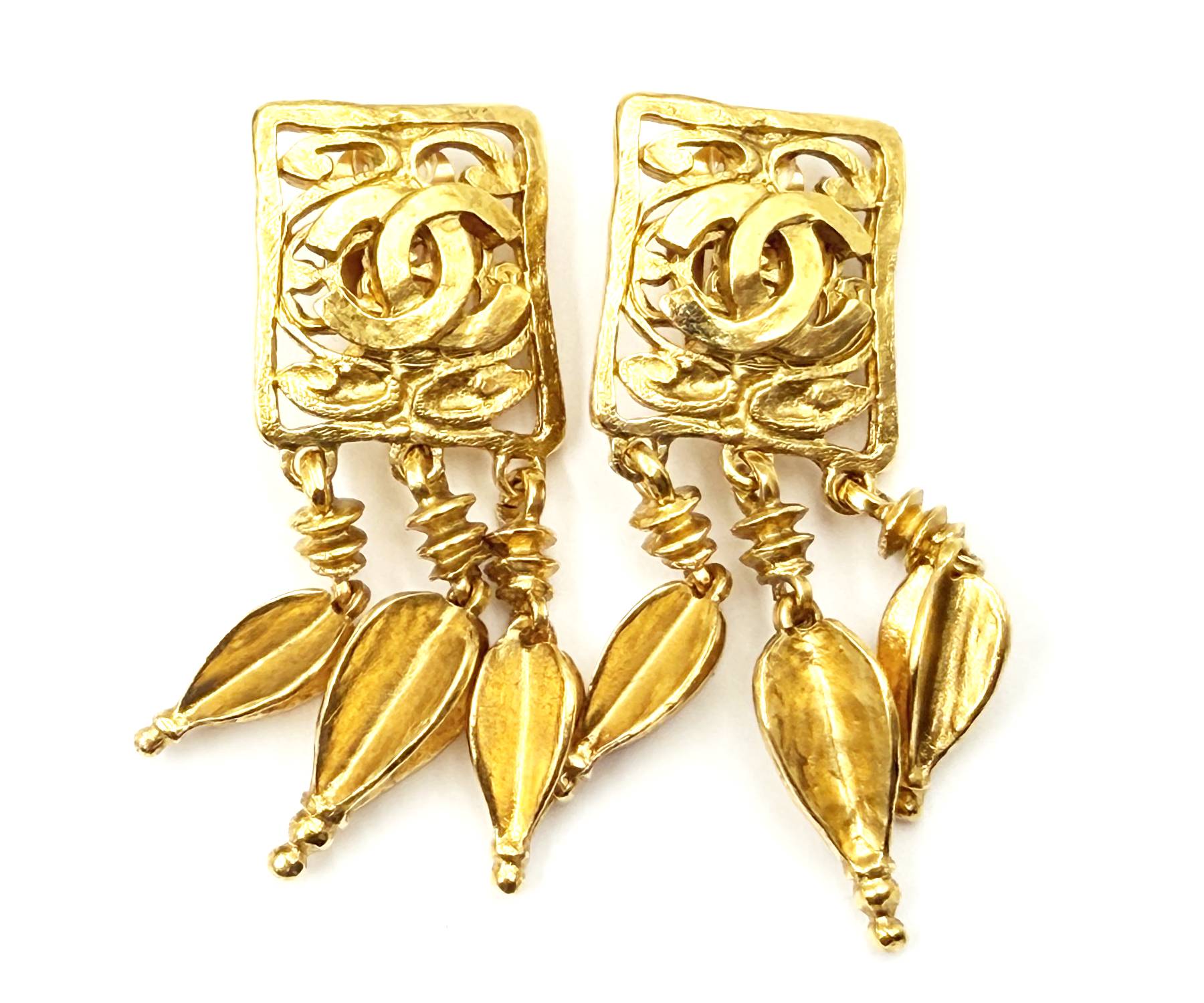 Chanel Vintage Gold Plated CC Square Filigree Spear Dangle Clip on Earrings