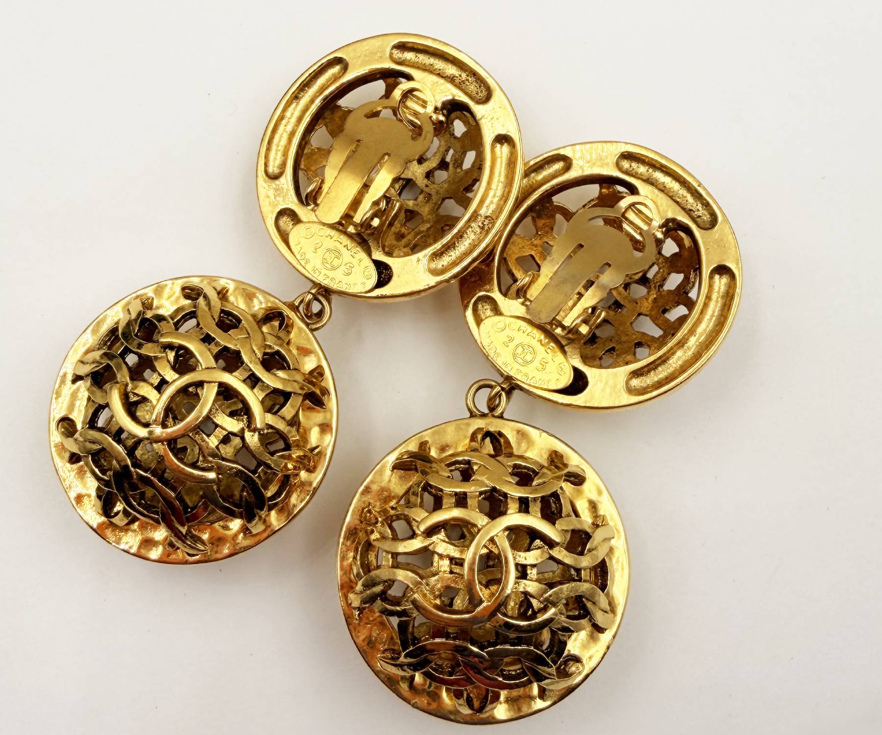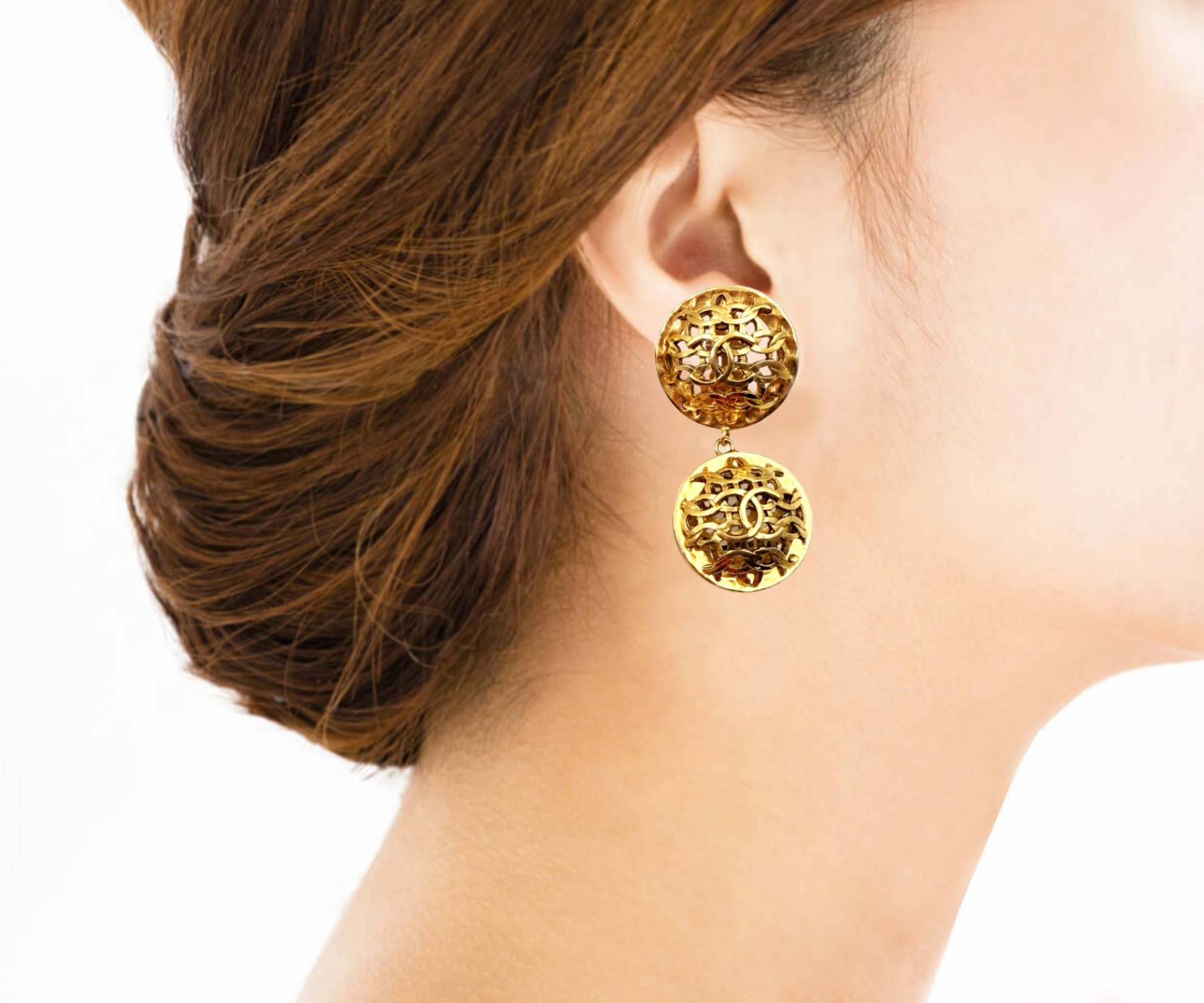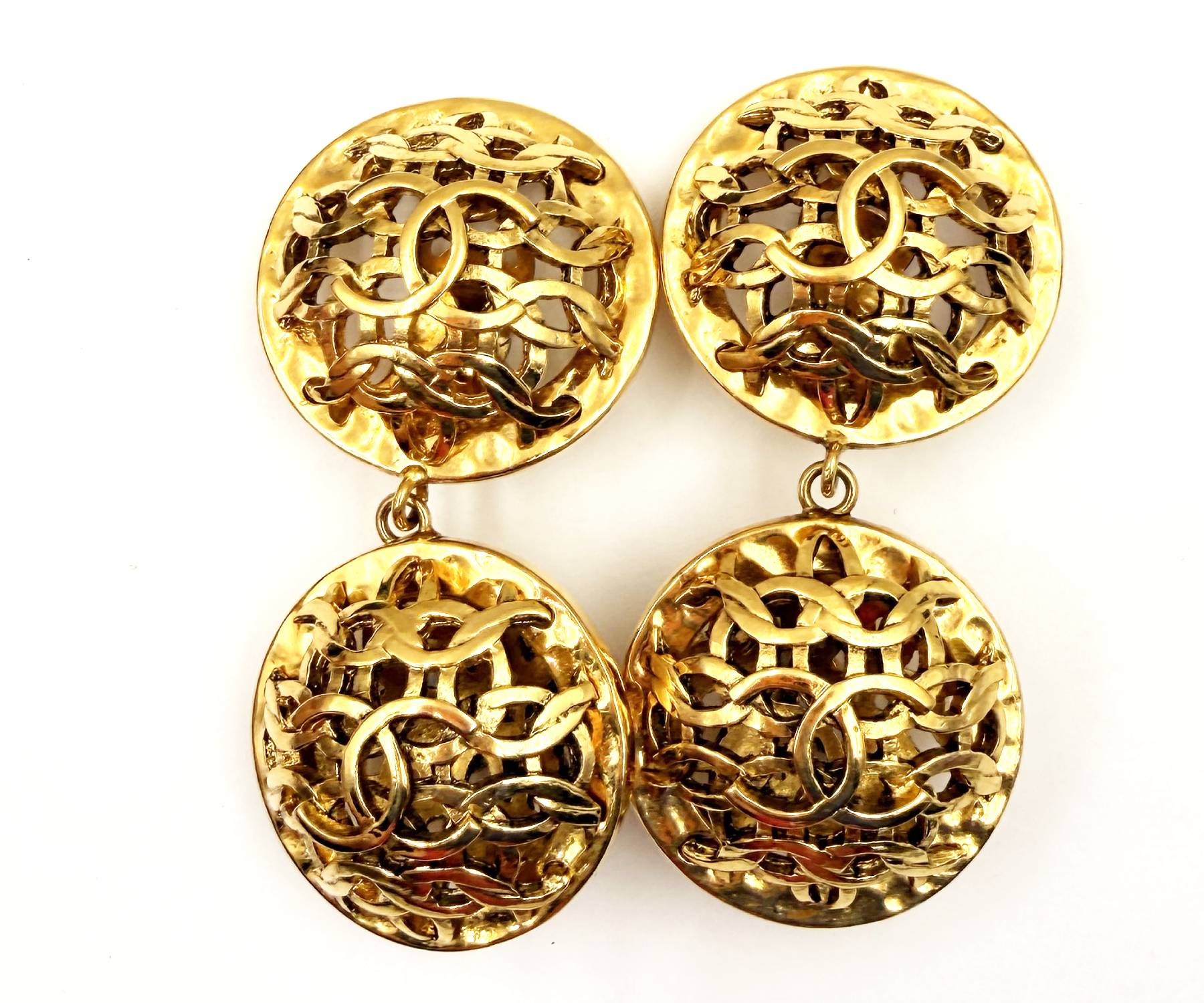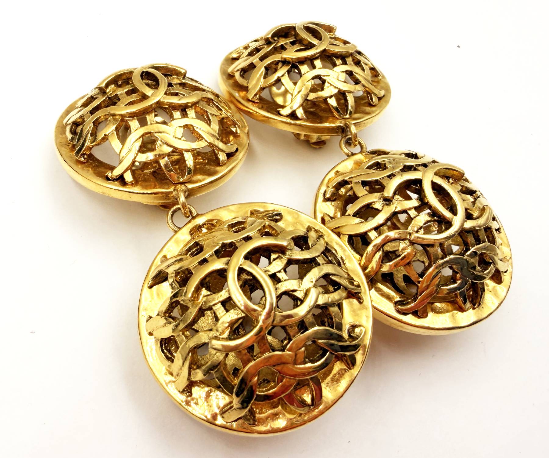 Chanel Vintage Gold Plated CC Weaving Round Dangle Large Clip on Earrings